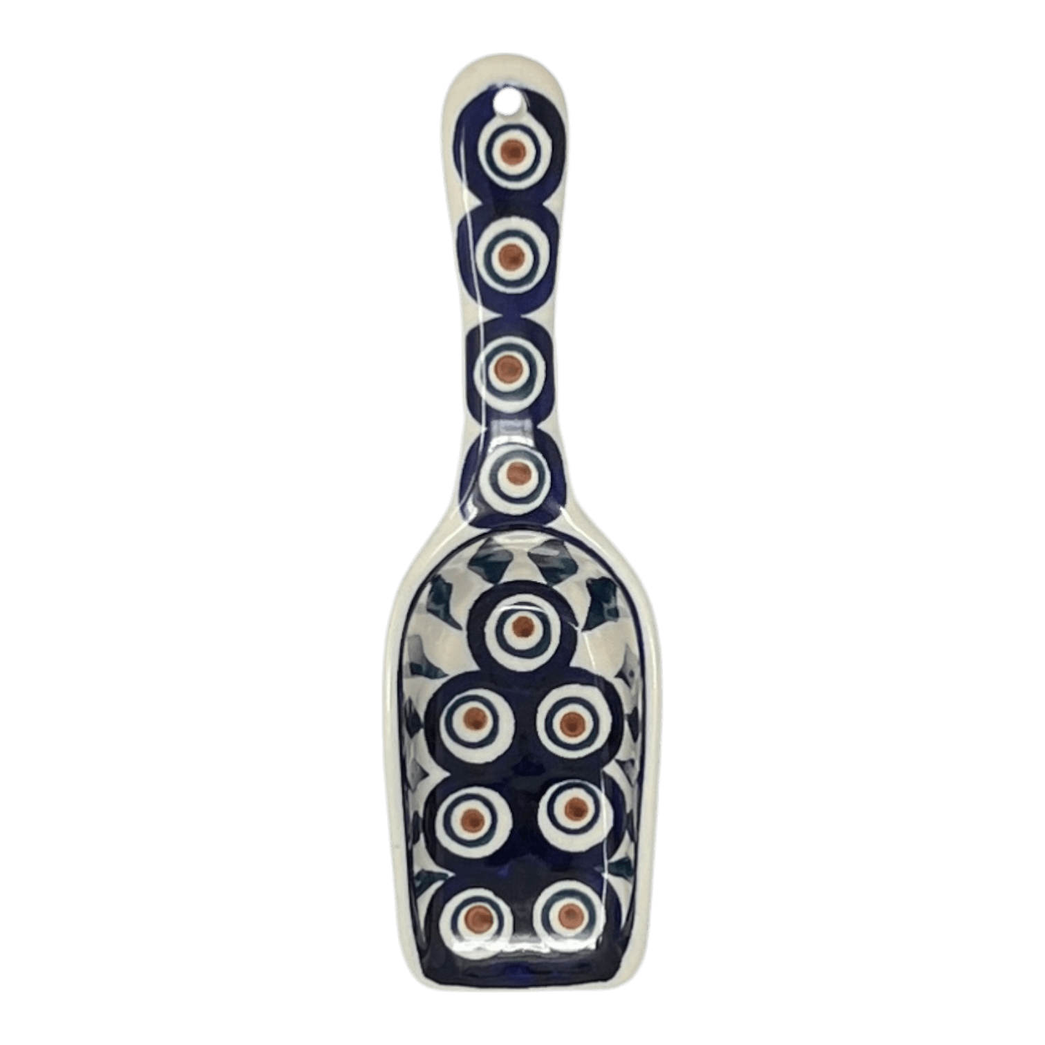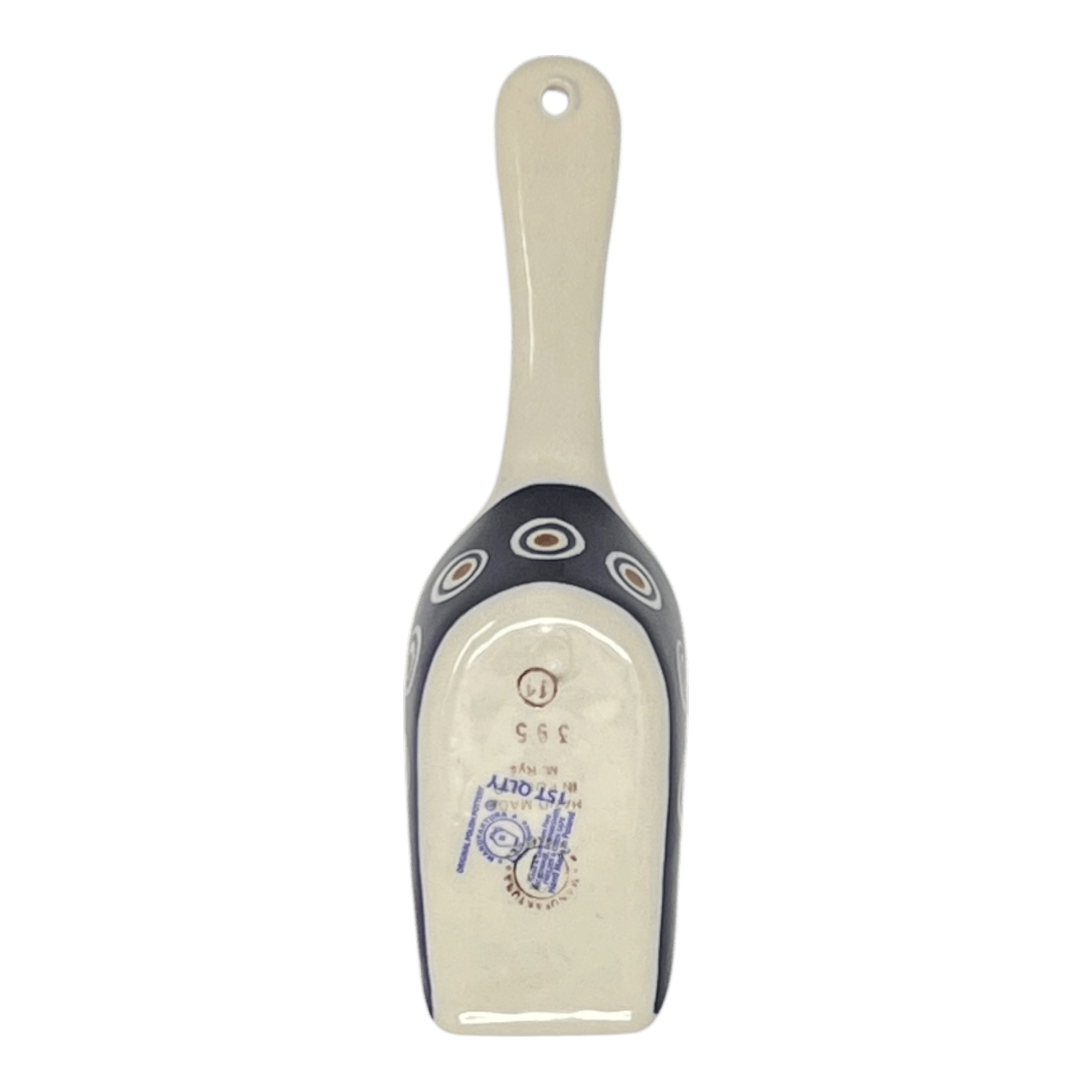 Step into the enchanting world of traditional Polish artistry with the exquisite Manufaktura Polish Pottery Scoop, adorned with the vibrant "Peacock" pattern. This 7-inch marvel is not just a utensil but a piece of art, perfect for measuring coffee, flour, or sugar. Its design features a mesmerizing array of peacock feathers in rich hues of blue, accented with splashes of green, white, and brown. The central motif showcases a burst of peacock circles set against a soothing blue background, with large teal green petals unfurling towards the edges against a crisp white canvas. Each scoop is a testament to the celebrated craftsmanship of Boleslawiec, Poland, where skilled artisans hand-paint each piece using the traditional "punching" technique of hand stamping.