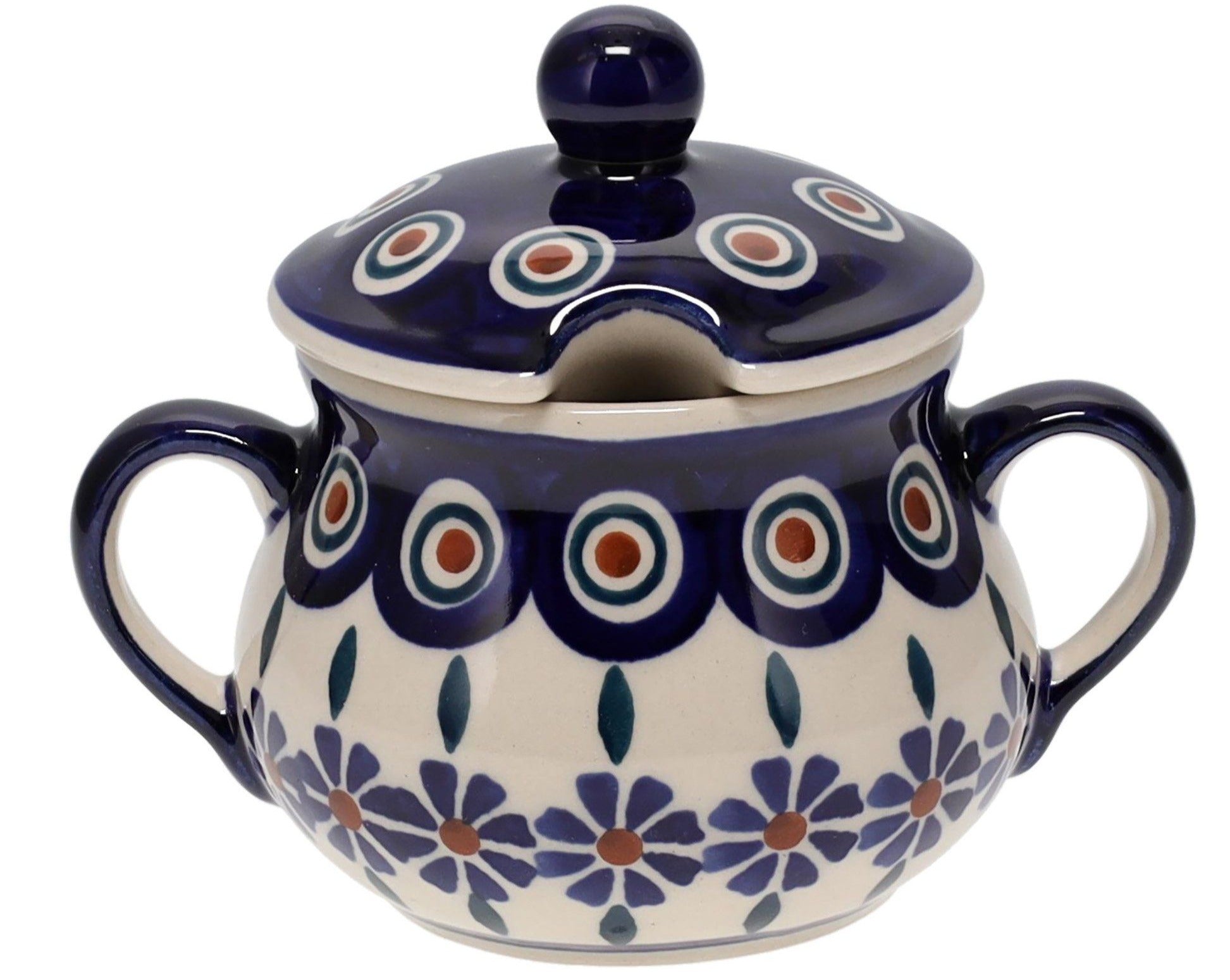 And here's the cherry on top - this sugar bowl is not only beautiful and functional, but it is also free of lead, nickel, or cadmium. You can enjoy your sugar with peace of mind, knowing that it meets the highest safety standards. So go ahead, treat yourself to a little piece of Polish craftsmanship and add a touch of elegance to your home. With the Polish Pottery 3.5" Traditional Sugar Bowl in the "Floral Peacock" pattern, sweetness has never looked so beautiful.