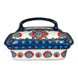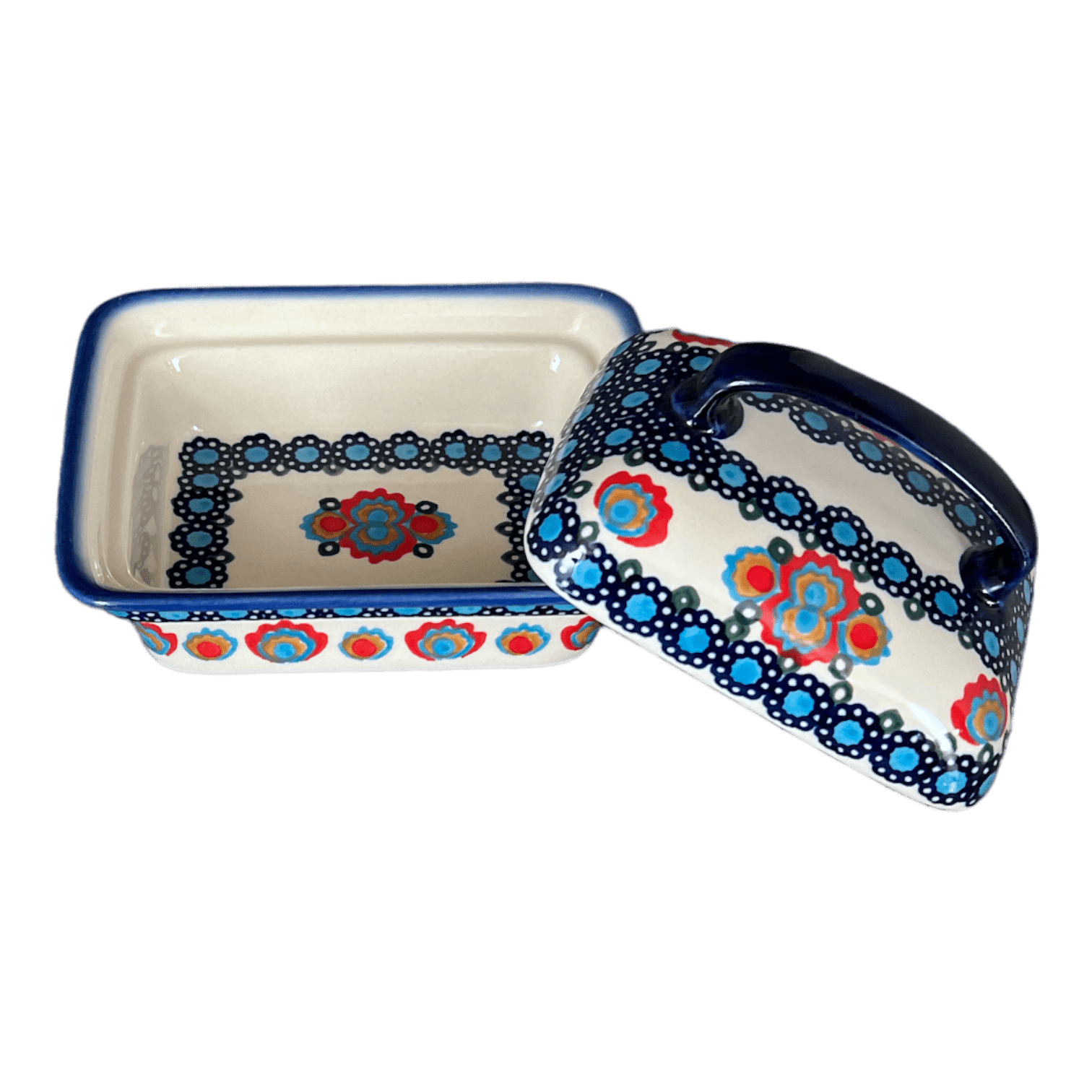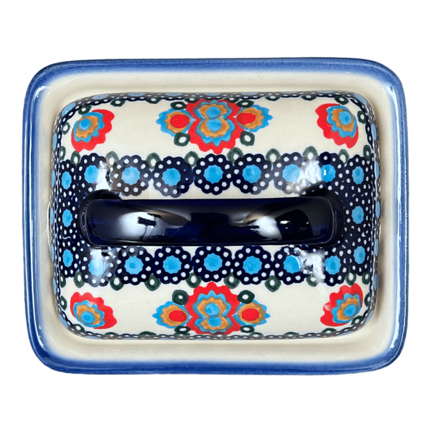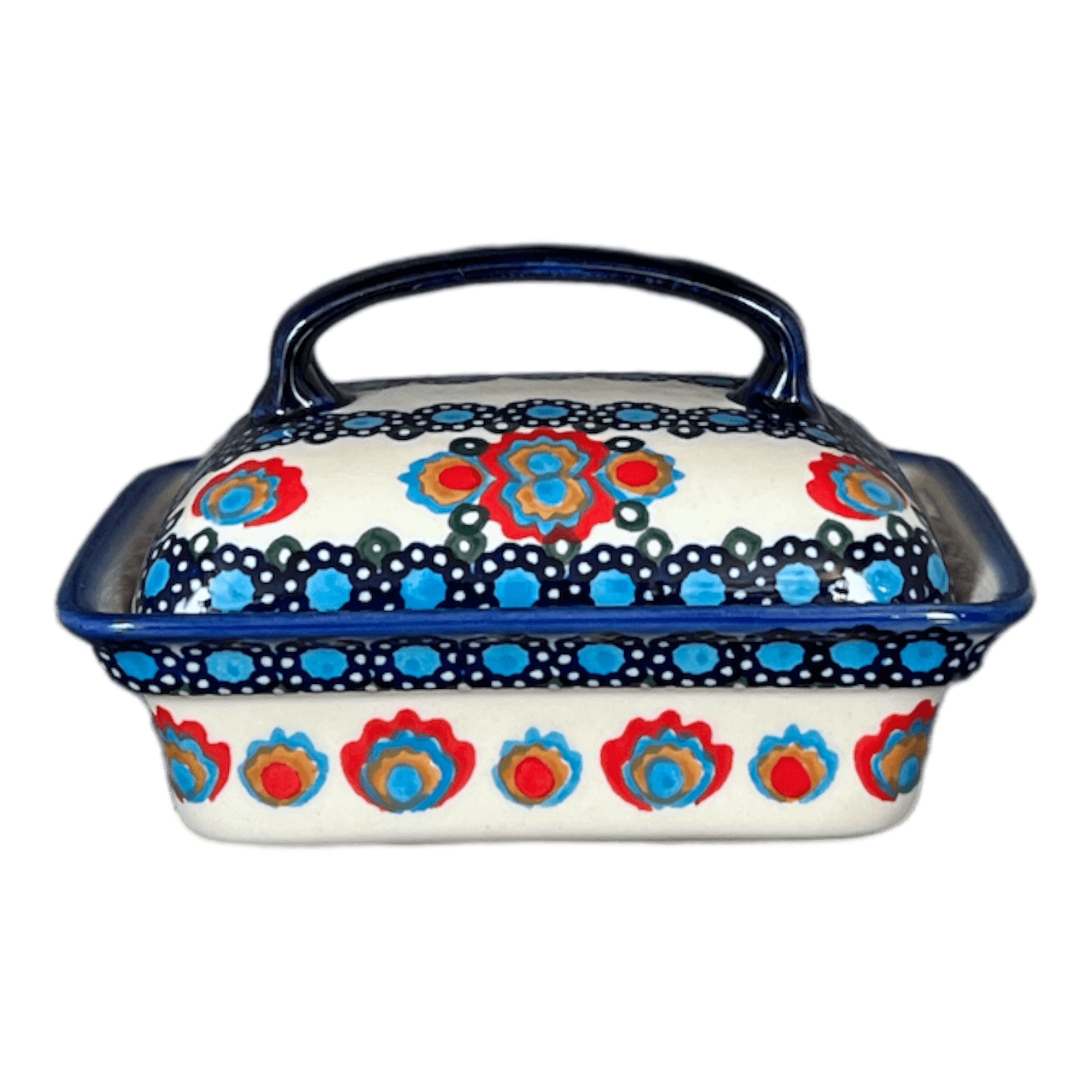 Imagine a splash of vibrant colors and intricate designs that transform your everyday kitchen into a charming European cafe. That's the magic of the Polish Pottery Butter Dish, crafted by the skilled artisans of Andy's family-owned factory in Boleslawiec, Poland. Measuring a cozy 5.5" x 4.75", this delightful dish is adorned with the "Polish Bouquet" pattern, where traditional artistry meets a kaleidoscope of colors. Flowers and dots dance in shades of deep blue, light blue, and playful red, encapsulating the spirit of Polish heritage with every detail.