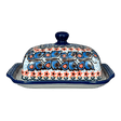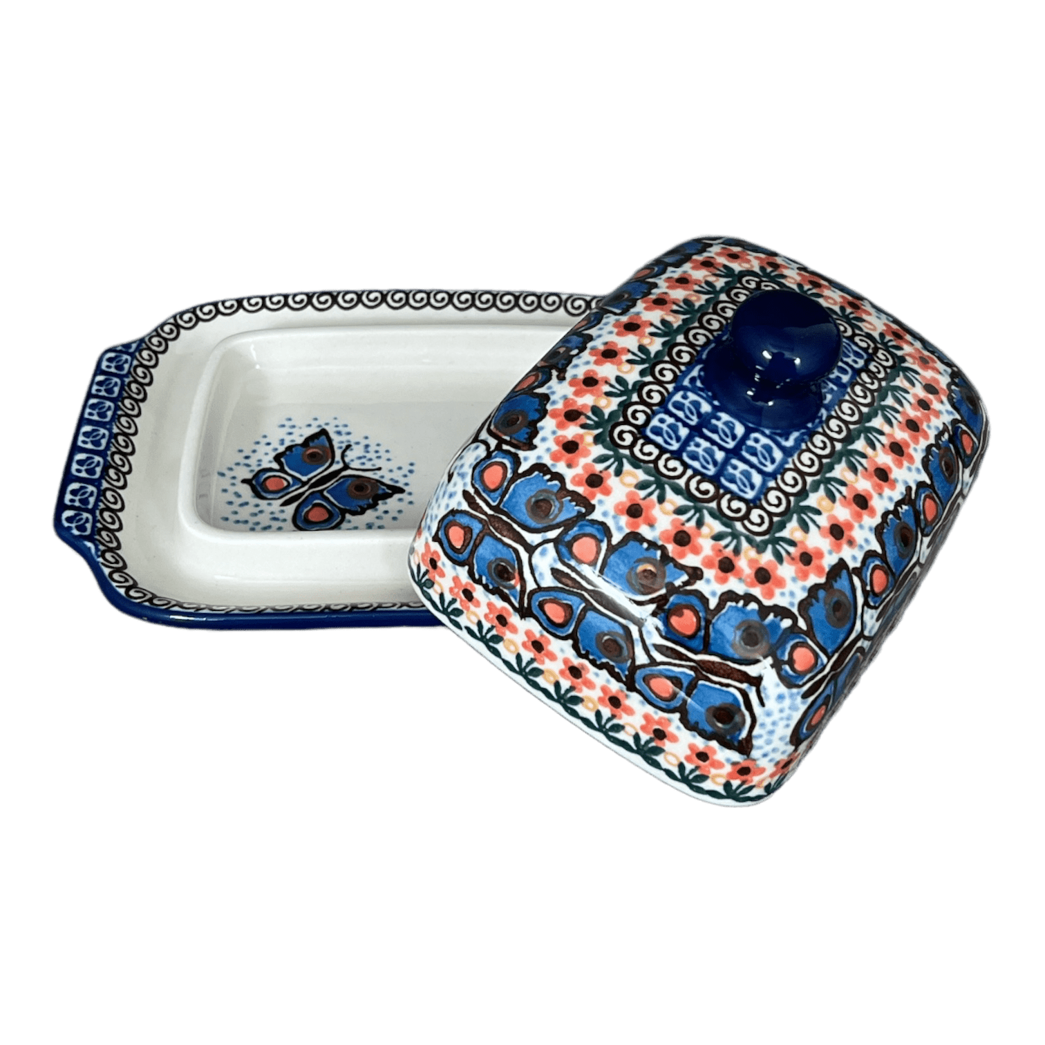 Imagine a touch of elegance and an air of sophistication gracing your kitchen counter. Introducing the Polish Pottery Butter Dish, meticulously crafted by the revered artisans of Ceramika Artystyczna. At 7" x 5.5", this butter dish isn't just a container; it's a centerpiece that showcases the vibrant "Butterfly Parade" pattern. This design features playful blue butterflies with peach-colored spots fluttering around lush peach flowers, set against a canvas of green leaves and blue squares. Every stroke and color splash is hand-painted, making each dish uniquely yours.