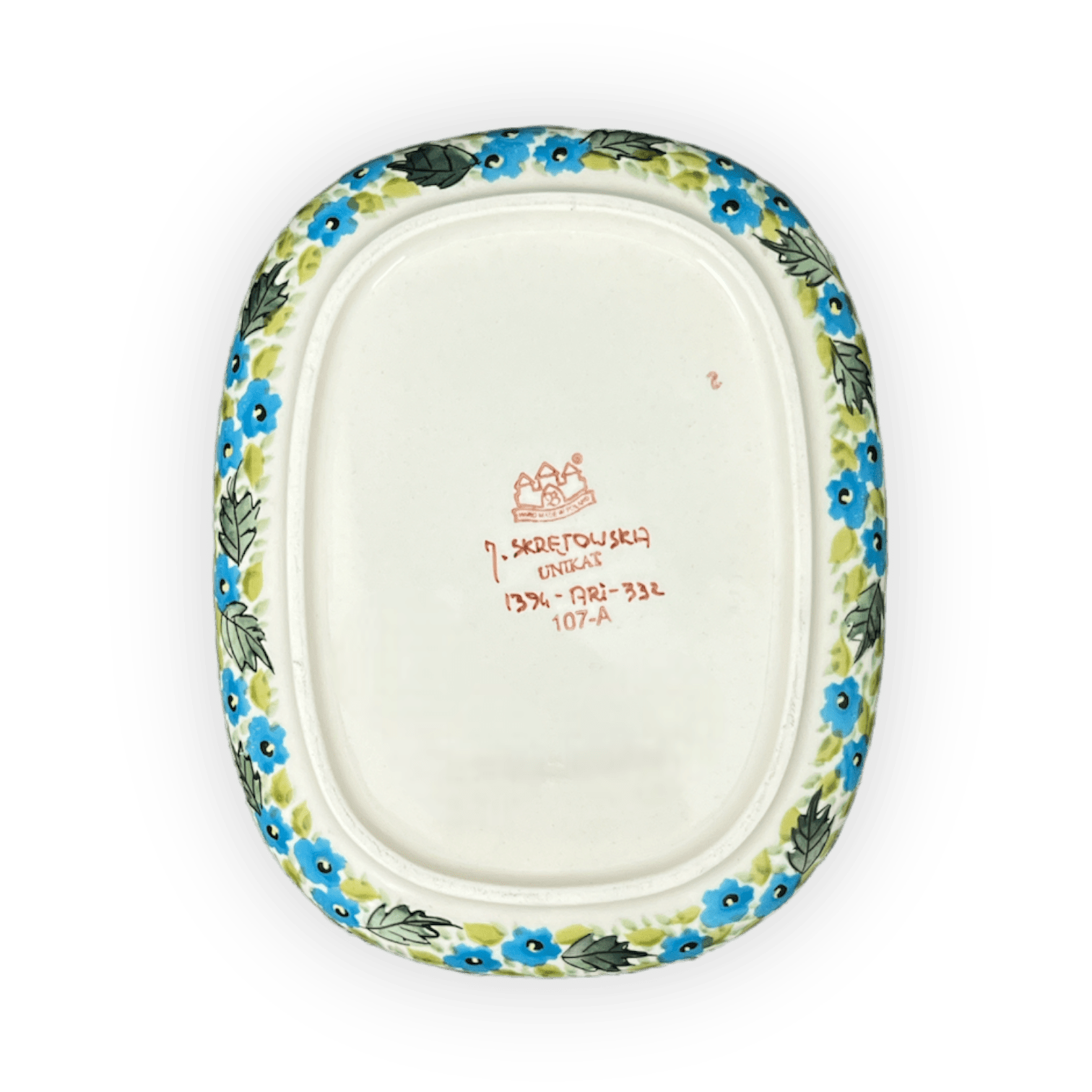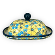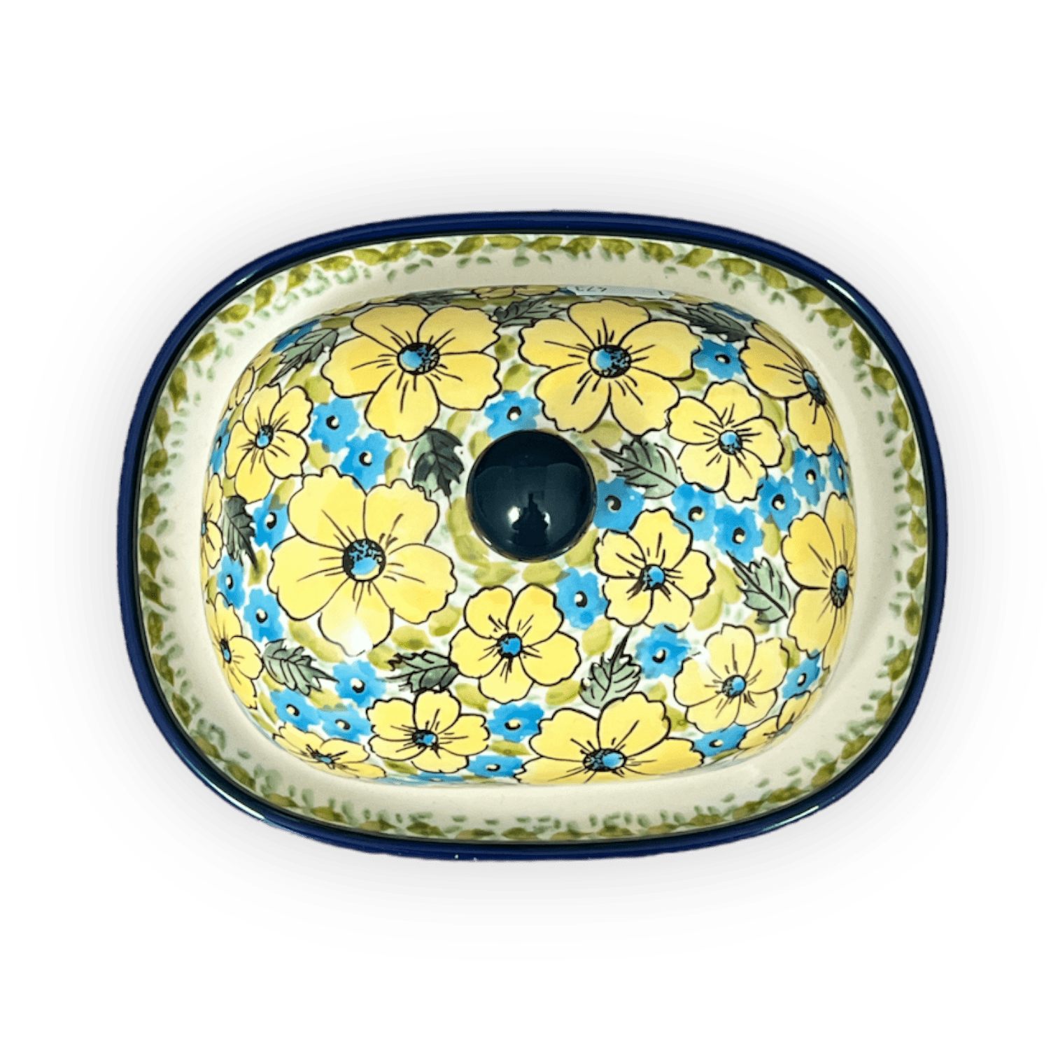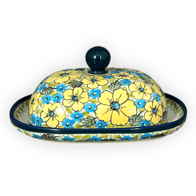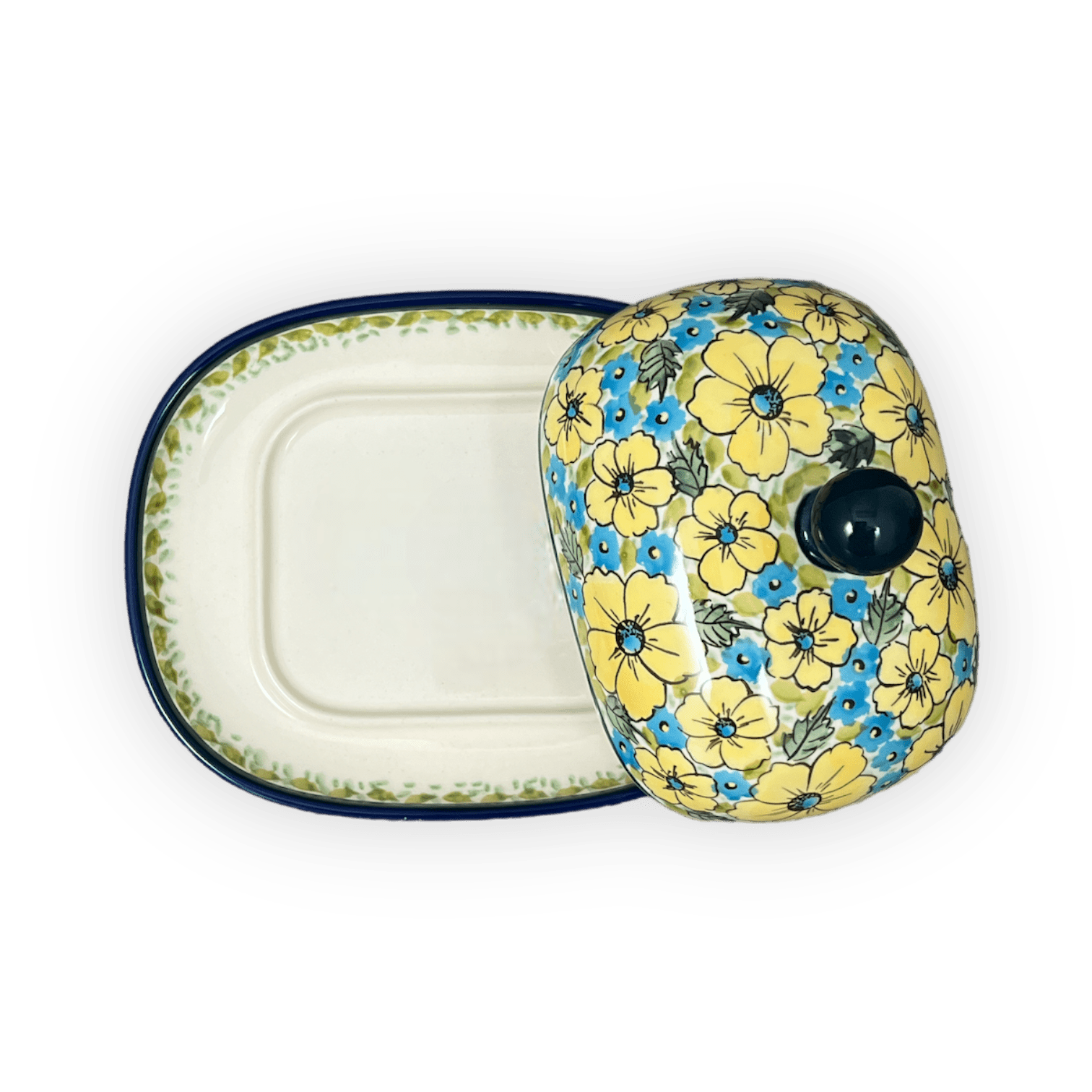 Introducing the vibrant and exquisitely handcrafted Polish Pottery Butter Dish from Zaklady, a stunning addition to any kitchen. This large 6" x 8" dish, adorned with the cheerful "Sunny Meadow" pattern, features an explosion of large yellow flowers and delicate blue blossoms, all nestled against a lush green, leafy backdrop. Each piece is a canvas showcasing the unique blend of yellow, blue, and green, ensuring that this dish isn’t just a home for butter, but a piece of art that brightens your table and sparks conversation.