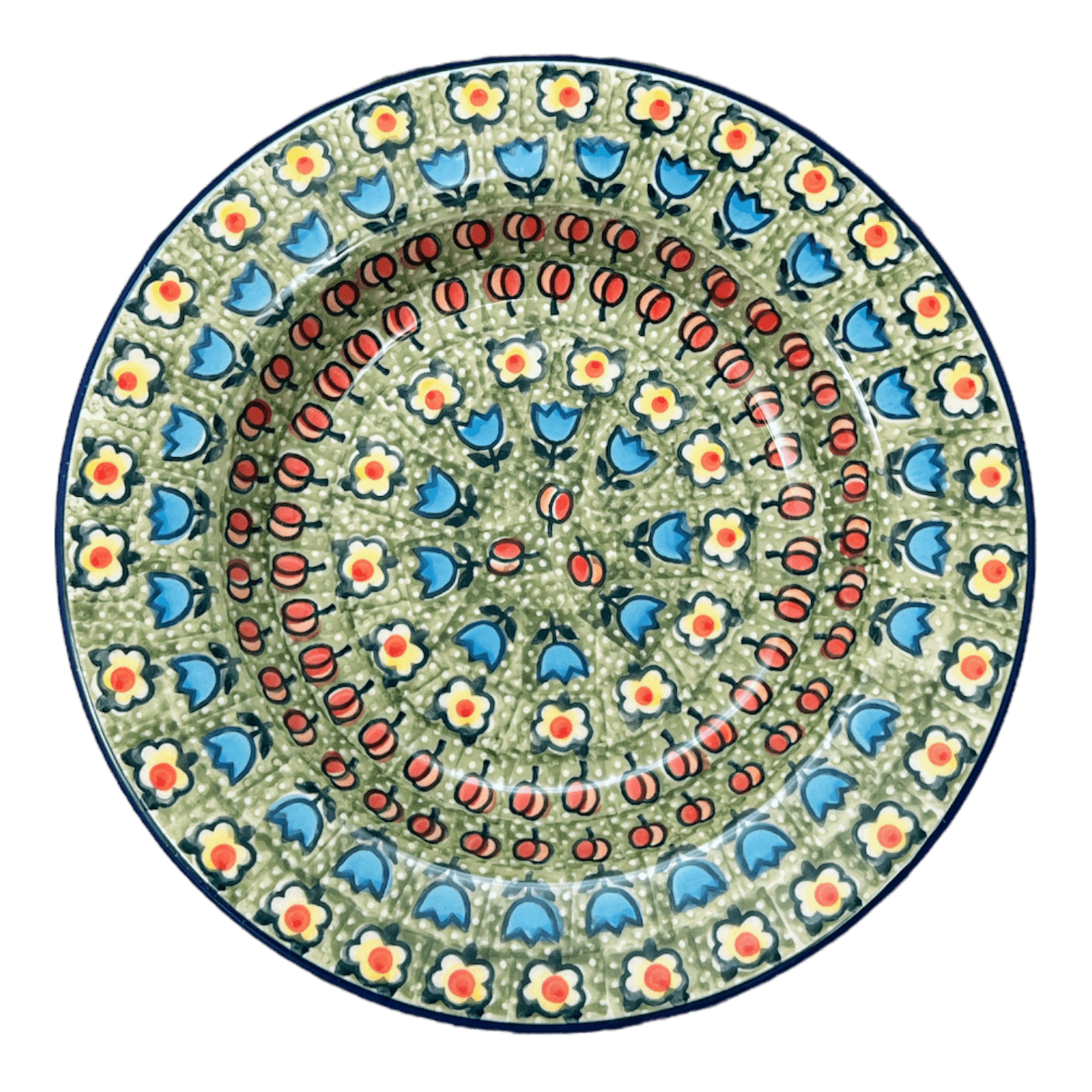 Step into the world of elegance and artistry with the Polish Pottery Soup Plate from Manufaktura, a treasure from the heart of Boleslawiec, Poland. This exquisite 9.25" soup plate isn't just any dish; it's a canvas showcasing the stunning "Amsterdam" pattern, where vivid green hues serve as the backdrop for a dance of delicate white and orange flowers, light blue bellflowers, and vibrant red and orange berries. Each piece, painstakingly hand-painted by skilled artisans, brings a touch of European charm right to your dining table, turning every meal into a festive gathering.