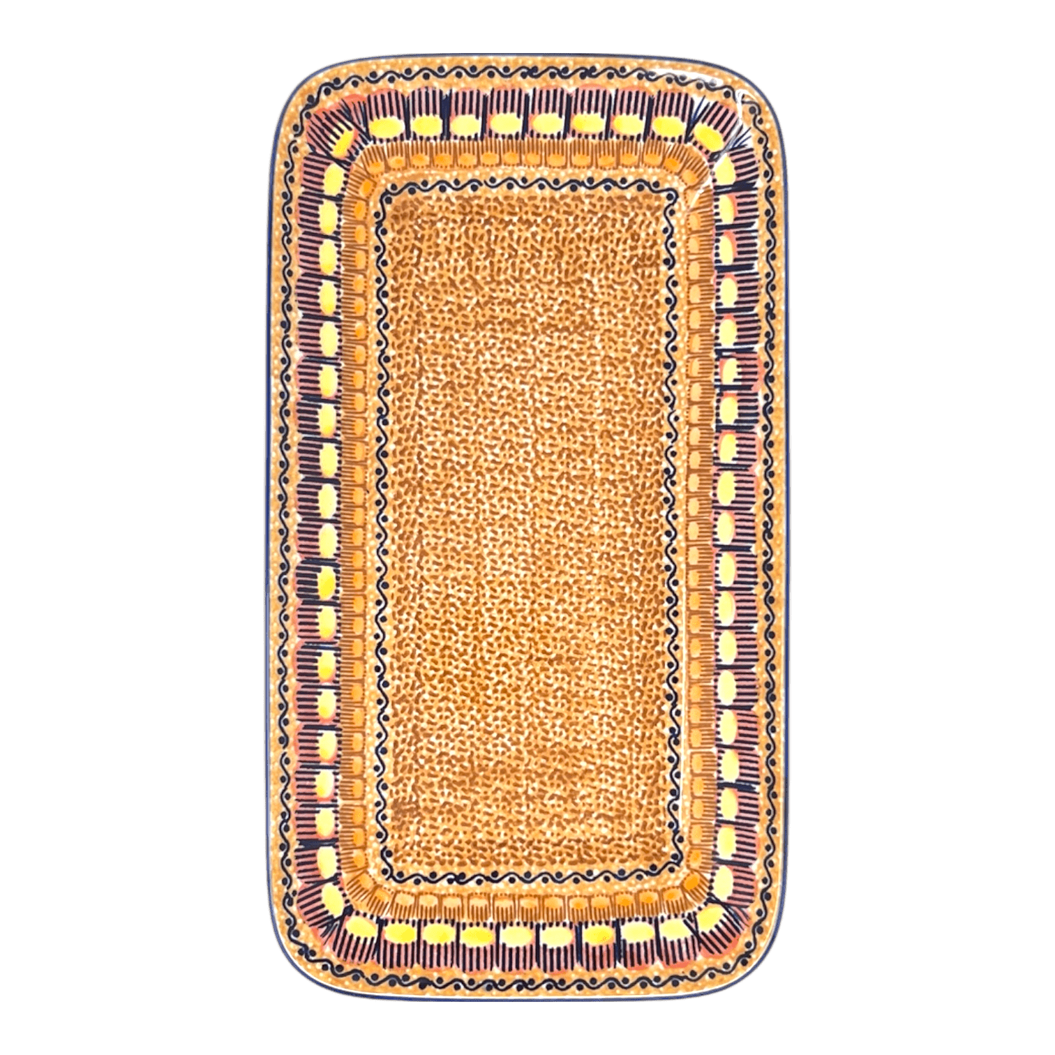 Imagine serving your family or guests with the stunning "Desert Sunrise" Polish Pottery Platter from Manufaktura. This 14" x 8" rectangular masterpiece isn't just a dish; it's a canvas where culinary meets creativity. Its vibrant pattern, featuring an orange background with densely packed tiny brown dots, is surrounded by a delightful band of yellow suns with blue rays, and a smaller band of orange suns with brown rays. This Unikat-level artistry, marked by its unique stamp of authenticity, transforms every meal into a vibrant celebration. Whether it's a colorful array of hors d'oeuvres or a hearty portion of roasted vegetables, this platter makes every serving a visual feast.