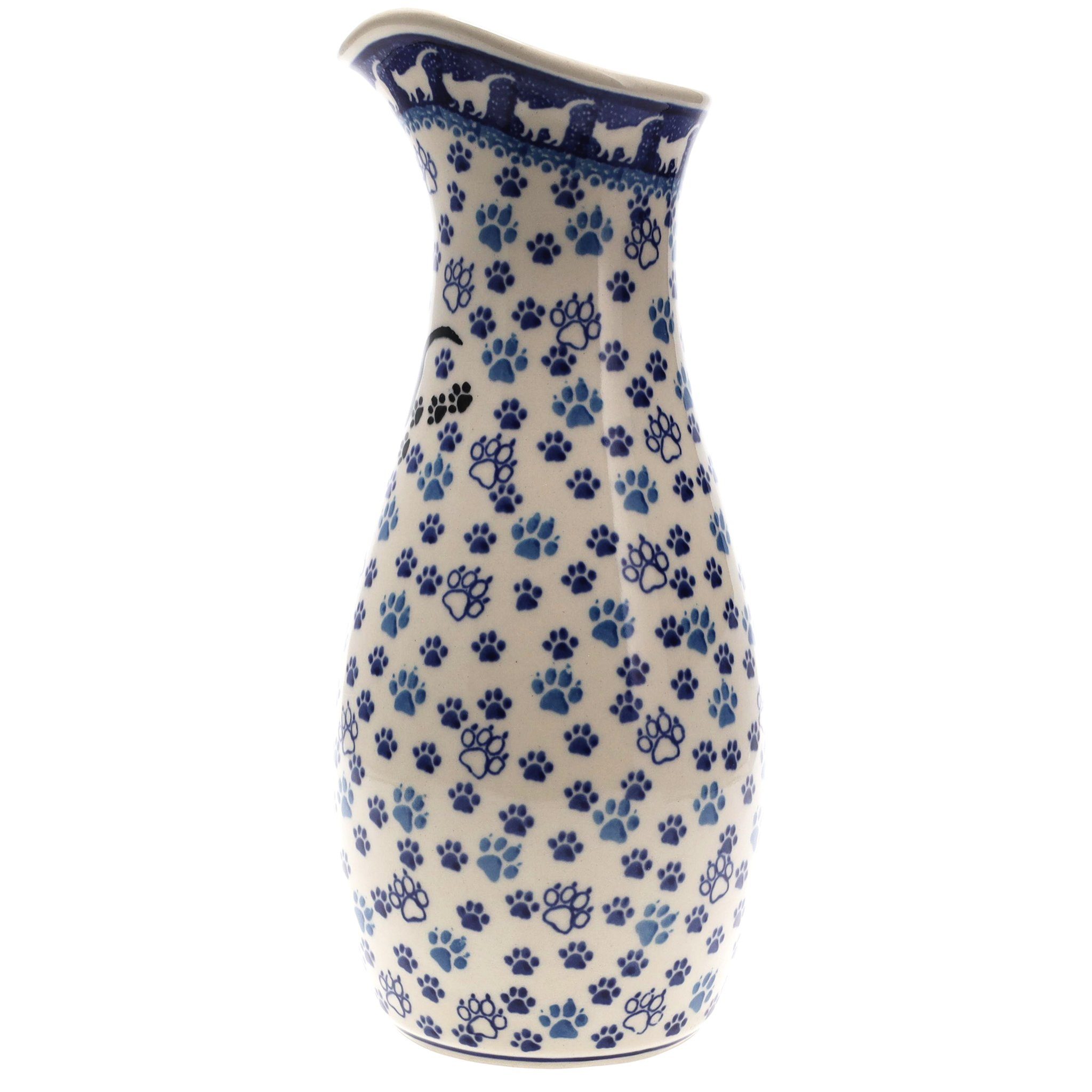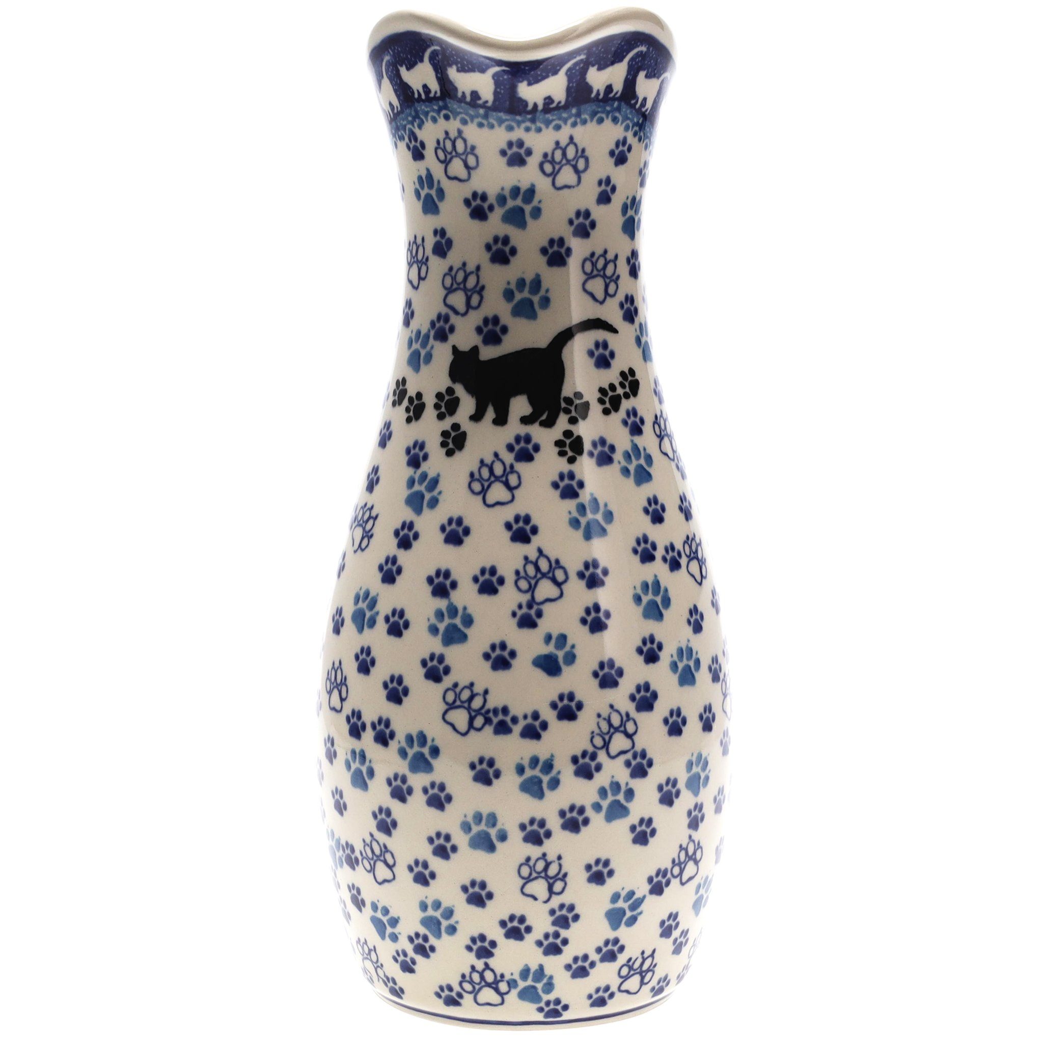 Introducing the enchanting 48 oz Polish Pottery Carafe from Ceramika Artystyczna, wrapped in the playful "Cat Tracks" pattern that's sure to steal the heart of any cat lover! Imagine a parade of tiny dark blue paw prints alongside larger, whimsical light blue ones, each dancing around the pure white canvas of this exquisite carafe. And there, slightly off-center, the silhouette of a mischievous black cat stands poised, tail curled in a delightful arch, ready to leap off into your kitchen. This piece isn't just a container; it's a story in ceramic, a tale of feline frolic that brings a smile with every pour.