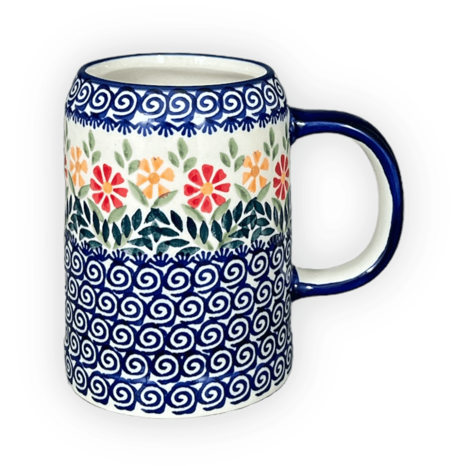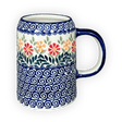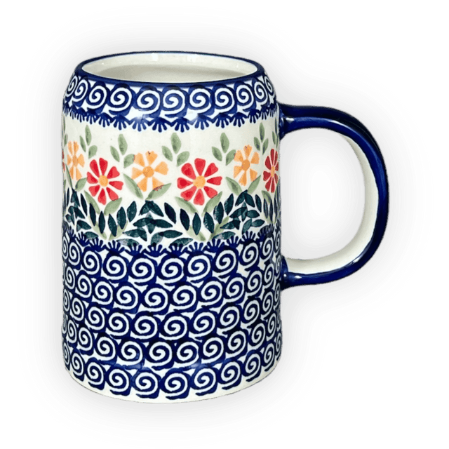 Introducing the enchanting Polish Pottery Drinking Glass, Tankard, 22 oz Small, crafted by the master artisans of Manufaktura in the vibrant "Flower Power" pattern (JS14). Imagine clasping a piece of art every time you sip your favorite brew! This isn't just any drinking vessel; it's a whimsical creation that brings the festivity of a blooming garden right to your table. Store this exquisite tankard in the freezer to transform it into a frosty wonder, ensuring your beverage stays cool and refreshing under any circumstances. The vivid display of red, orange, and blue flowers on a pristine white background, accentuated with swirling blue and a ring of green leaves, invites a splash of joy with every glance.