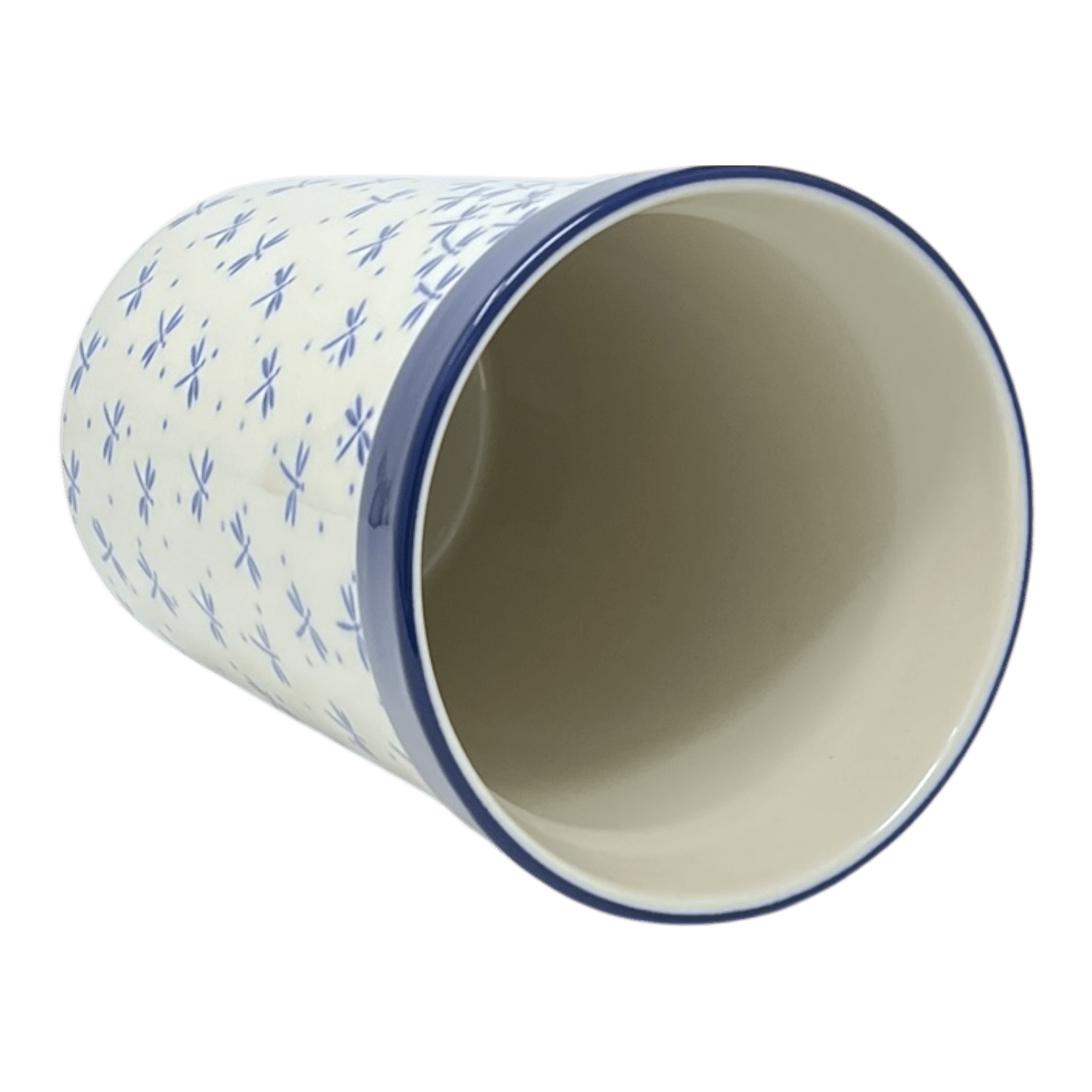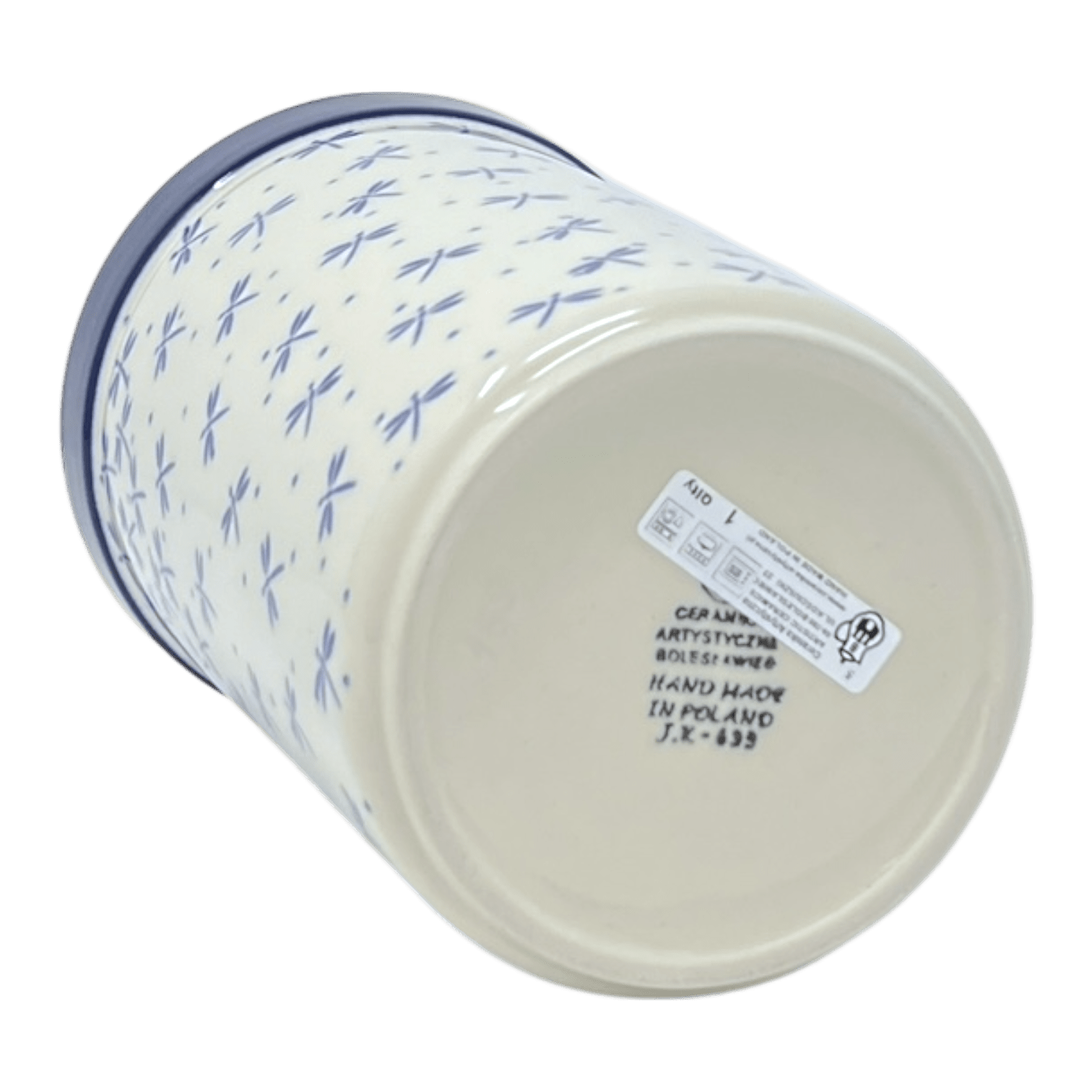 Imagine a piece of pottery that not only enhances the aesthetics of your kitchen but also offers exceptional versatility. Enter the Polish Pottery Utensil Holder from Ceramika Artystyczna, a stunning 7.75" tall and 5.5" diameter marvel, dressed in the enchanting "Dragonfly Flight" pattern. This pattern, predominantly in soothing shades of blue with delicate white accents, features whimsical light blue dots and charming dragonflies scattered across a crisp white background. The design crescendos in one corner, creating a dynamic visual focus. This traditional pattern, crafted using the age-old "punching" technique, reflects the simplicity and beauty of nature, capturing the essence of Polish craftsmanship.
