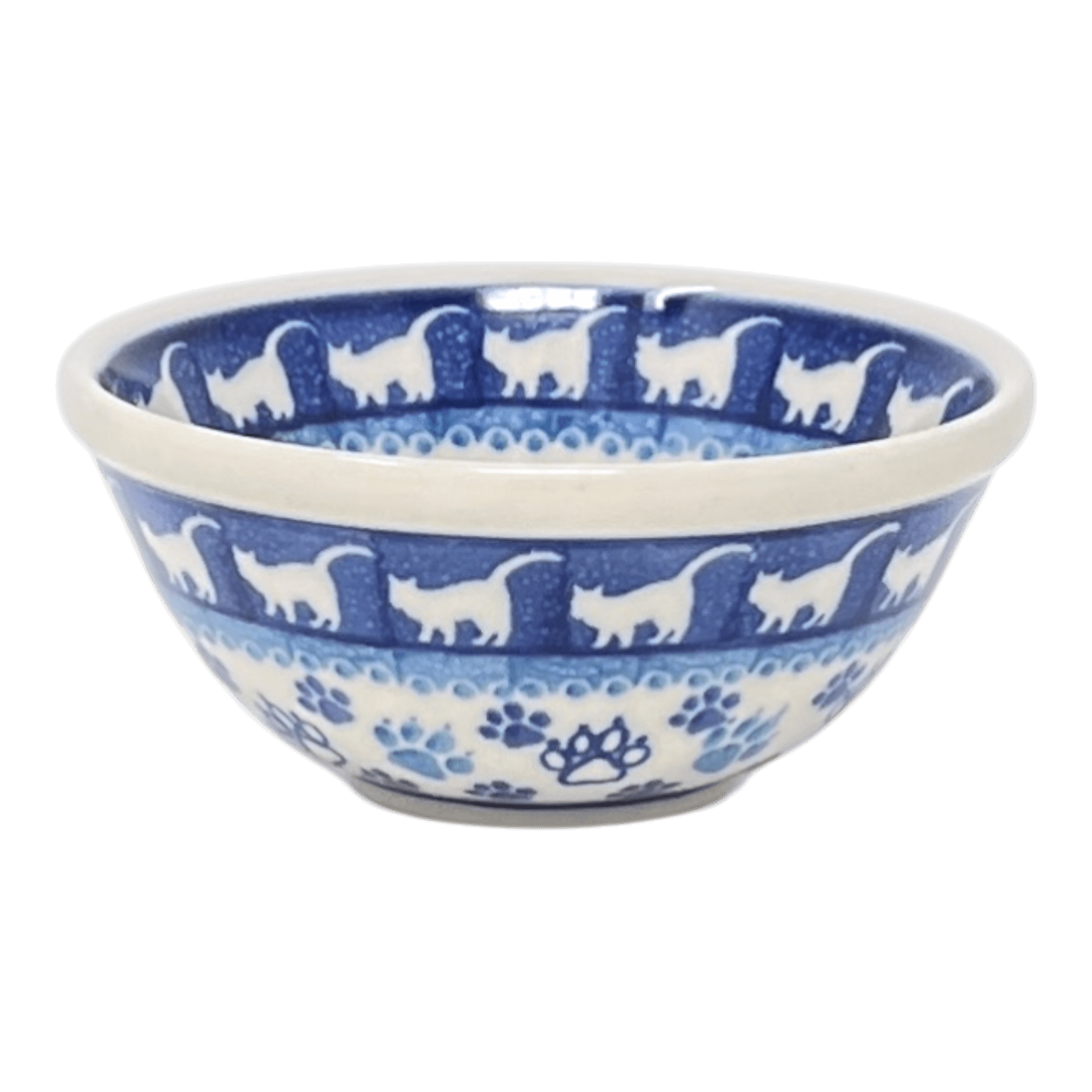 Imagine a quaint Polish village, where the clink of brushes on pottery melds with the artists' focused murmurs. From this serene setting emerges the Polish Pottery Bowl from Ceramika Artystyczna, a true gem crafted in the heart of Boleslawiec. Not just any bowl, this delightful piece, measuring a handy 4.75 inches in diameter and 2 inches deep, is adorned with the playful "Cat Tracks" pattern. Picture this: small dark blue paw prints dancing alongside larger, light blue ones, with the occasional white paw print complete with claws playfully scattered around. At the heart of the design, a large black cat silhouette faces counterclockwise, adding a touch of whimsy with its tail artistically curved and raised.