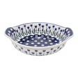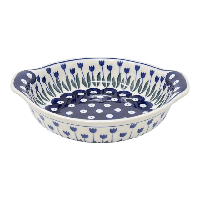 Introducing the charmingly quaint Polish Pottery Casserole Dish by Ceramika Artystyczna, a delightful gem that's as versatile as it is visually stunning. Perfect for your cozy gatherings, this petite round baker, measuring 6.5" x 7.25", is the ideal size for whipping up hot dips, melting brie cheese, or baking delightful small cakes. Adorned with the playful "Tulip Dot" pattern, this dish features an enchanting array of white polka dots playfully scattered across a serene blue backdrop, surrounded by delicate blue tulips perched on thin stems with dark green leaves. It’s a piece that promises to bring a touch of traditional Polish charm right into your kitchen.