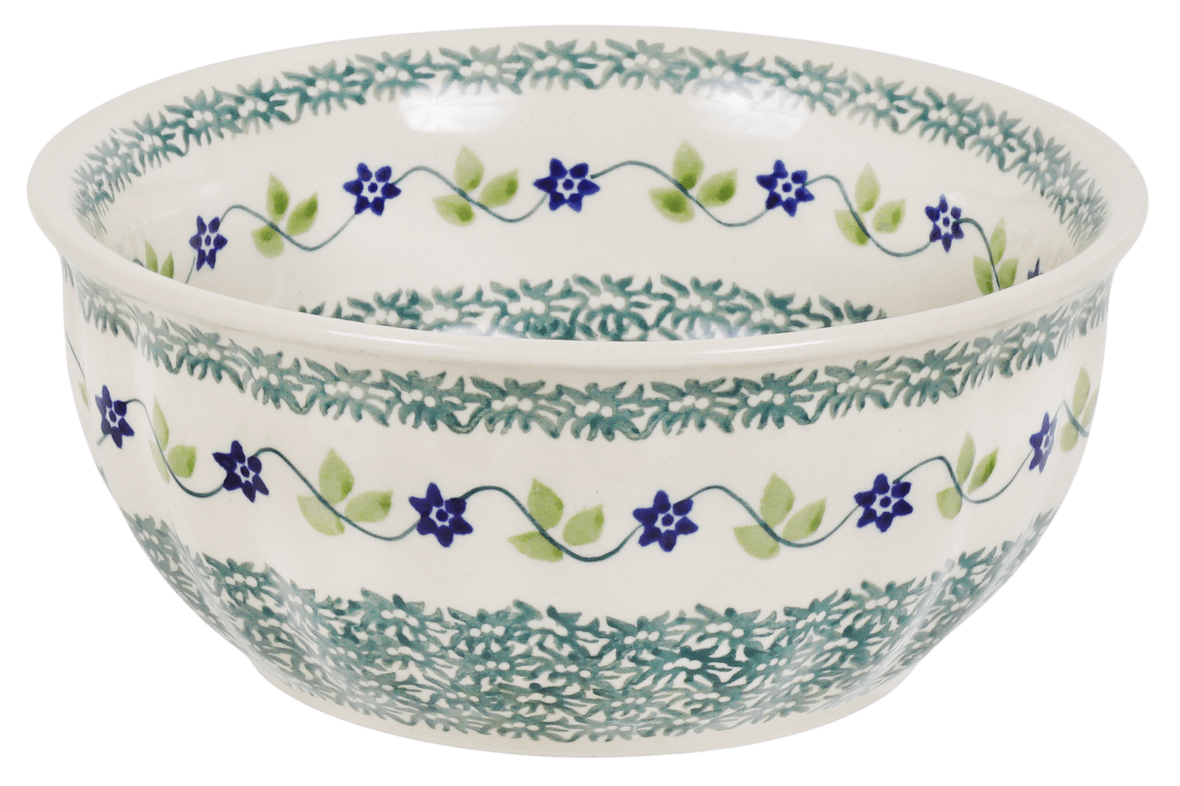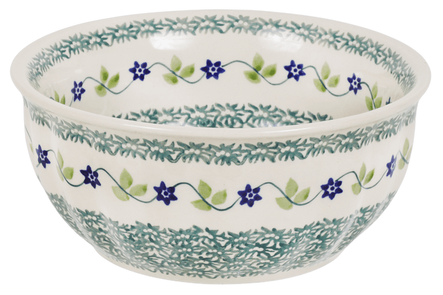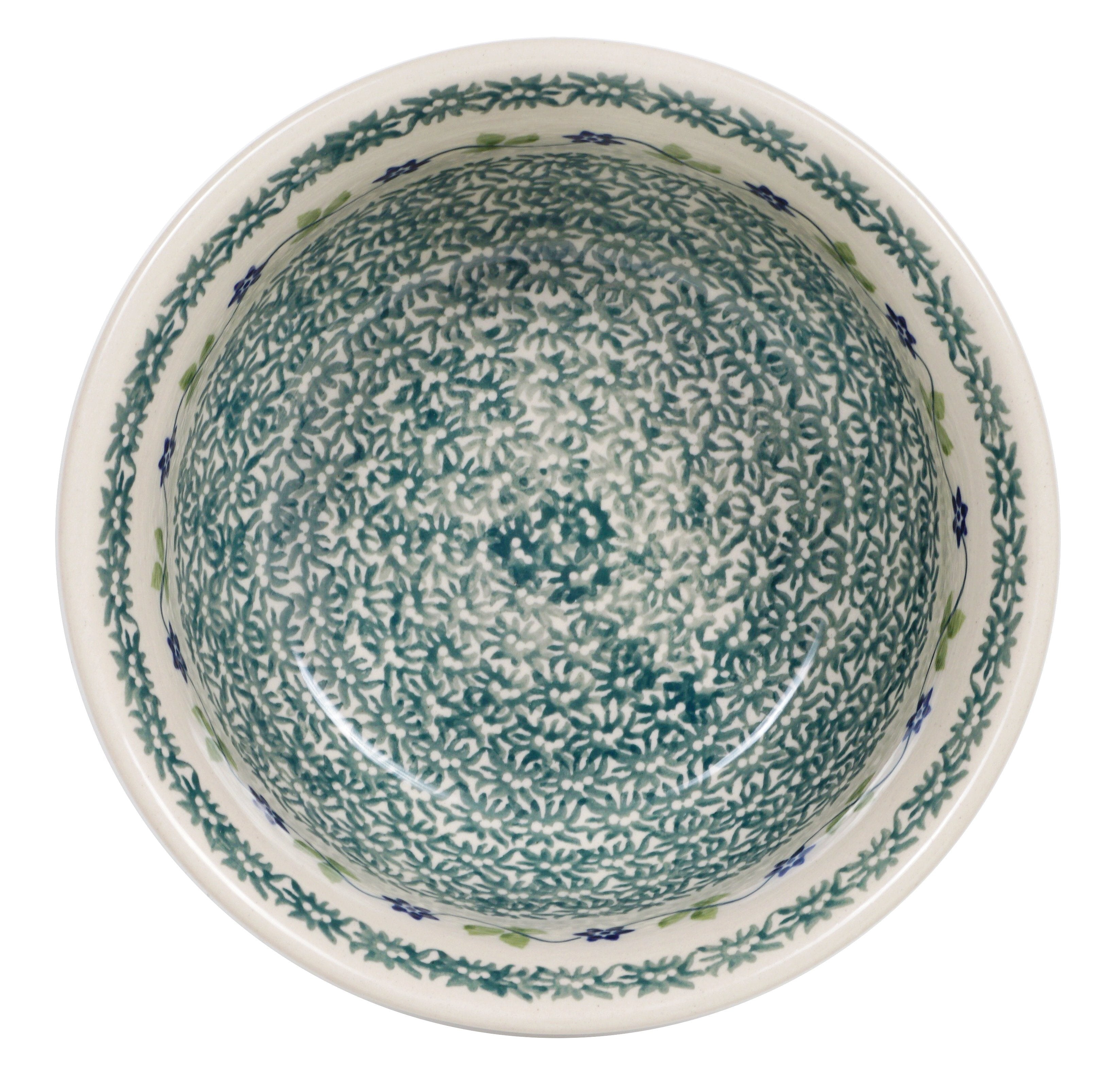 Imagine a touch of rustic charm gracing your dinner table, with each piece whispering stories of artistry and tradition. That’s exactly what you get with the Polish Pottery Bowl from Manufaktura, elegantly adorned in the "Woven Starflowers" pattern. Sized perfectly at 6.5 inches, these versatile bowls are ideal for serving everything from hearty soups and fresh salads to delicious pastas. Not just for dining, they also serve wonderfully as quaint mixing bowls for your baking endeavors. The beautiful design features a white background highlighted by a simple yet captivating pattern of green vegetation, connected by a delicate teal vine, with charming blue star-shaped flowers and trios of green leaves encircling the center.