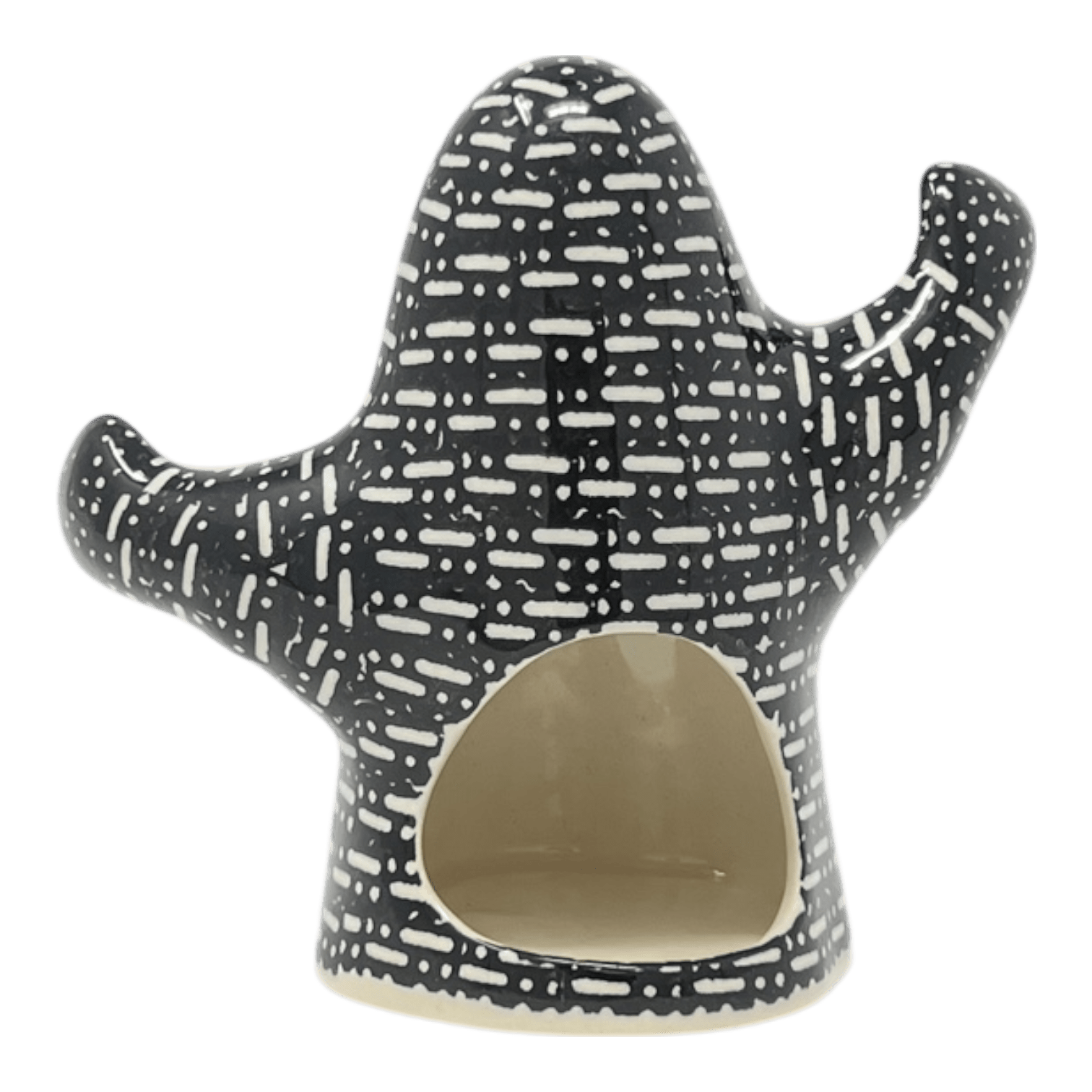 Imagine the enchantment of Halloween melding with the timeless charm of Polish craftsmanship! The Polish Pottery Luminary, Ghost, standing a quaint 5.25 inches tall, is the whimsical creation of the esteemed Manufaktura artisans from the picturesque town of Boleslawiec, Poland. Hand-painted in the captivating "Metro" pattern, this adorable ghostly figure is swathed in a mysterious black hue, dotted and dashed with tiny white specks that seem to dance in the flickering candlelight. A true testament to traditional Polish pottery, the pattern showcases the iconic and recognizable style that has charmed ceramics enthusiasts worldwide.