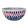The "Shock Waves" pattern is a visual masterpiece that combines geometric elements with a predominantly blue color palette, accentuated by pops of red and white. It's like a work of art that you can eat out of! Handcrafted in Boleslawiec, Poland, by skilled artisans, this bowl is a testament to the rich heritage and craftsmanship of Polish pottery.