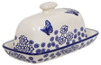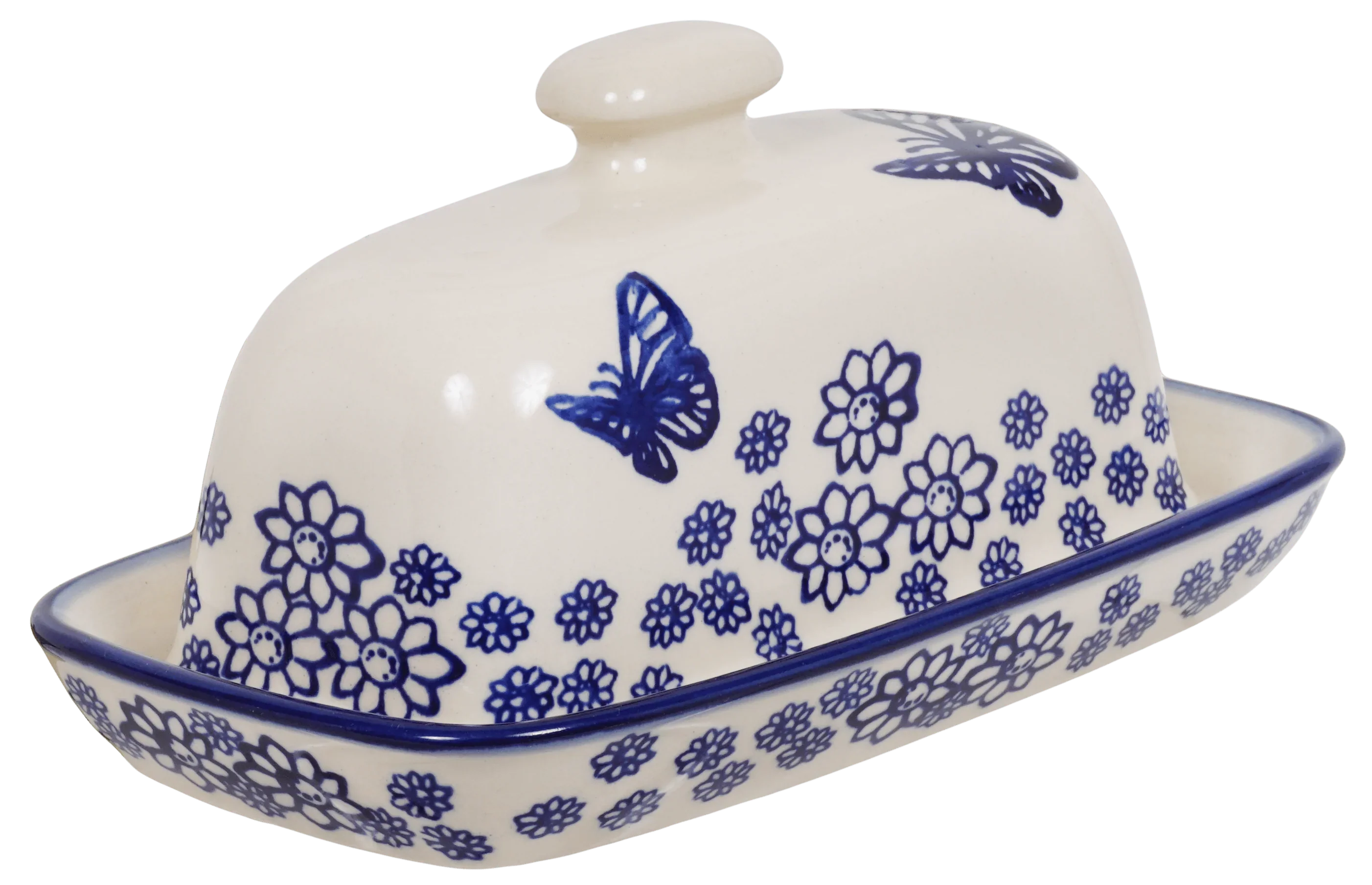 Introducing the Polish Pottery 7.5" x 4" American Butter Dish by Manufaktura, a delightful addition to your kitchen that is sure to catch everyone's eye! This butter dish is not just any ordinary container for your stick of butter or margarine - it is a stunning work of art. With its "Butterfly Garden" pattern, featuring beautiful butterflies and flowers in a predominantly white color with accents in blue, this butter dish is guaranteed to add a touch of elegance to your table.