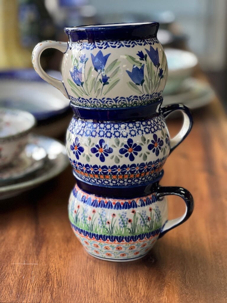 Introducing the stunning Polish Pottery 10 oz. Belly Mug by Zaklady in the exquisite "Blue Tulips" pattern (ART160). These mugs are not your ordinary coffee mugs - they are a delightful blend of traditional Polish design and modern elegance.