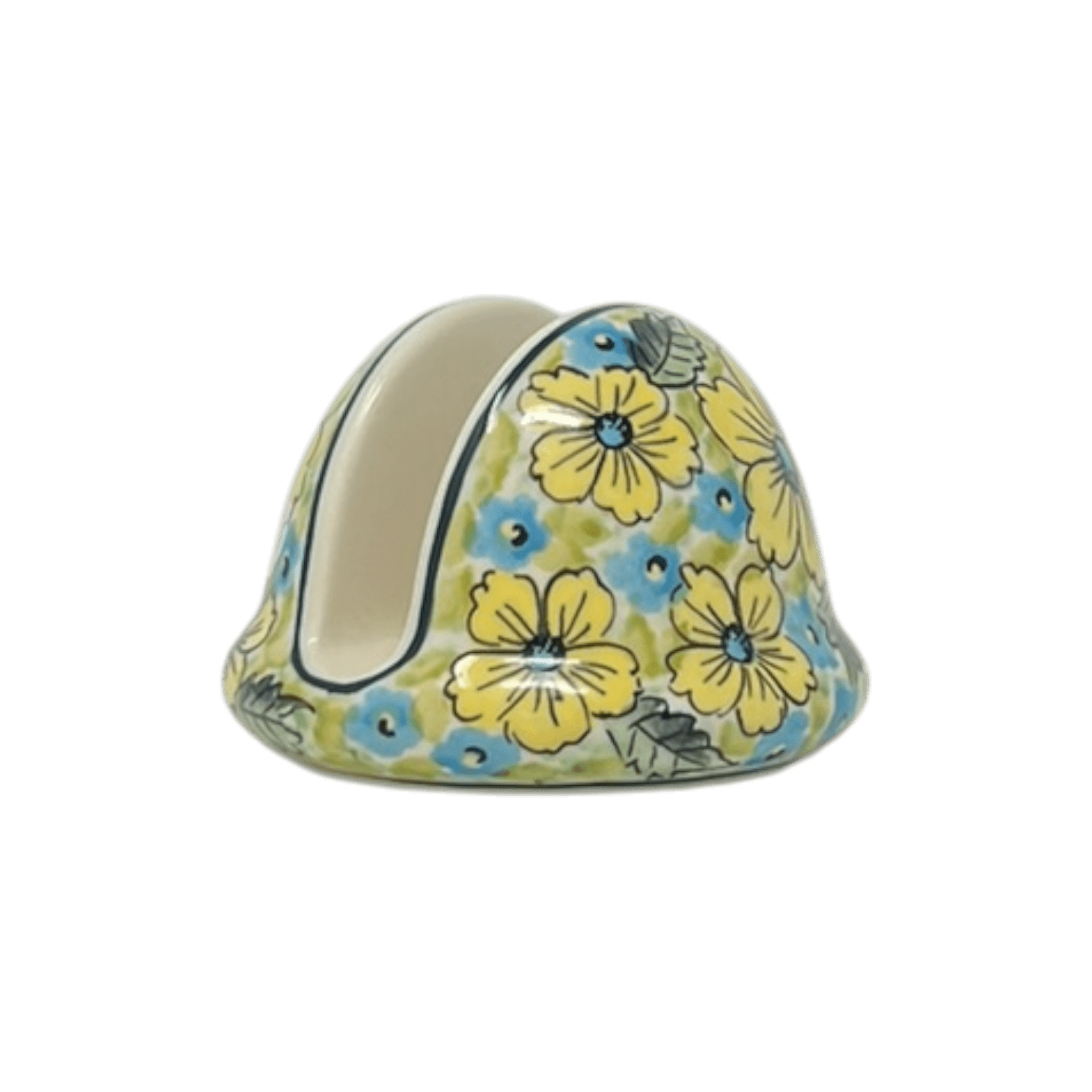 Imagine transforming your dining table into a vibrant canvas of colors with the Polish Pottery Napkin Holder from Zaklady, crafted in the cheerful "Sunny Meadow" pattern. This isn't just any napkin holder; it's a round, exquisitely hand-painted masterpiece that features a dance of large yellow and small blue flowers, set against a lively green, leafy backdrop. Each holder, measuring 4 inches in diameter and 3 inches tall, brings a burst of sunshine and sophistication right to your table. Perfect for holding your napkins with an elegant flair, it adds not just utility but a touch of artistic charm to every meal.