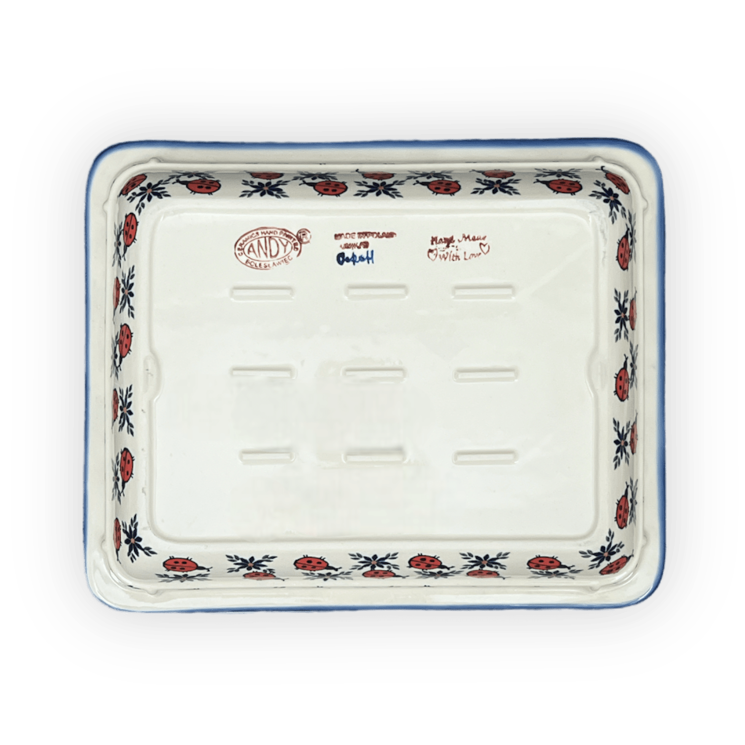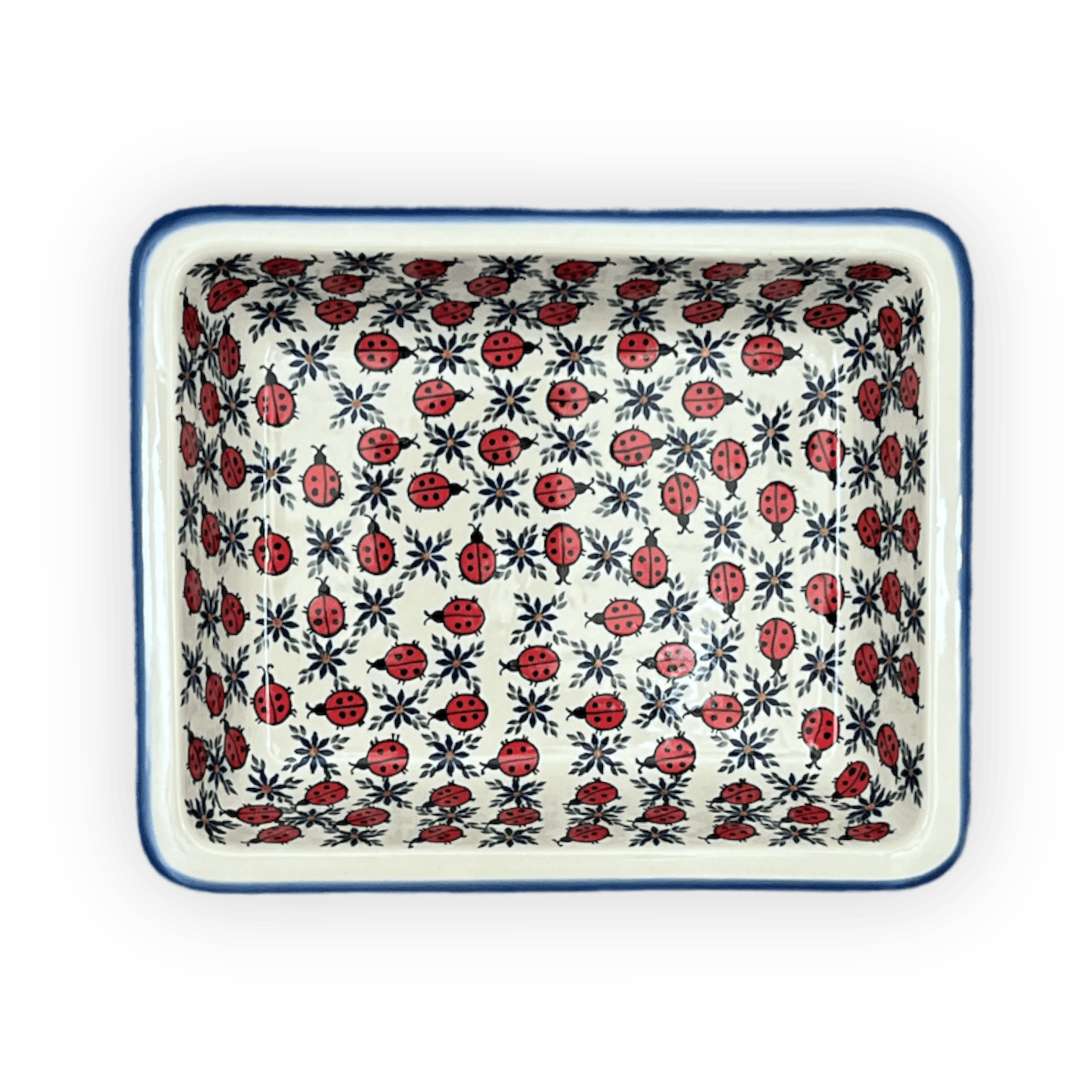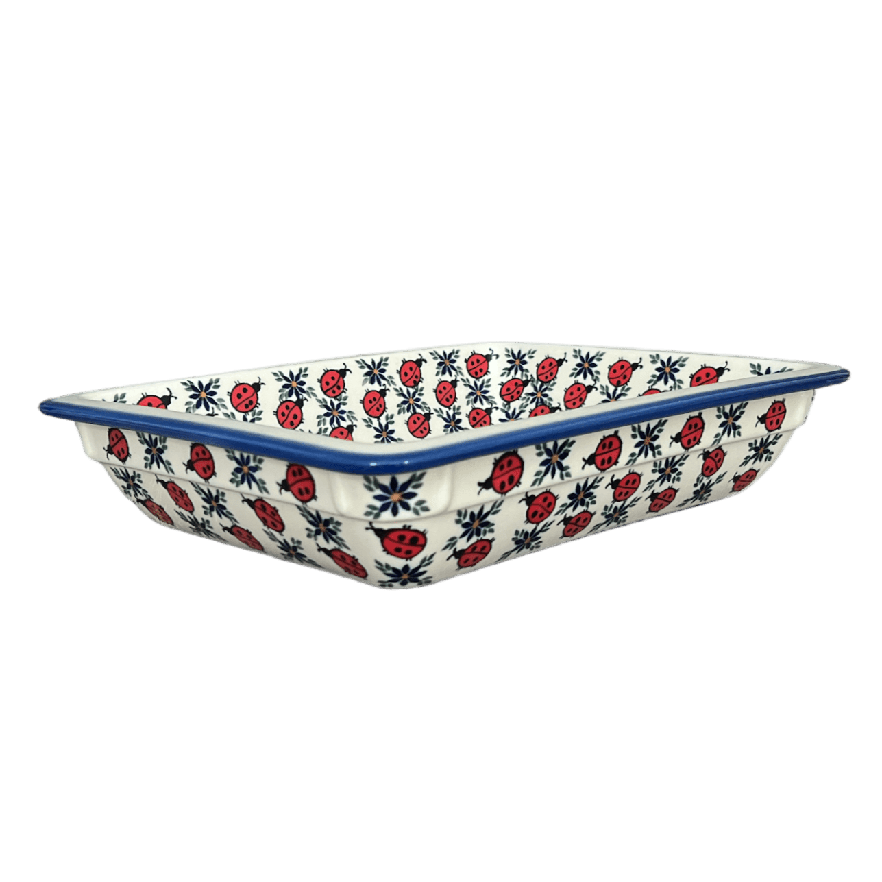 Imagine pulling a dish out of the oven, not just any dish but one that brightens your table with the playful charm of red ladybugs nestled among tiny blue flowers. This is the "Lovely Ladybugs" pattern by Andy, a delightful motif that captures the essence of a whimsical garden on a 10.25" x 12.5" rectangular baking dish. Crafted in the heart of Boleslawiec, Poland, this dish isn’t just a vessel for your culinary creations—it’s a conversation starter. Perfect for everything from bubbling lasagnas to sweet, spongy cakes, it promises to make every meal a little more festive.