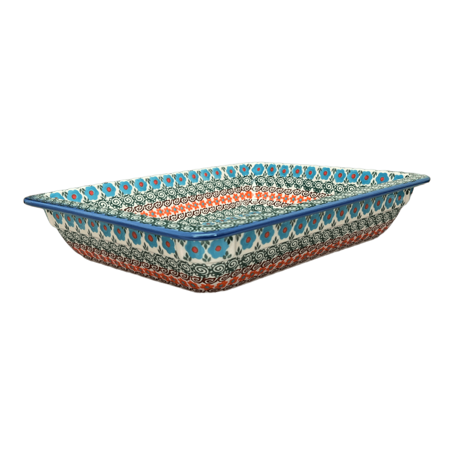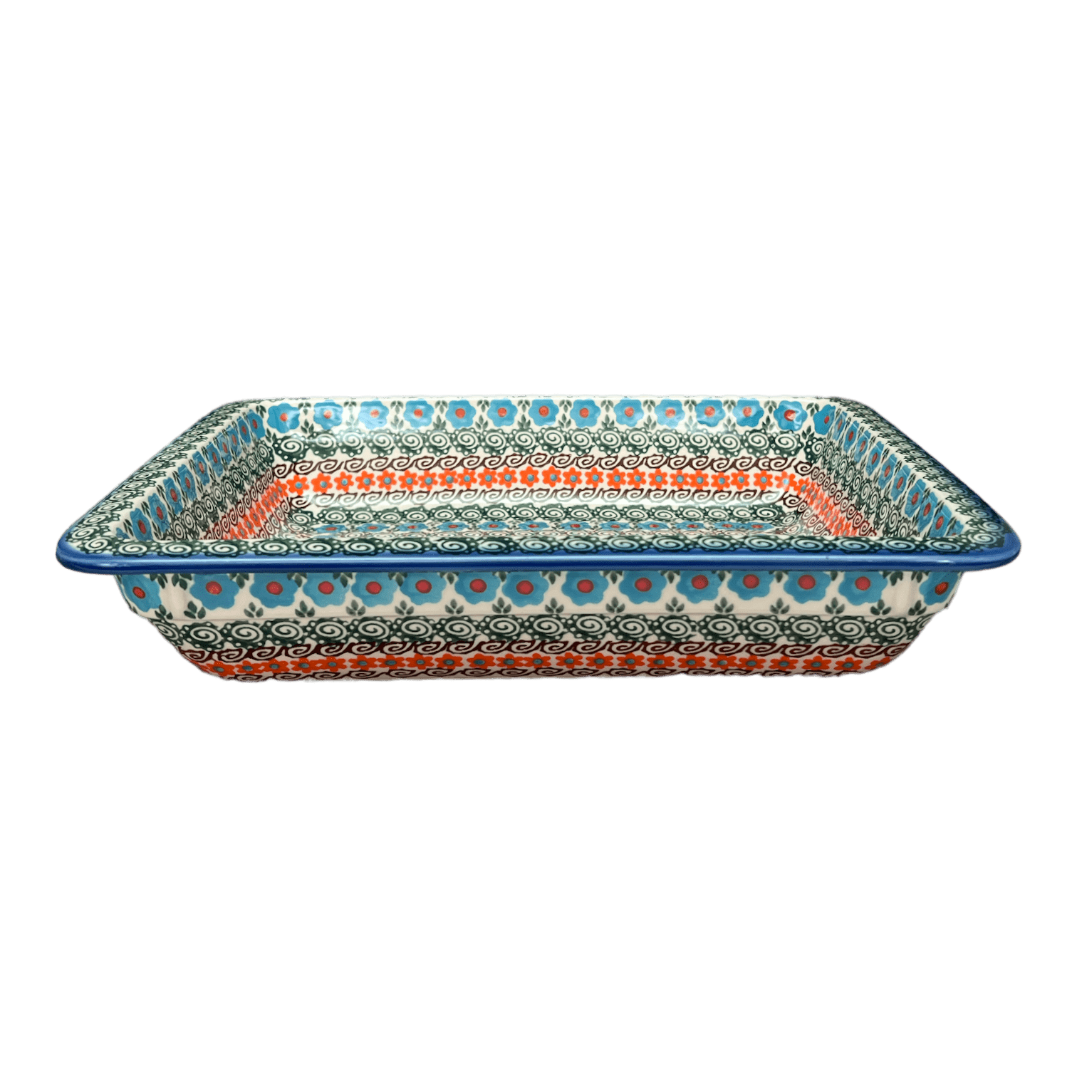 Imagine pulling a steaming, aromatic lasagna from the oven, baked to perfection in a dish that's as visually stunning as it is functional. Introducing the Polish Pottery Rectangular Baking Dish by Andy, a masterpiece adorned in the vibrant "Teal Pompons" pattern. This enchanting dish, measuring a generous 10.25" x 12.5", isn't just for lasagna! Whether you're whipping up a bubbly casserole, a moist cake, or your grandmother's cherished meatloaf recipe, this baker handles it all with flair. The Teal Pompons pattern dances across the dish with large teal flowers featuring playful red centers, encircled by charming rings of small orange blossoms and whimsical green spirals, bringing a splash of color and tradition to your kitchen.