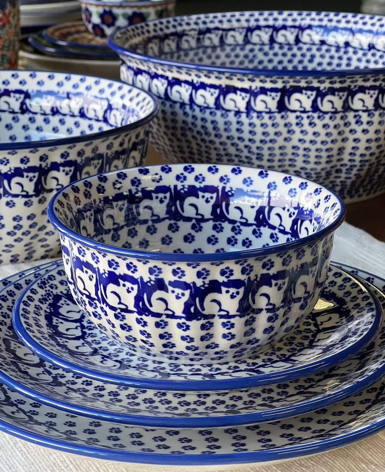 Now, let's talk about the mesmerizing "Kitty Cat Path" pattern. This design is a true work of art, with its intricate details and captivating colors. Predominantly blue, with delicate white accents, it incorporates charming cats that seem to be playfully prancing along a magical path. Every time you sit down for a meal, you'll feel like you're embarking on a whimsical adventure.