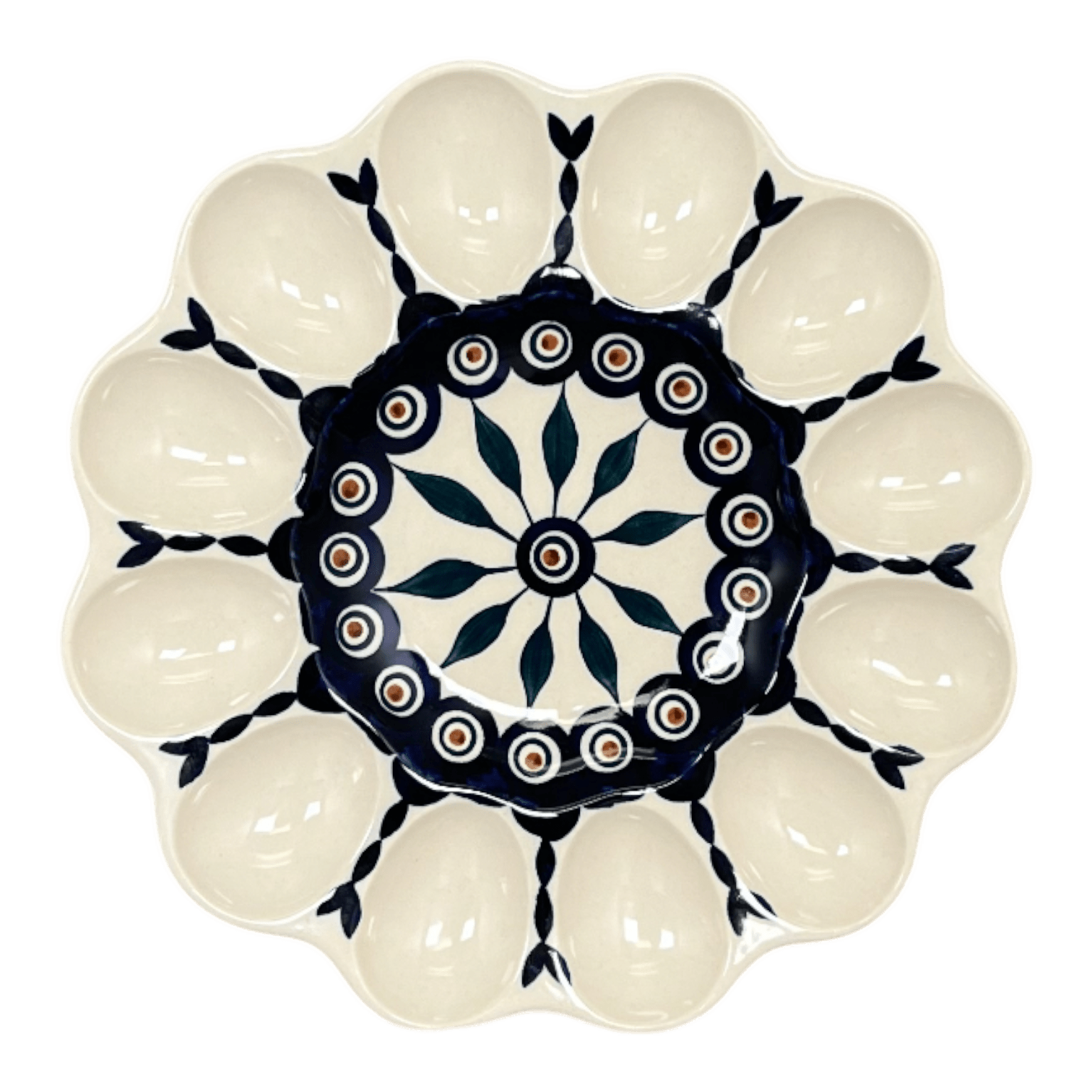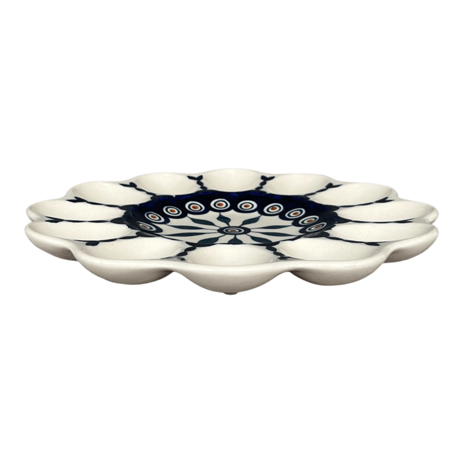The 10.25" Polish Pottery Egg Plate holds 12 deviled eggs. It's a beautiful way to serve your egg hors d'oeuvres. Also perfect for chocolate covered strawberries!