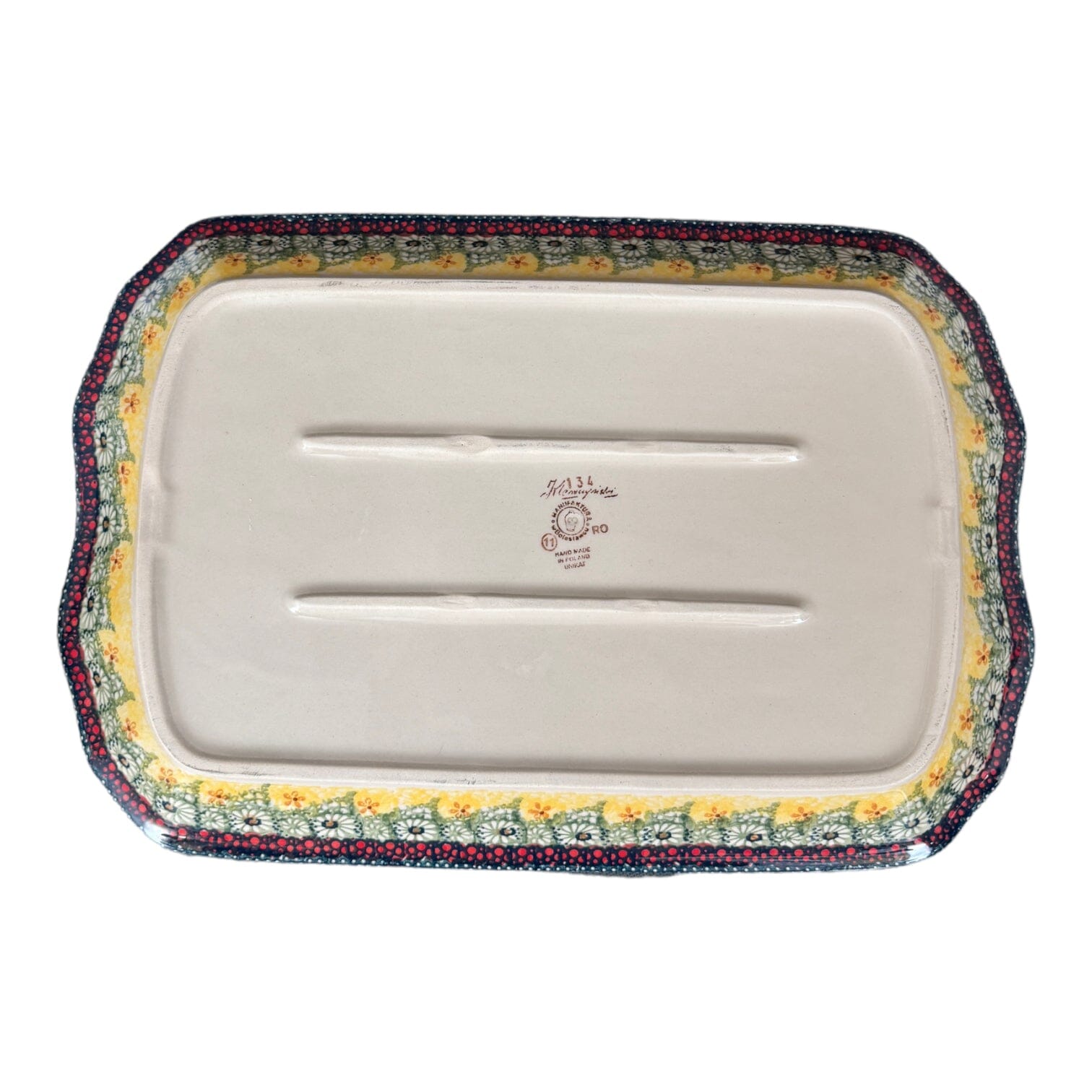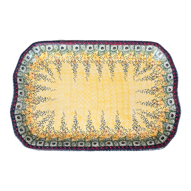 Imagine setting your table with a masterpiece that not only serves your culinary delights but also tells a story of artistry and tradition. Introducing the Polish Pottery Platter from Manufaktura, a stunning rectangular platter that’s sure to be the centerpiece at your next gathering. Whether it's a family dinner or a special celebration, this platter, measuring 11.5" x 17", is perfect for showcasing everything from hors d'oeuvres to decadent desserts. Hand-painted in the vibrant "Sunshine Grotto" pattern, it features a lively yellow backdrop adorned with delicate green and white flowers, punctuated by playful teal dots and orange floral outlines. This piece isn't just a serving item; it’s a conversation starter.