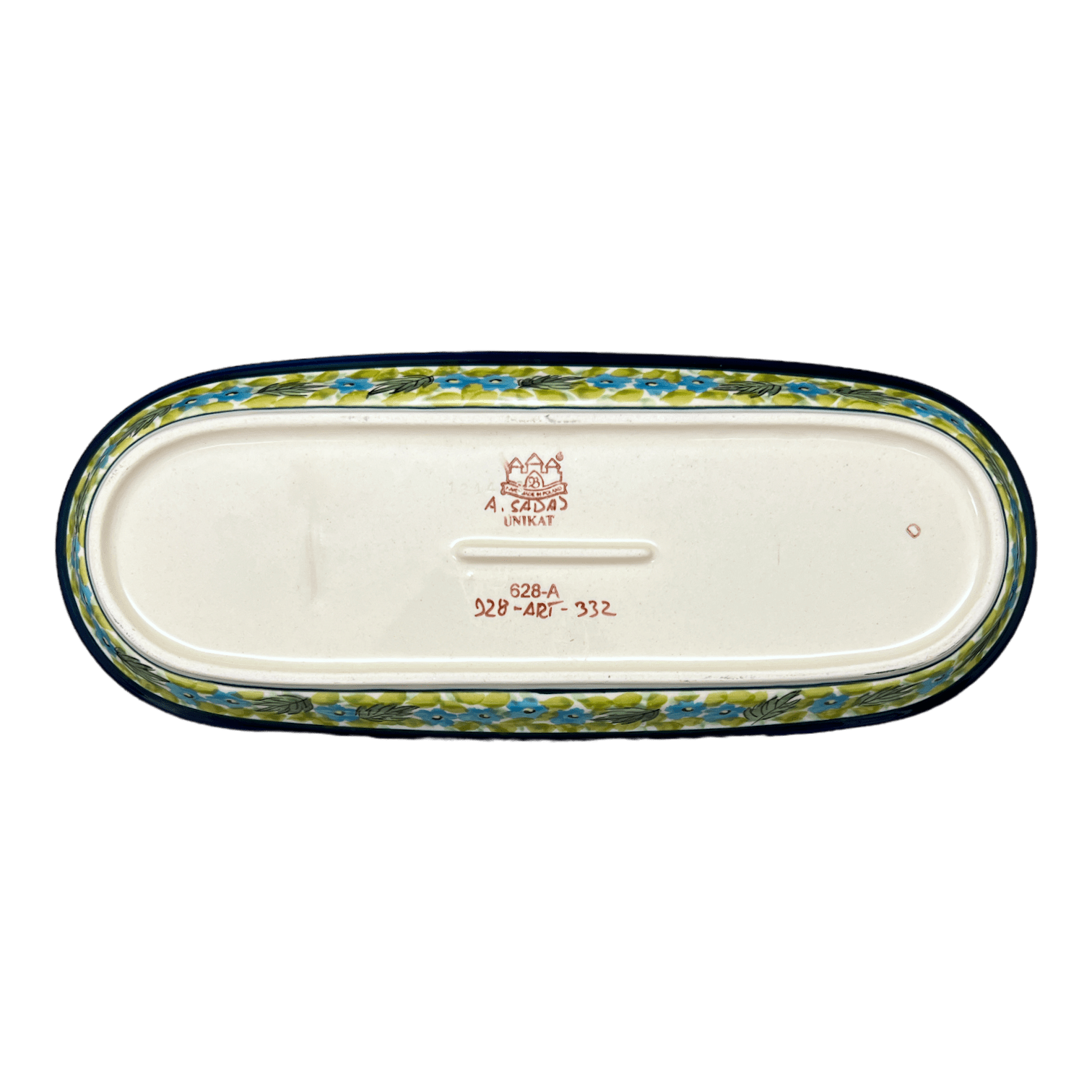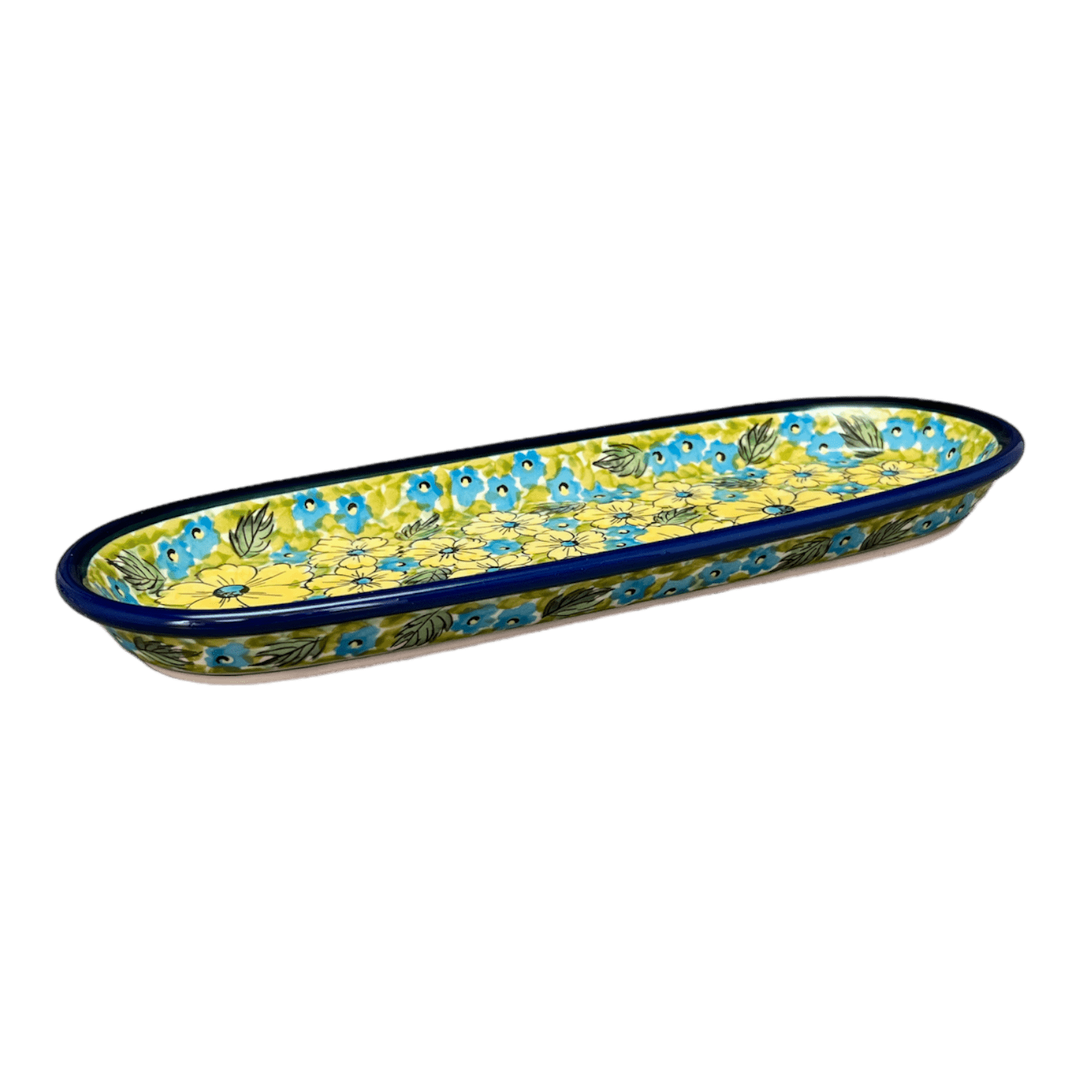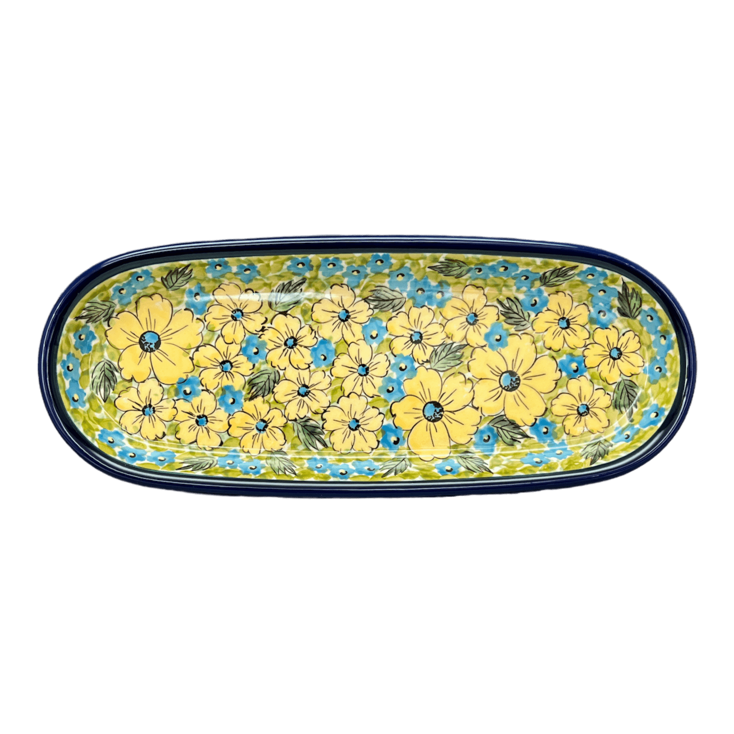 Imagine a serving dish that not only complements your delicious culinary creations but also serves as a centerpiece that captivates your guests with its artistic flair. Enter the Polish Pottery Serving Dish from Zaklady, a true gem in the realm of tableware. Crafted in the vibrant "Sunny Meadow" pattern, this oval dish (11.25" x 4.5") showcases a joyful dance of large yellow flowers and delicate blue blossoms set against a lush green, leafy backdrop. This pattern isn’t just a design; it’s a celebration of color and nature that promises to bring the warmth of a sunny meadow right to your dining table.
