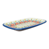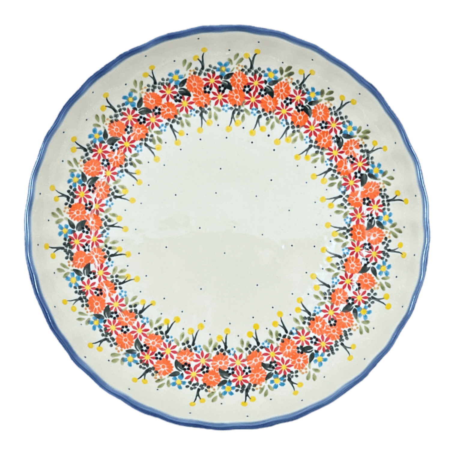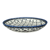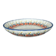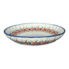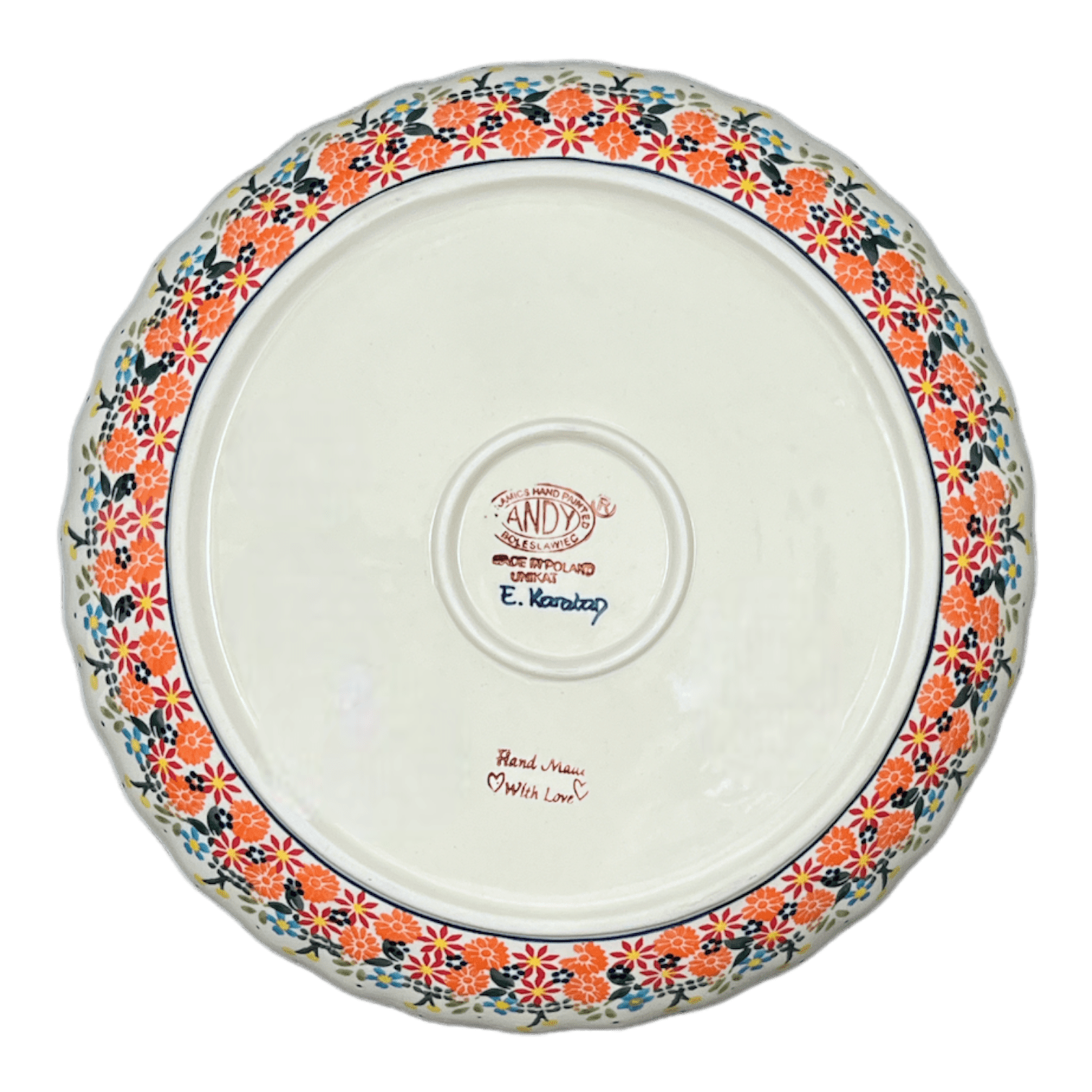 Step into the vibrant world of Polish pottery with this stunning, shallow bowl crafted by the skilled artisans of Andy's family-owned factory in Boleslawiec, Poland. Measuring a generous 12.75 inches in diameter and 2 inches deep, this piece is not just a bowl, but a canvas displaying the lively "Bright Bouquet" pattern. Swirls of orange, red, and light blue flowers dance across a pristine white background, punctuated by tiny blue dots and lush green leaves. This traditional pattern, achieved through the intricate "punching" technique of hand stamping, showcases a bouquet of colors inspired by nature, turning each meal into a festive garden party.