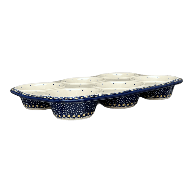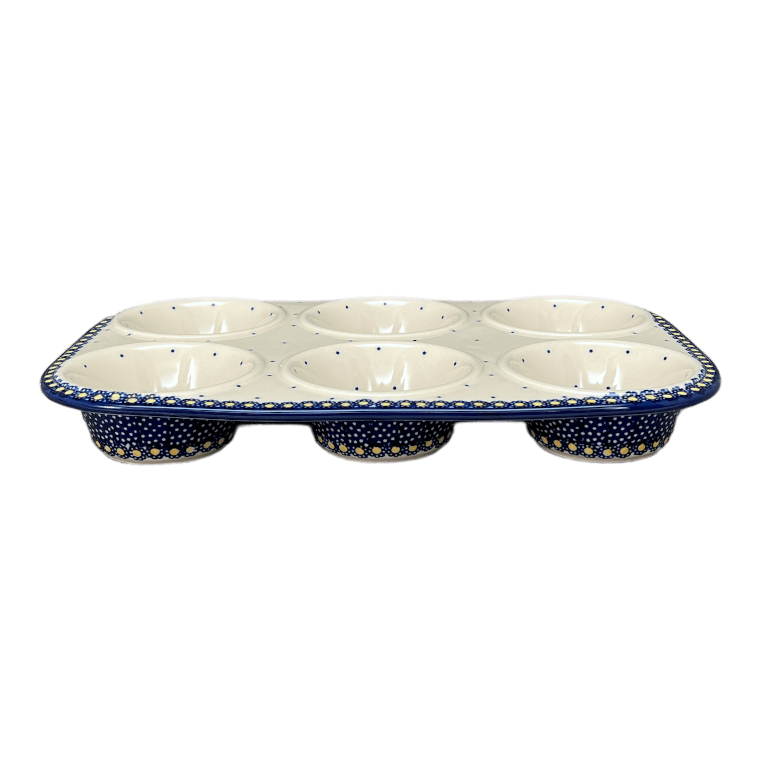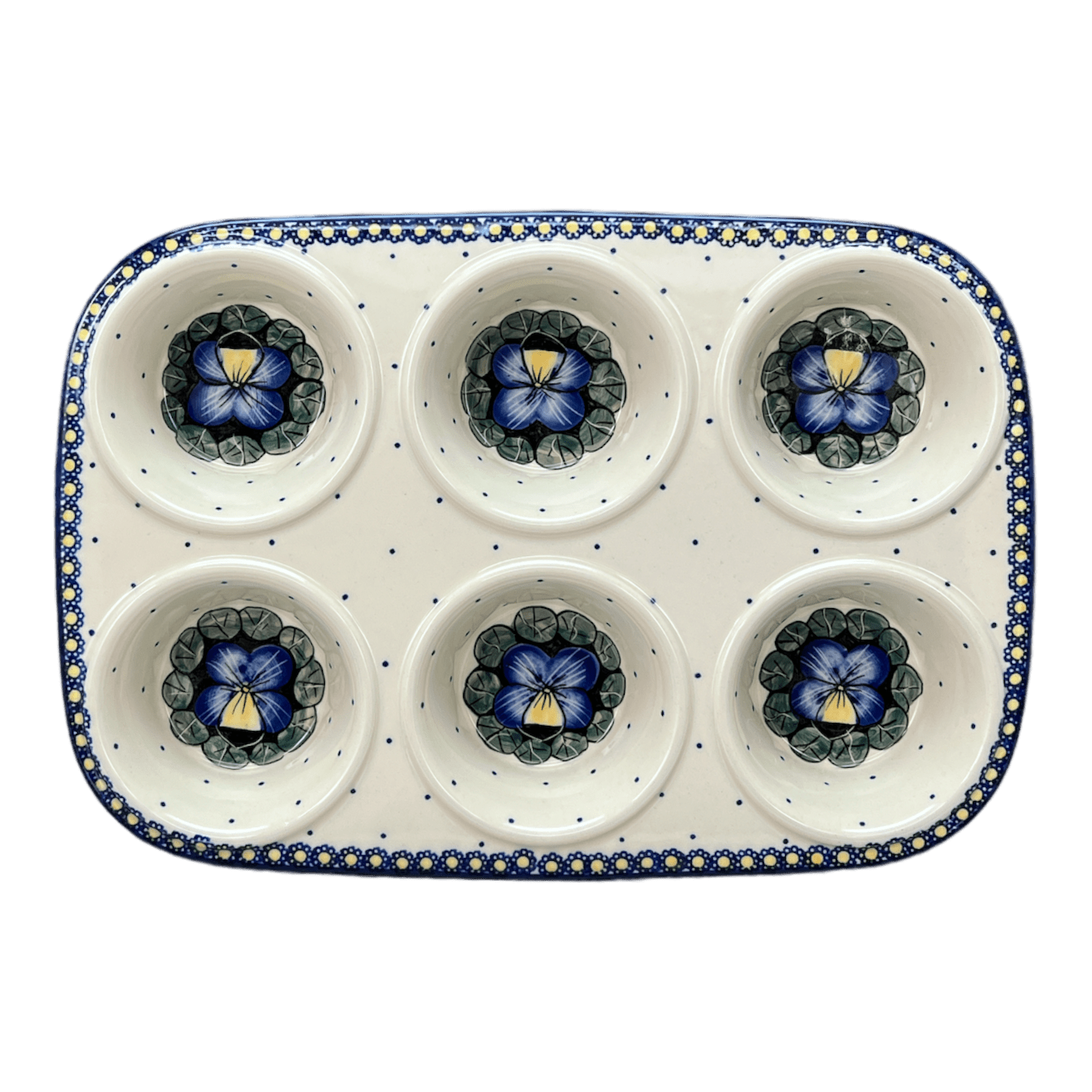 Introducing the enchanting Manufaktura Polish Pottery Muffin Pan, a delightful addition to your baking arsenal that combines utility with a splash of floral elegance. Measuring a convenient 8.5" x 12.5", this pan isn't just any ordinary bakeware. It's a canvas showcasing the exquisite "Pansies" pattern, adorned with vibrant blue, white, and yellow flowers nestled against a backdrop of teal green leaves. The design is sprinkled with whimsical tiny blue dots, adding a playful touch to its sophisticated charm. Each piece is meticulously hand-painted in Boleslawiec, Poland, by skilled artisans who bring this floral fantasy to life, ensuring that no two pieces are exactly alike.