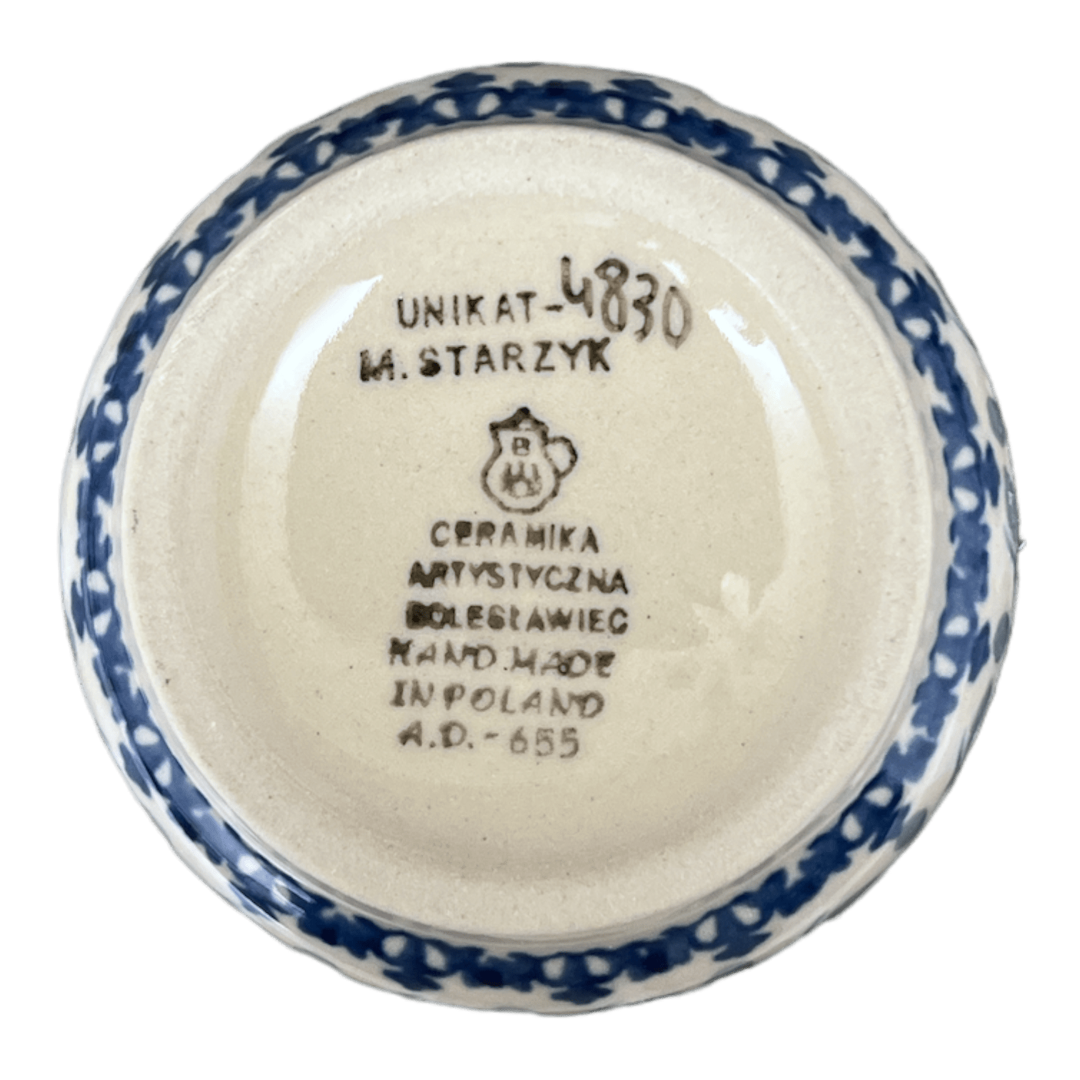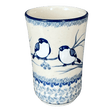 Immerse yourself in the charm and elegance of the Polish Pottery Tumbler, a masterpiece crafted by the renowned Ceramika Artystyczna. This delightful 12 oz tumbler, adorned with the exquisite "Bullfinch on Blue" pattern, transforms every sip into a celebration of artistry. Picture yourself relaxing on a serene afternoon, tumbler in hand, as the whimsical scene of blue bullfinches perched on dusty blue branches unfolds before your eyes. Each bird, painted with meticulous attention to detail, features a striking white chest that pops against the soft blue backdrop, bordered by an intricate design of blue leaves and dots. This isn't just a drinking glass; it's a portal to a world of serene beauty, perfect for enhancing your daily rituals, be it a cool drink or a fresh rinse at the bathroom sink.