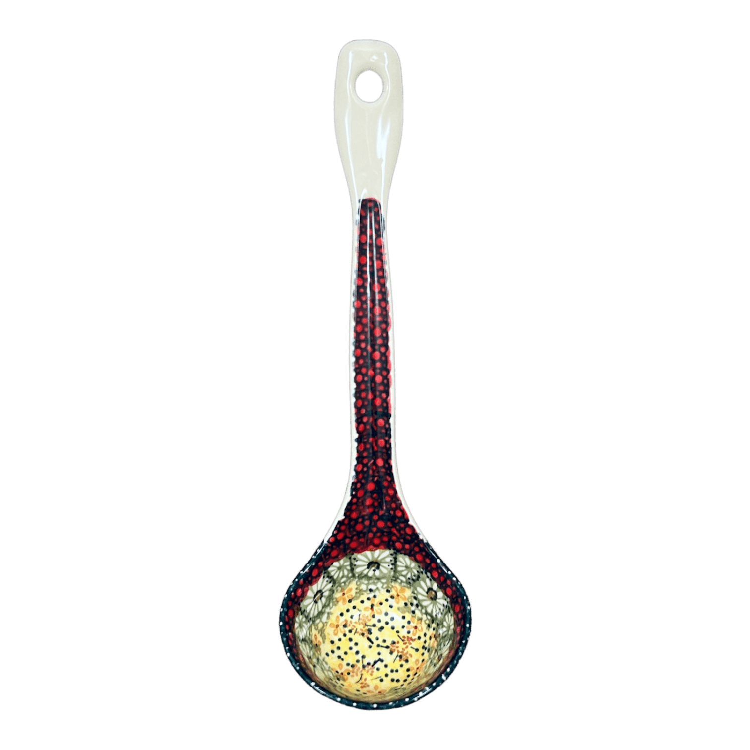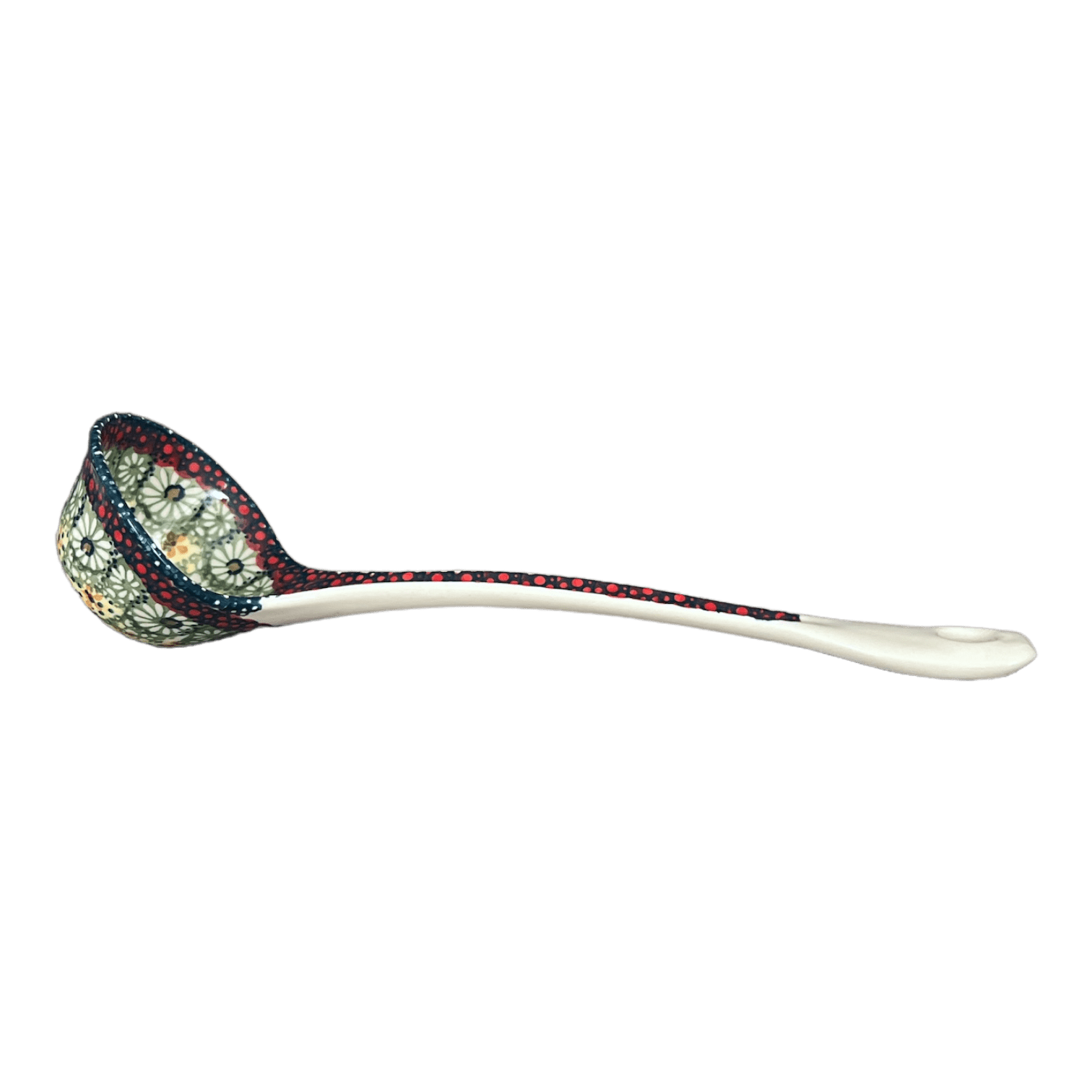 Durable and designed for daily use, this Polish Pottery ladle is safe for the dishwasher, microwave, freezer, and oven (up to 425 degrees). Whether you're whipping up a hearty stew or displaying it as a focal point in your kitchen, this ladle promises both resilience and style. Manufactured by Manufaktura, a leader in the Polish pottery market since 1992, each piece not only adheres to the highest quality standards but also helps to promote Polish cultural heritage around the globe. Add a splash of color and tradition to your home with this enchanting Polish Pottery ladle, and let each scoop be a celebration of art and craftsmanship.