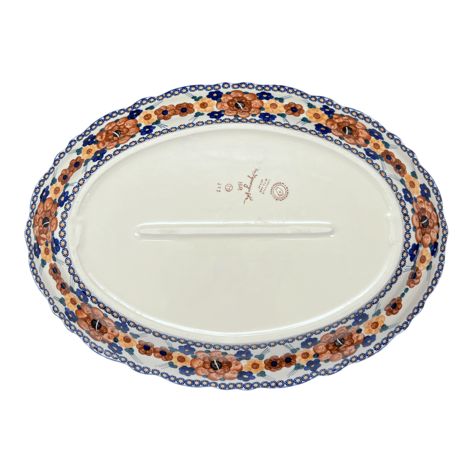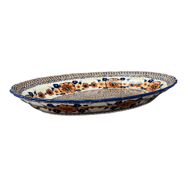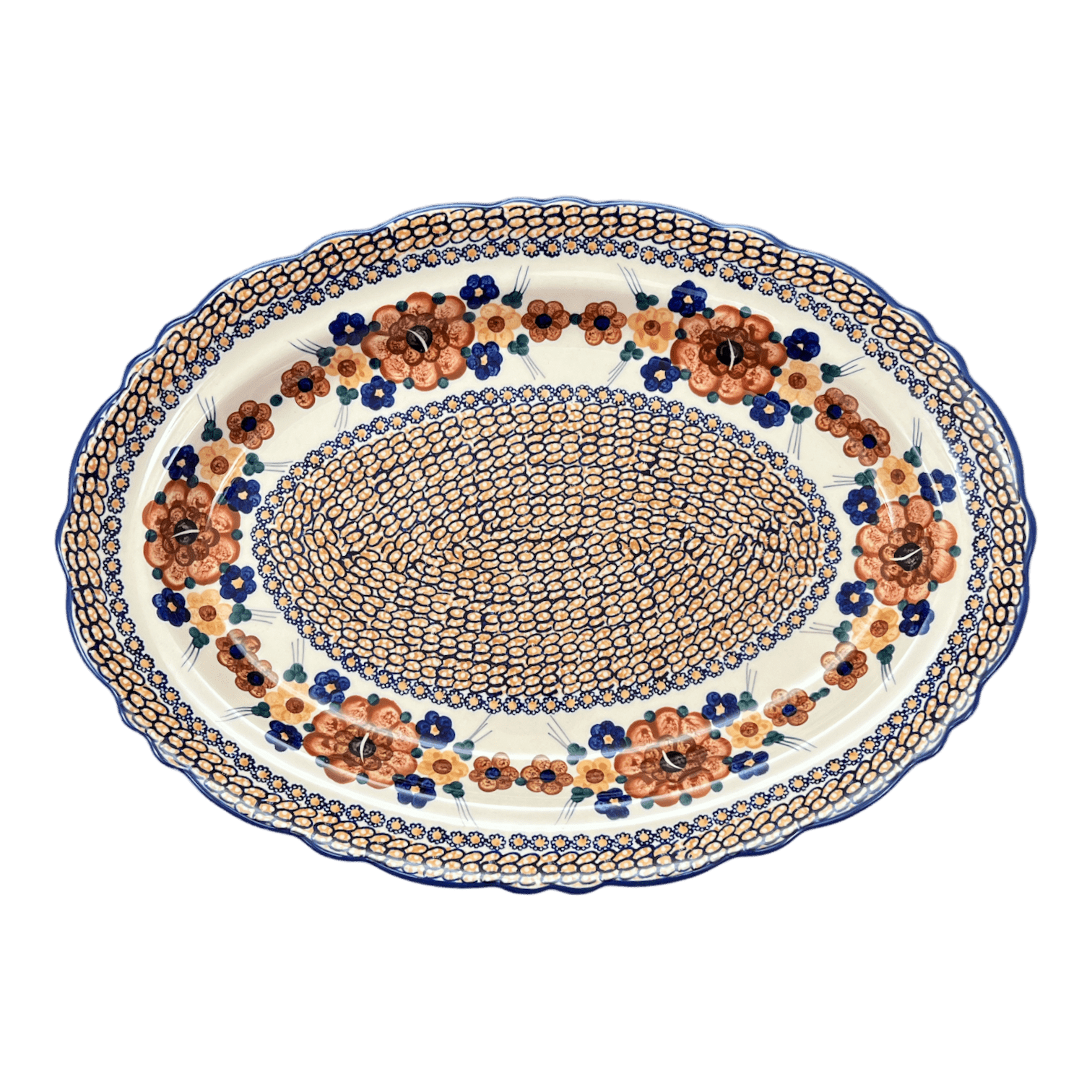 Imagine a centerpiece that not only captivates your guests with its artistic brilliance but also tells a story of exquisite craftsmanship. The Manufaktura Polish Pottery Platter, measuring a generous 16.75" x 12.25", features the charming "Bouquet in a Basket" pattern, which is nothing short of a visual feast. This large oval, scalloped platter is adorned with lush, peach-colored florals, detailed smaller blooms in vibrant shades of blue, yellow, and orange, all beautifully arranged in a basket-like embrace. The pattern, set against a crisp white background with playful blue ovals and tiny white dots, elevates any dining experience, making it both a functional serving piece and a striking decorative element in your home.
