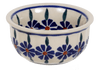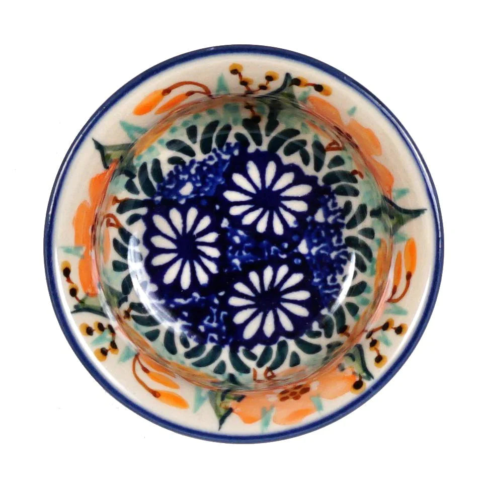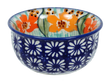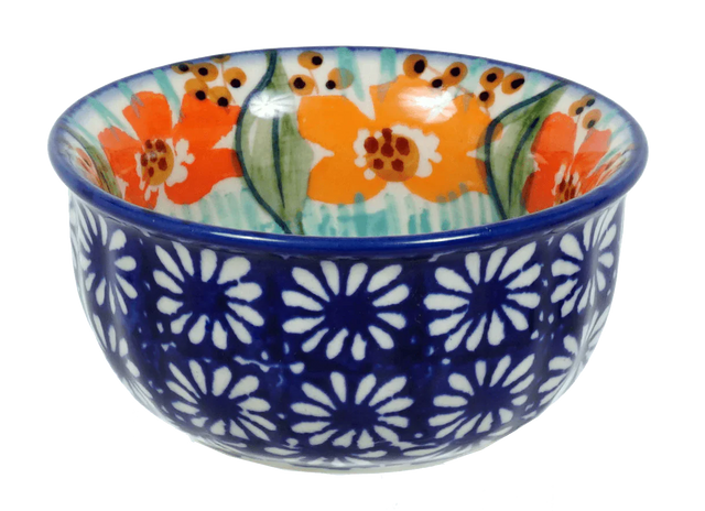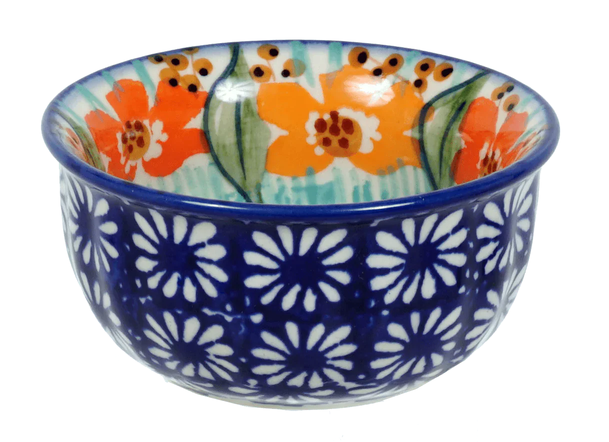 Imagine a piece of art so captivating that it can transform any dining experience into a celebration of color and craftsmanship. Introducing the Polish Pottery Bowl from Manufaktura, measuring a quaint 3.5 inches and painted in the mesmerizing "Sun-Kissed Garden" pattern. This isn't just any bowl; it's a canvas where vivid orange flowers bloom against a deep blue backdrop, accented with delicate green grass and playful white flowers. The slightly scalloped edges add a touch of elegance, making it perfect for serving your favorite dips or using as a charming ramekin. Every glance at this bowl brings a garden to life on your table!