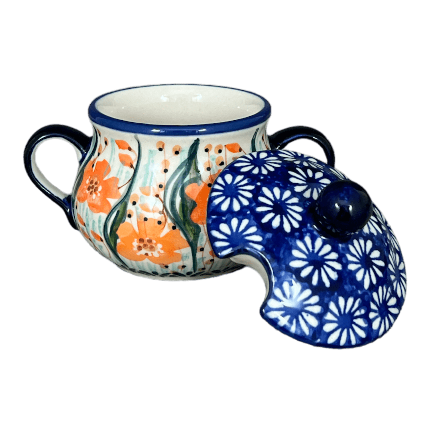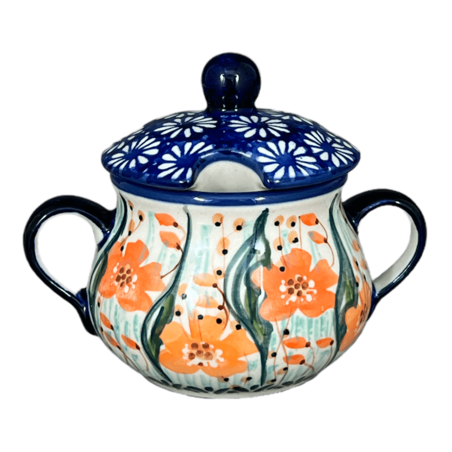 Imagine a splash of vibrant colors and intricate designs adorning your kitchen table, transforming your daily routines into a celebration of artistry. The Polish Pottery Sugar Bowl from Manufaktura is not just any ordinary kitchenware; it's a petite masterpiece, standing proudly at 3.5 inches, wrapped in the exquisite "Sun-Kissed Garden" pattern. This delightful pattern features an enchanting array of small white flowers set against a rich dark blue backdrop, encircled by a lively dance of orange flowers and green tall grass. Each bowl is a canvas, hand-stenciled by top-tier artists who are granted the honor to design under the esteemed "Signature" level of artistry, making every piece a unique collector’s item with the coveted "UNIKAT" stamp of authenticity.