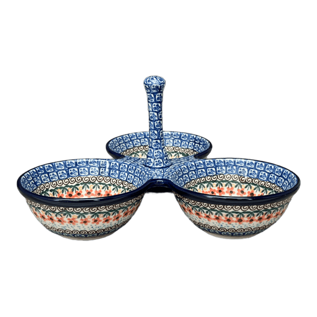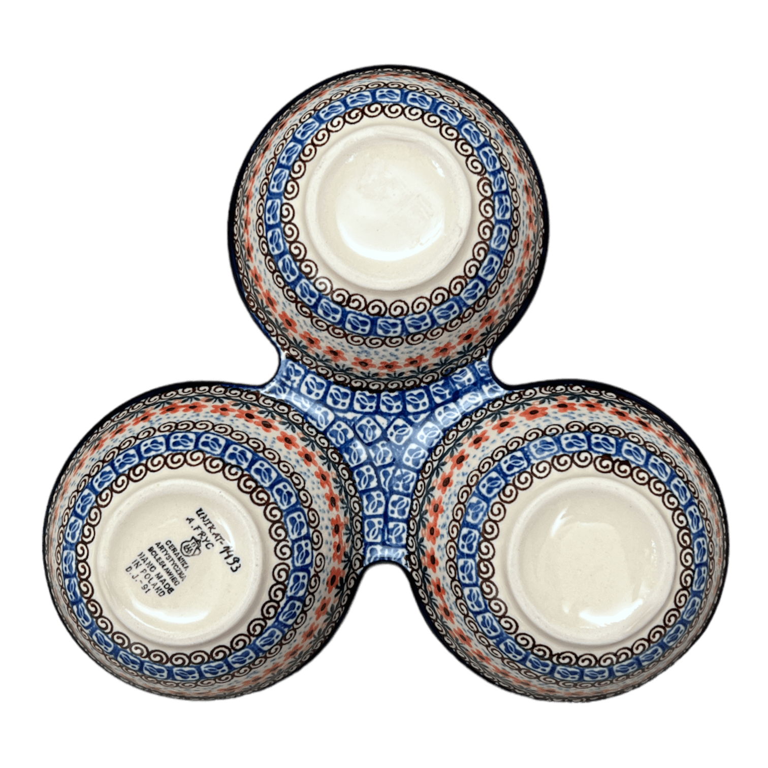This particular piece is a testament to the unparalleled craftsmanship of the artists at Ceramika Artystyczna, a prestigious workshop established in 1950 in Boleslawiec, Poland. Each bowl in this server is a product of a 'Signature' artist's meticulous work, from inception to final touch. These artists, who represent the pinnacle of pottery artistry, have the rare privilege of crafting their unique designs from scratch and overseeing each step of the production process. The rarity and exceptional quality of these designs make them highly sought-after collector's items, each stamped with the "UNIKAT" mark, guaranteeing its authenticity and singularity. Whether used for serving multiple dips, snacks, or desserts, this server promises not only utility but also a story of artistic mastery and tradition.