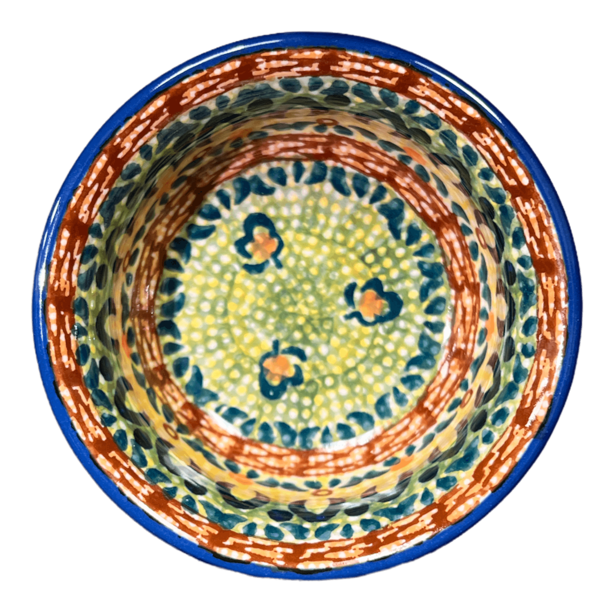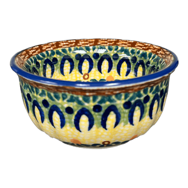 Introducing the exquisite Polish Pottery Bowl from Manufaktura, a charming addition to any kitchen or dining room! Crafted in the heart of Boleslawiec, Poland, this delightful bowl is more than just a dish; it's a small masterpiece. Measuring 3.5 inches in diameter and standing 2 inches tall, it's the perfect size for serving dips, sauces, or your favorite snacks. The unique "Baltic Garden" pattern adorning this bowl is a vibrant tapestry of geometric shapes predominantly in lush green, with cheerful yellow and rich brown accents, bringing a splash of color and sophistication to your table setting.