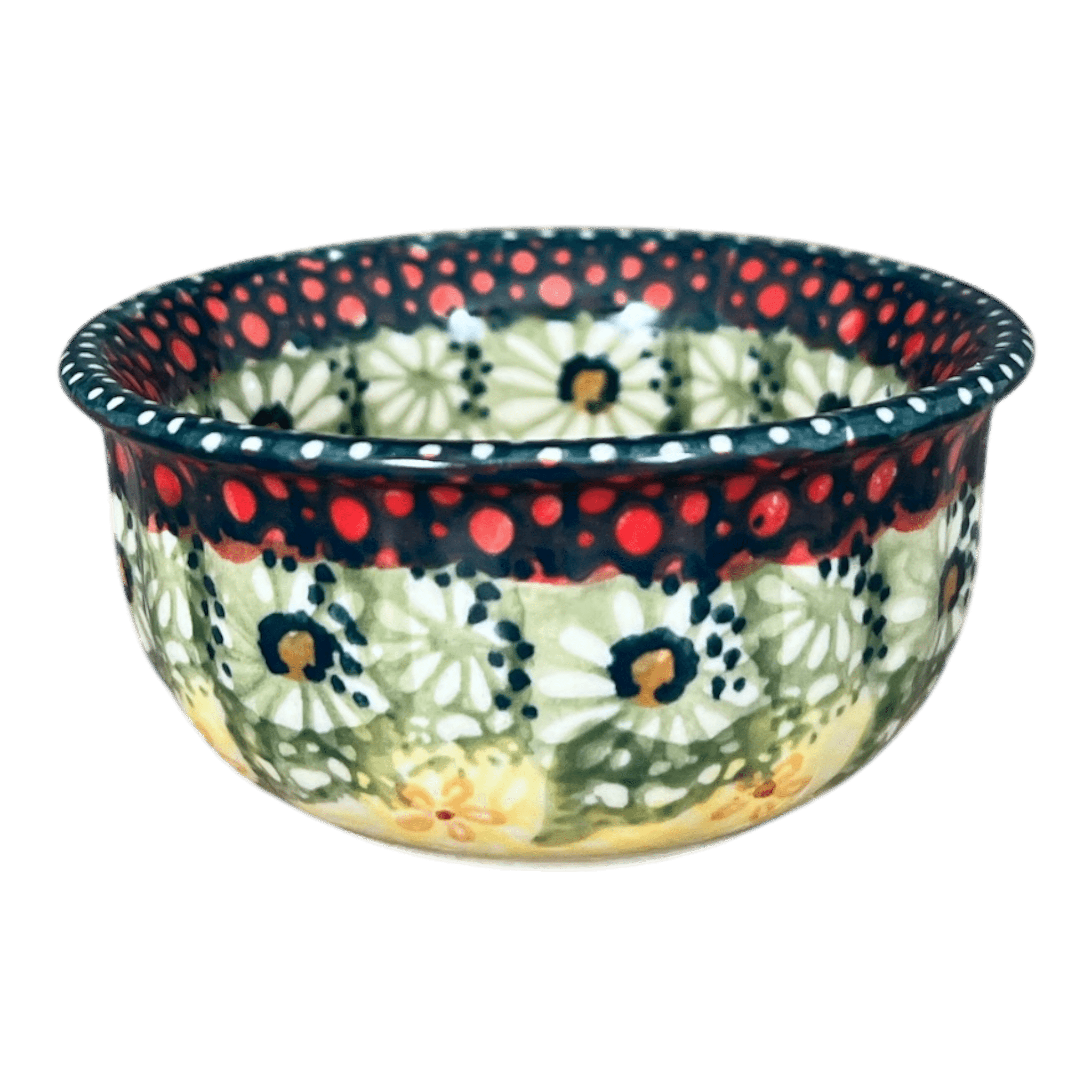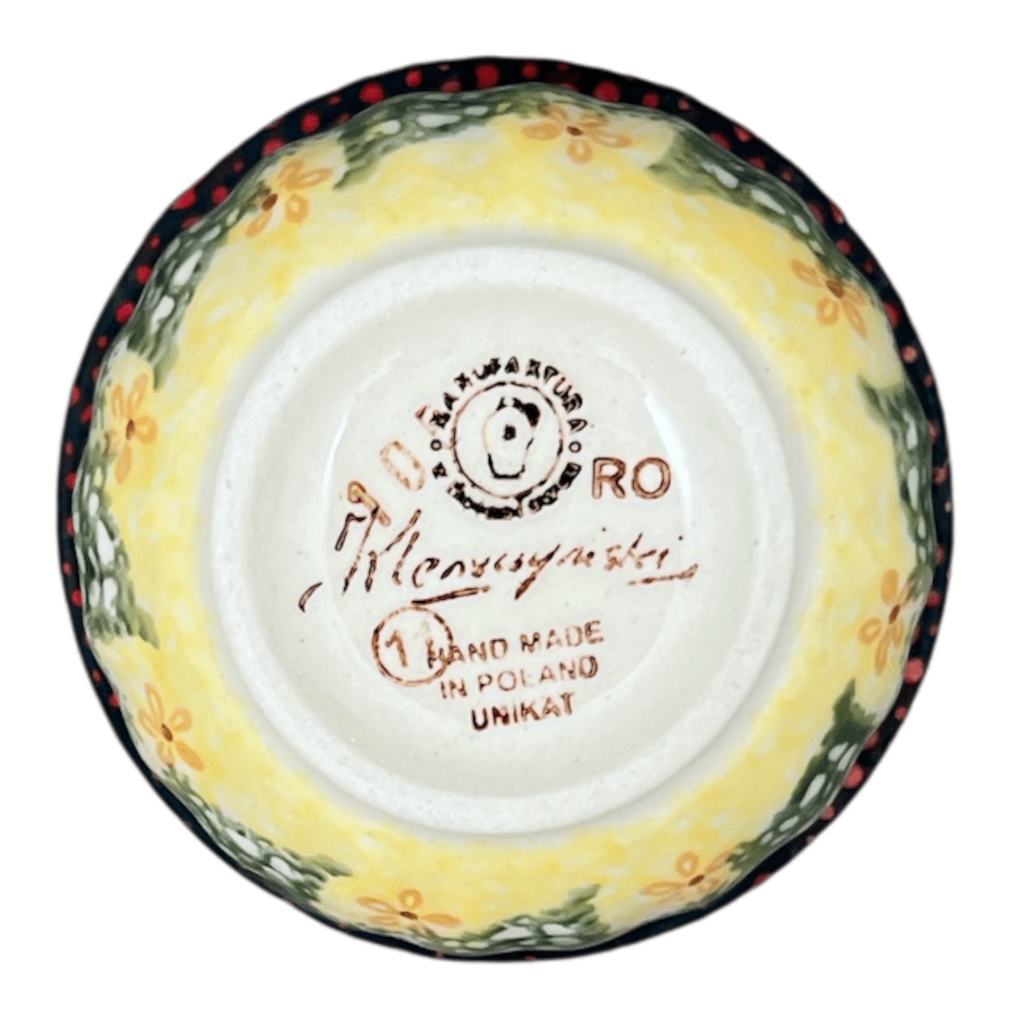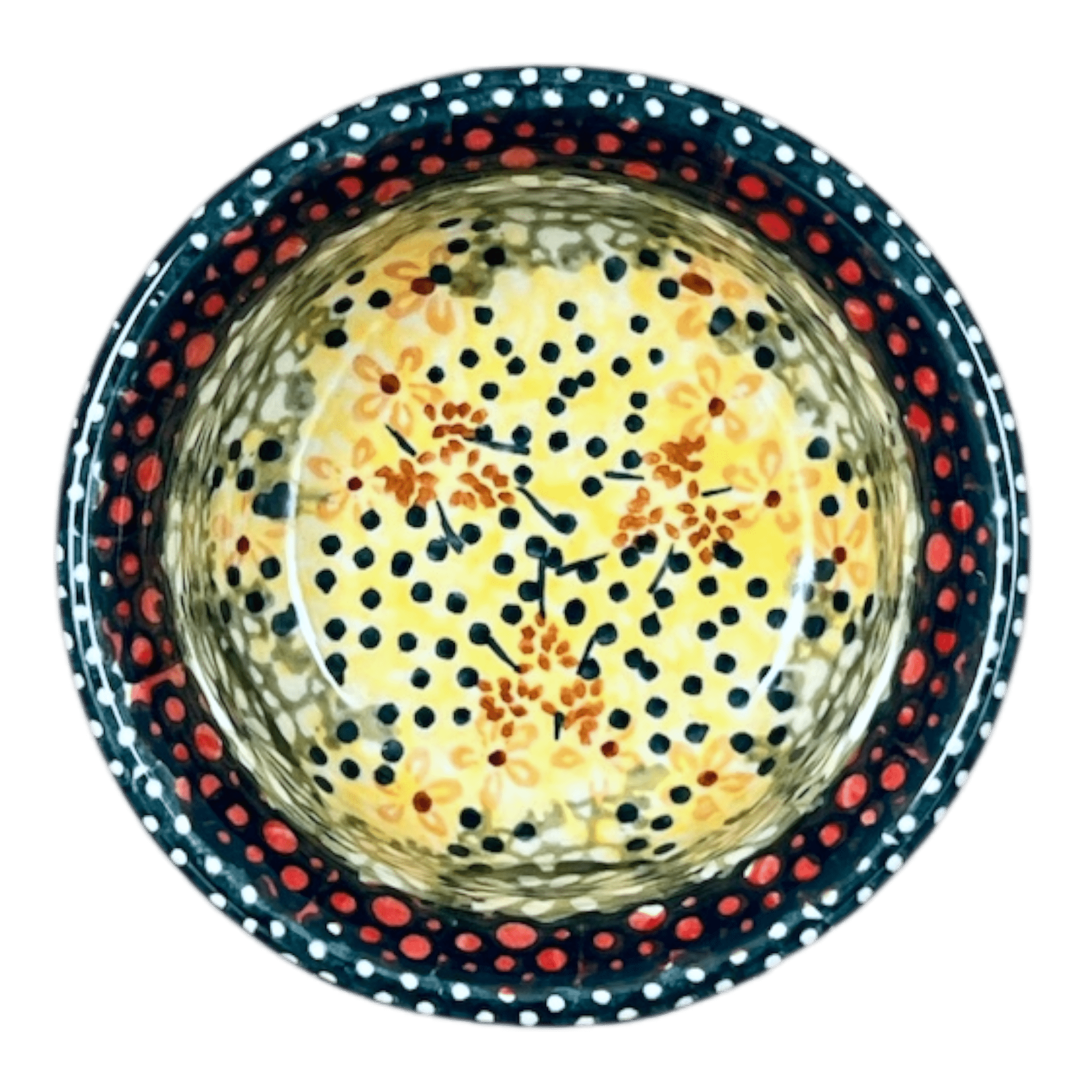 Introducing the enchanting Manufaktura Polish Pottery Bowl, a delightful masterpiece that transcends ordinary kitchenware. This 3.5-inch round bowl, affectionately known as the "Sunshine Grotto" (WK52), dazzles with its vibrant yellow backdrop and exquisite floral motifs. Designed as the perfect ramekin or dipping bowl, its slightly scalloped edges whisper tales of old-world craftsmanship. Picture this: a cozy Sunday brunch, where your table bursts into life with the splashes of green and red accents, and tiny teal dots that dance around the edges, leading the eye on a merry chase towards the center.