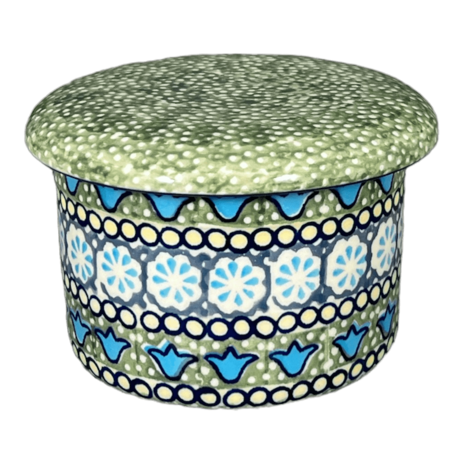 Imagine a dash of old-world charm right on your kitchen counter with the delightful Polish Pottery Butter Crock from Manufaktura. Crafted in the heart of Boleslawiec, Poland, this exquisite piece isn't just a container; it's a portal to a tradition of artisan craftsmanship. At a practical 4.5" in diameter and standing 3" tall, this butter crock features the enchanting "Blue Bells" pattern. The design intricately combines geometric shapes predominantly in green, with light blue and yellow accents, enveloping tiny white dots and simple, serene light blue bellflowers. This unique artwork doesn’t just store butter; it tells a story of artistic mastery right from your dining table or kitchen counter.