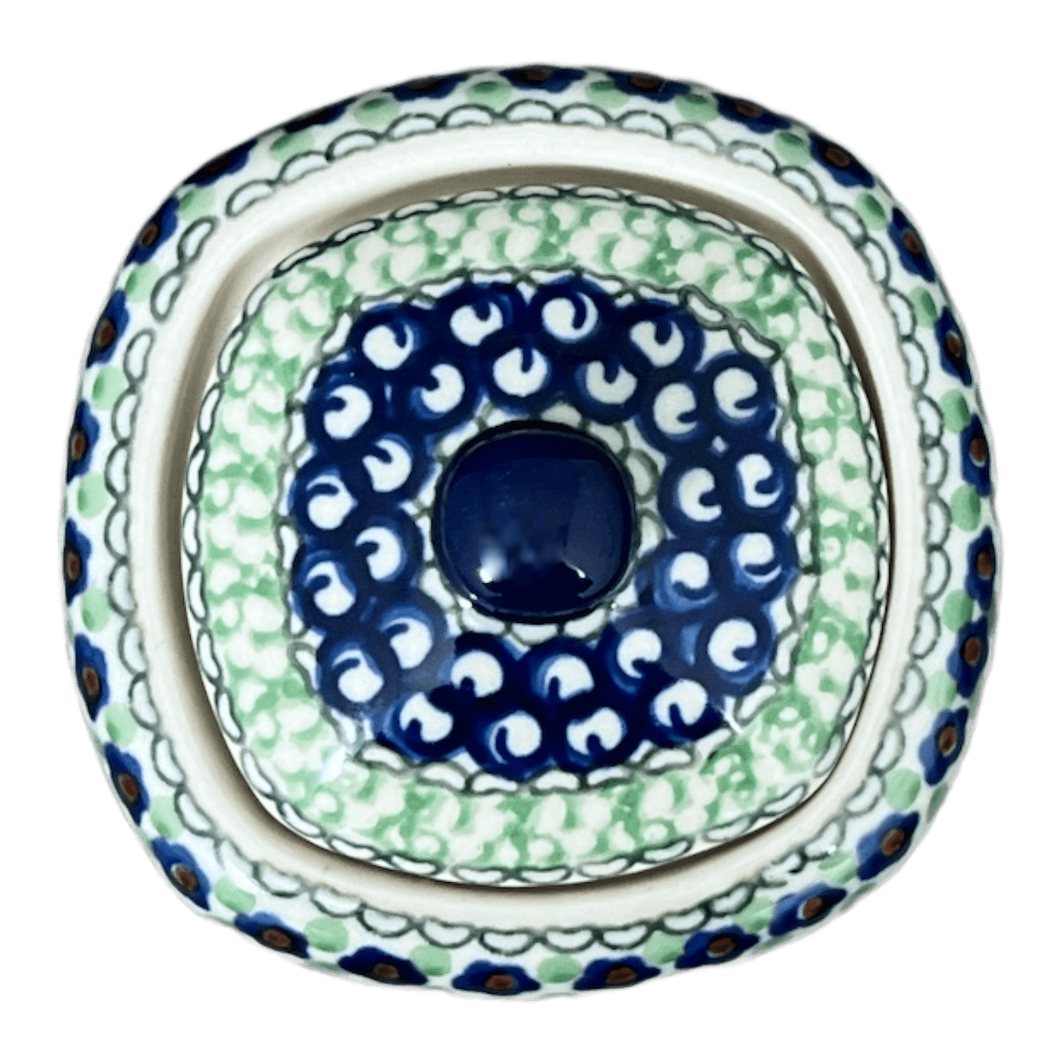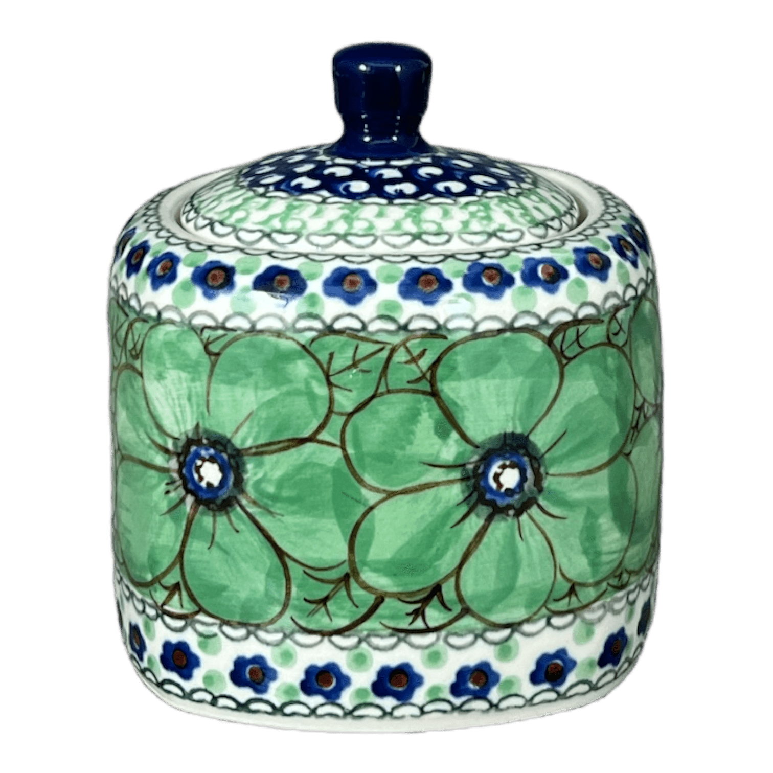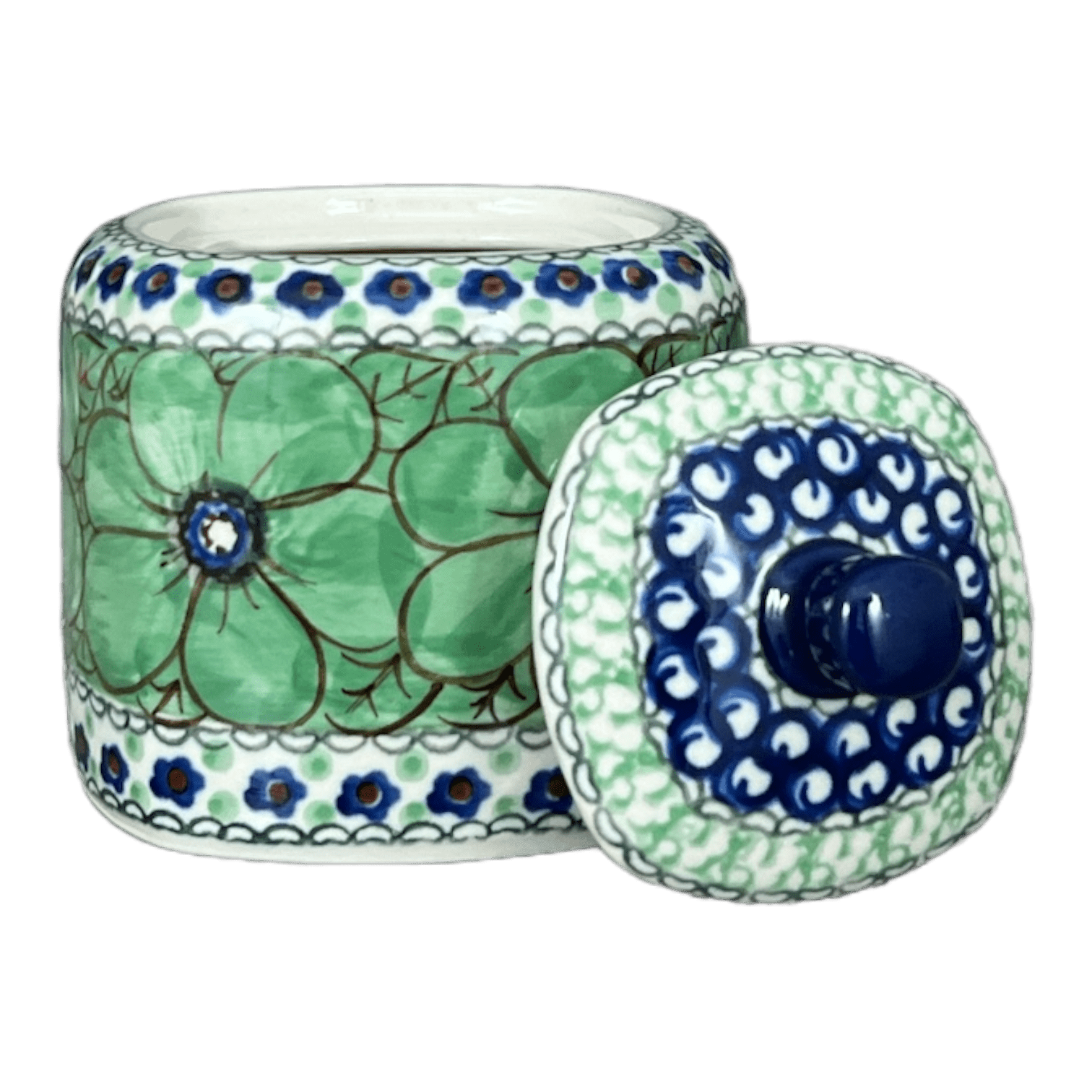 Introducing the enchanting "Green Goddess" Polish Pottery Sugar Bowl, a splendid creation by the master artisans at Ceramika Artystyczna. This exquisite square bowl, measuring 4 inches with its lid on, is a canvas of vibrant greens accented with serene blues and crisp whites. The design features opulent, large green flowers surrounded by a charming border of petite blue blossoms and swirling green and blue tendrils. Each piece, hand-painted in the heart of Boleslawiec, Poland, is a testament to the unique artistry and skill that Ceramika Artystyczna is renowned for worldwide.