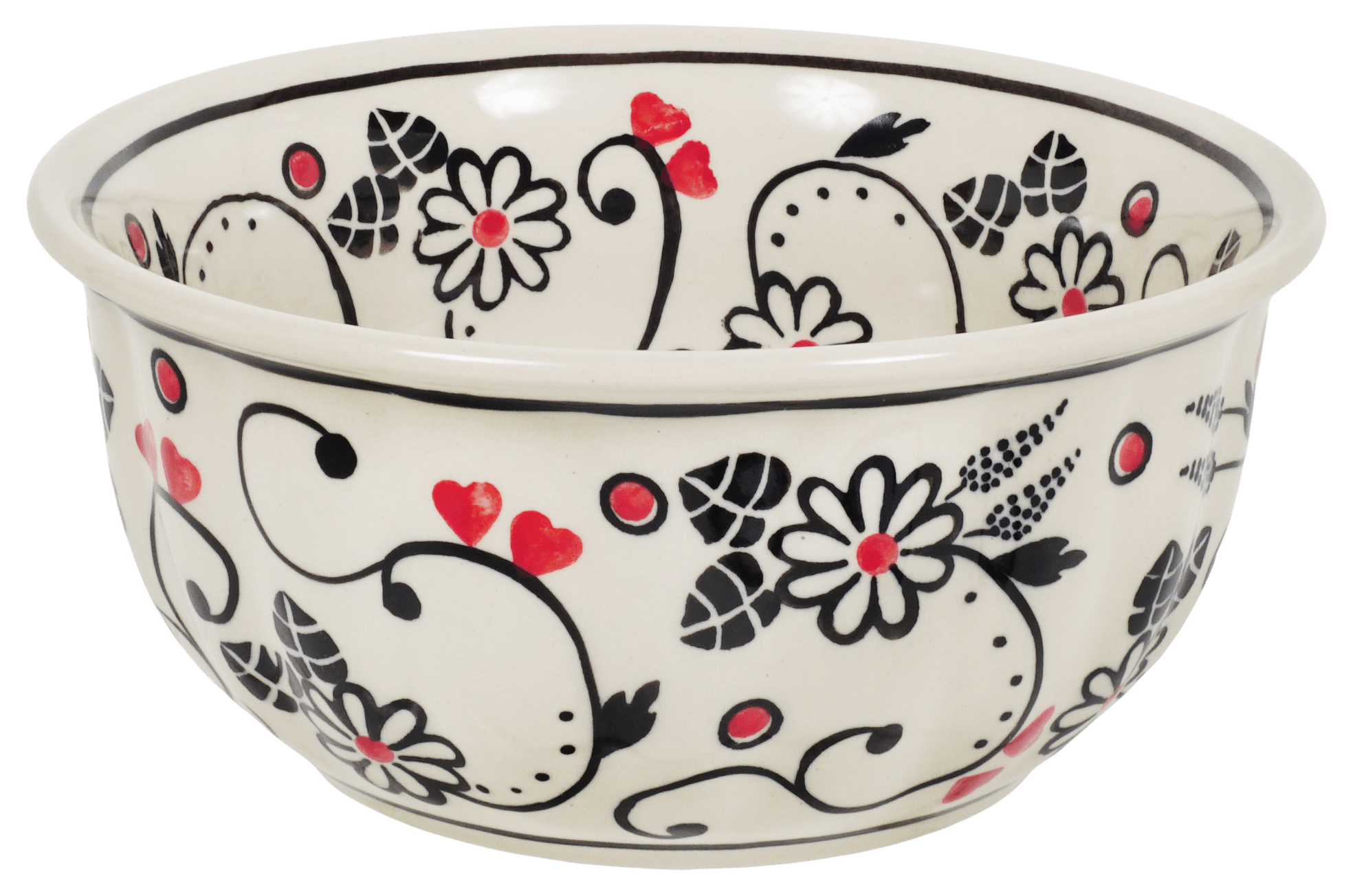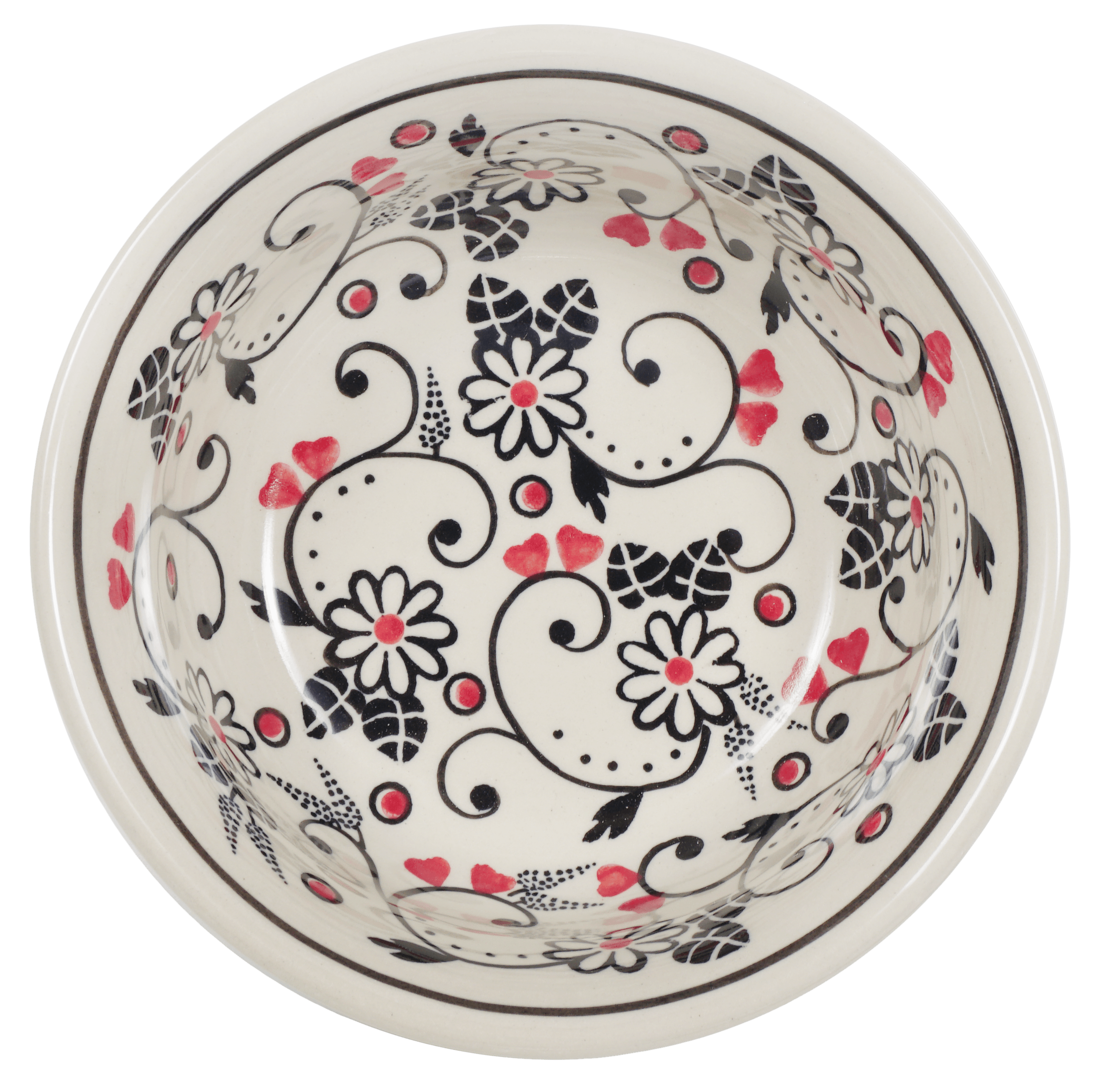 The "Night Garden" pattern is a whimsical fusion of Flowers and Hearts, delicately painted in a predominantly White color with striking accents in Black and Red. The intricate design elements create a mesmerizing display that will surely capture the attention of your guests. Each piece is meticulously crafted by skilled artisans in Boleslawiec, Poland, ensuring that you are getting a truly unique and authentic work of art.