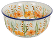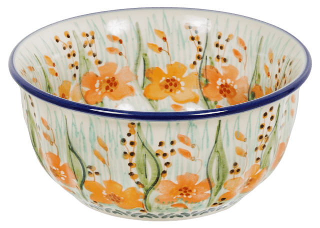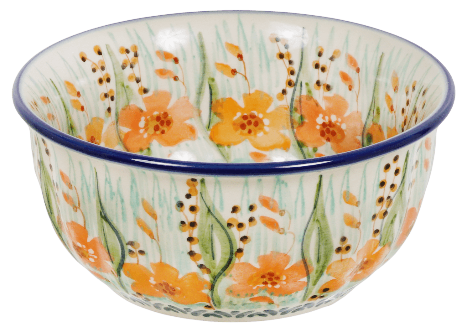 Imagine serving your favorite warm soup or a chilled dessert in a bowl that is not just a container, but a piece of art. Introducing the Polish Pottery Bowl from Manufaktura, adorned with the enchanting "Sun-Kissed Garden" pattern. This delightful 5.5-inch bowl is your new go-to for everything from cereals and side salads to indulgent ice cream and individual desserts. The "Sun-Kissed Garden" pattern bursts with vibrant flowers in predominantly orange hues, accented with touches of blue, green, and white. Small, delicate white flowers dance against a dark blue background in the center, surrounded by a lively band of detailed orange flowers and tall green grass, encapsulating the essence of a blooming garden at dawn.