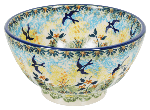 Imagine a touch of elegance and vibrant color gracing your dining table, all encapsulated in a charming 5.5" Polish Pottery Bowl from Manufaktura. Known for their exquisite craftsmanship, this bowl is part of the "Soaring Swallows" collection, a pattern that paints the serene ballet of swallows in flight amidst a lively floral backdrop. Not just a feast for the eyes, these ridged bowls are the perfect vessels for everything from a hearty soup to your favorite ice cream, making every meal a picturesque occasion.