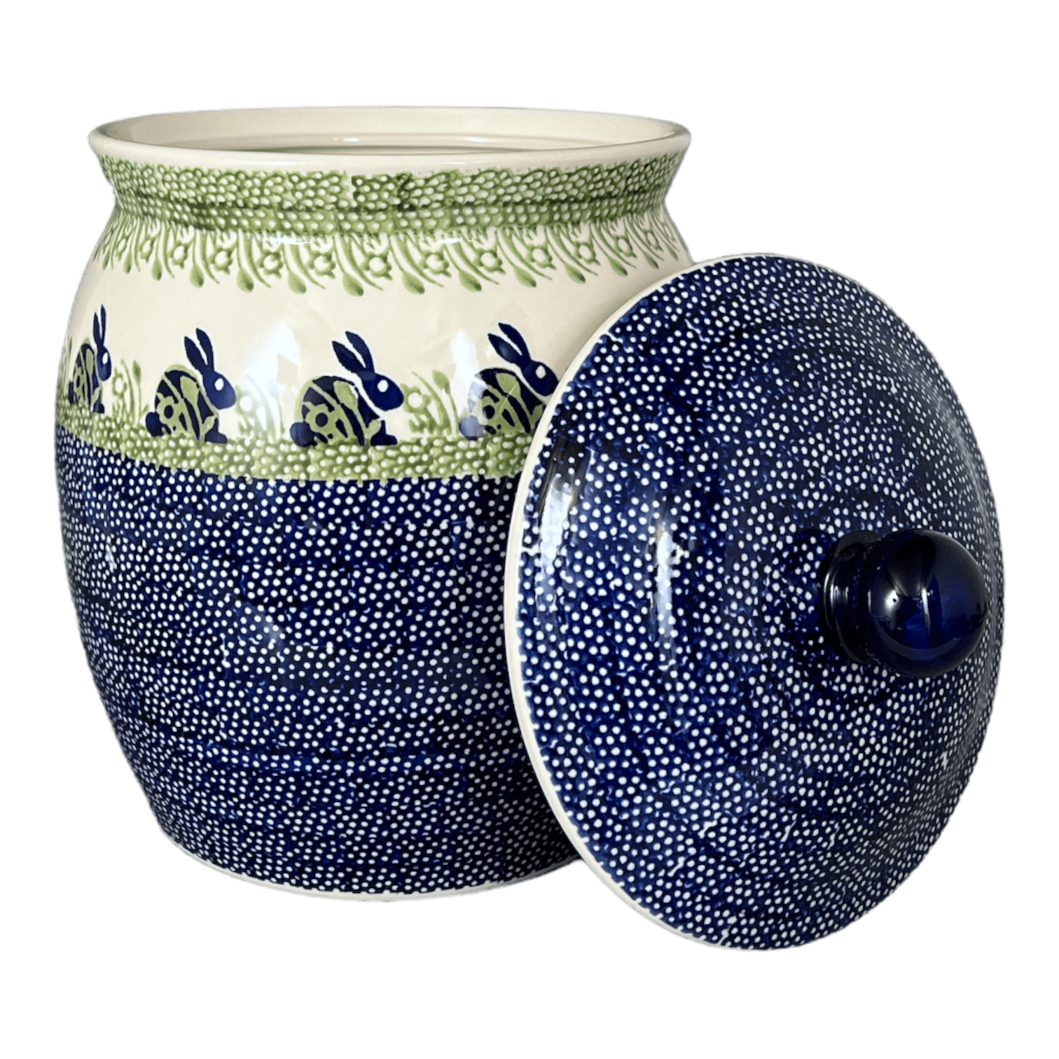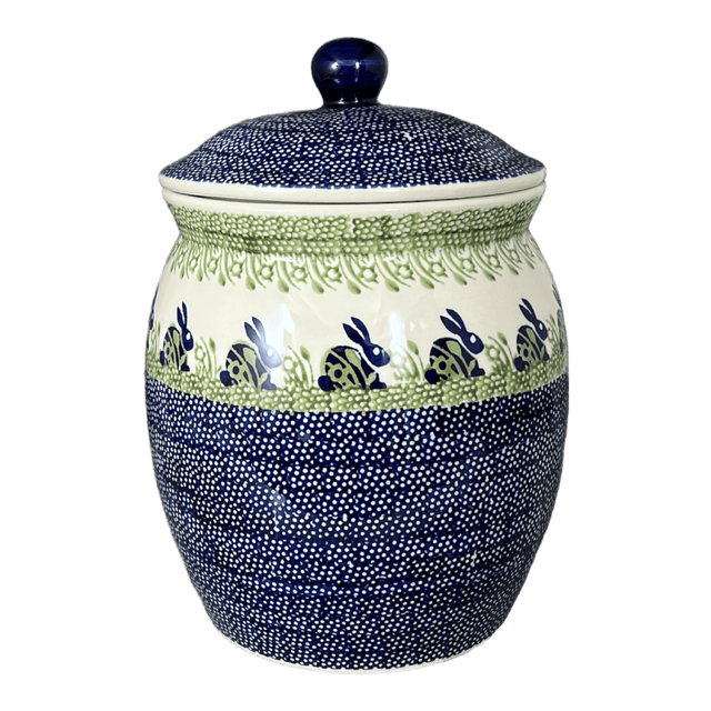 Introducing the stunning Polish Pottery 5 Liter Canister by Manufaktura in the whimsical "Bunny Love" pattern (P324). This delightful canister is not only a functional storage solution, but also a charming piece of art that will bring a touch of joy to your kitchen.
