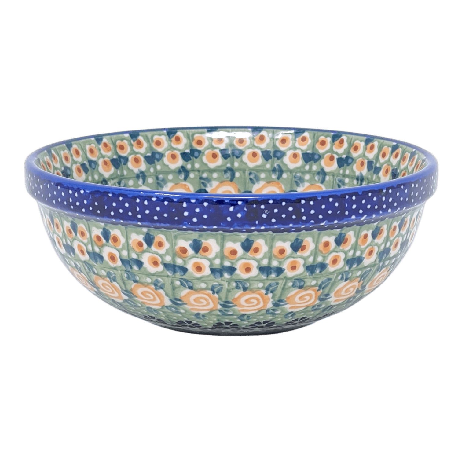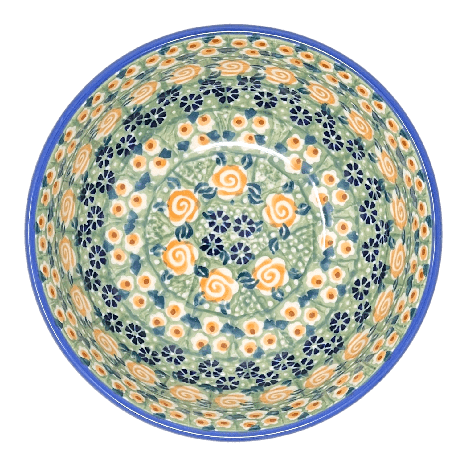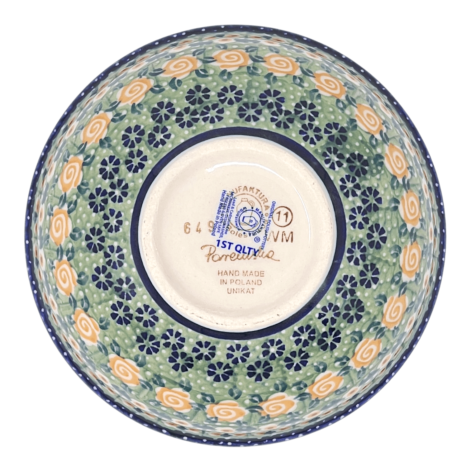 Let's talk about the "Perennial Garden" pattern, shall we? Picture this: a vibrant green background adorned with delicate bands of dainty white and orange flowers, playful orange swirls, and charming blue blossoms gracefully circling around the center. It's like having a piece of Mother Nature's garden right in the palm of your hand! This pattern is no ordinary creation; it falls under the prestigious Signature level of artistry. Only the crème de la crème of artists earn the privilege of crafting their own designs from start to finish, and they pour their heart and soul into every piece they create. That's why each bowl in this pattern bears the coveted "UNIKAT" stamp and the artist's signature - a true testament to their dedication and skill.