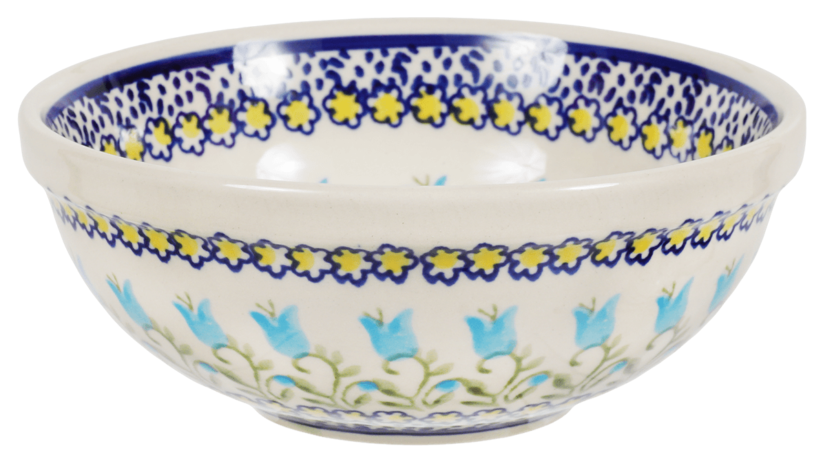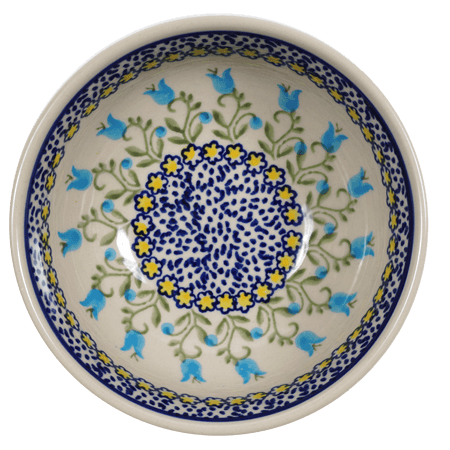 Imagine starting your day with a splash of artisan charm or wrapping up a cozy evening with a touch of whimsy. The Manufaktura 6" Polish Pottery Bowl, adorned with the captivating "Riverdance" pattern, transforms everyday dining into a delightful experience. This charming bowl, perfect for your morning cereal, a hearty soup at lunch, or a refreshing salad at dinner, marries functionality with sheer beauty. Its enchanting design, featuring light blue bellflowers twining around a white background speckled with tiny blue leaves, brings the magic of a floral dance right to your table.