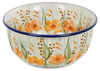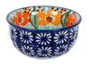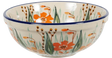 Each bowl is a masterpiece, stamped with the prestigious "UNIKAT" mark, signifying its status as a Signature piece—a testament to the highest level of artistry achieved by the Manufaktura artists in Boleslawiec, Poland. These skilled artisans not only design but also oversee the entire production process of their creations, ensuring that every piece is a unique work of art. The small white flowers set against a dark blue background in the center, surrounded by intricate orange flowers and tall green grass, encapsulate a meticulous attention to detail that has made these pieces highly coveted among collectors and admirers of fine pottery.
