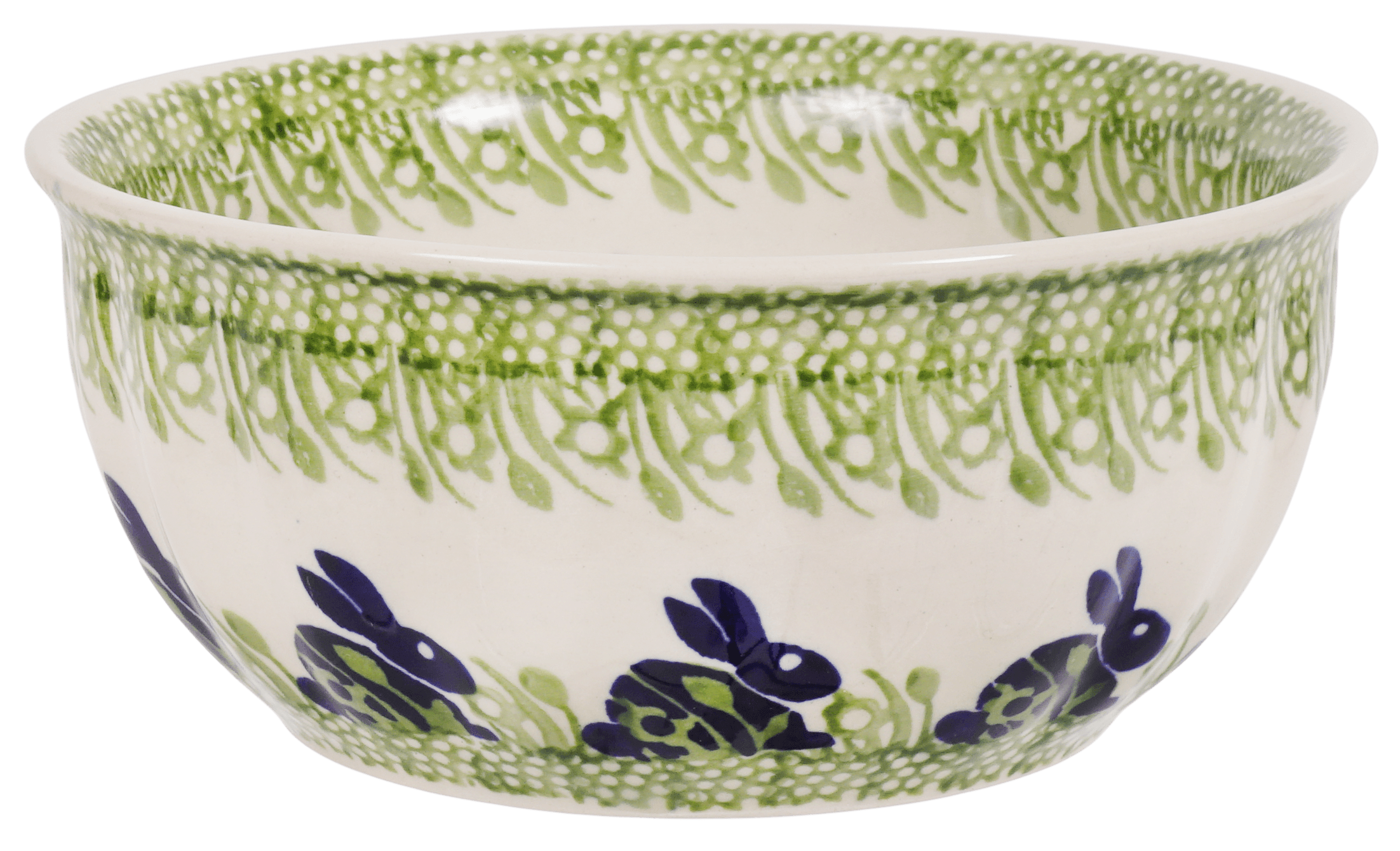 Introducing the Polish Pottery 6.5" Bowl by Manufaktura, the perfect addition to your kitchenware collection! Not only is this bowl functional, but it is also a work of art. The "Bunny Love" pattern is simply adorable, featuring cute bunnies and grass in a refreshing green color with accents in blue and white. It will instantly brighten up your dining table and bring a smile to your face.