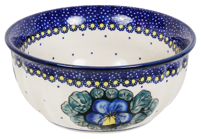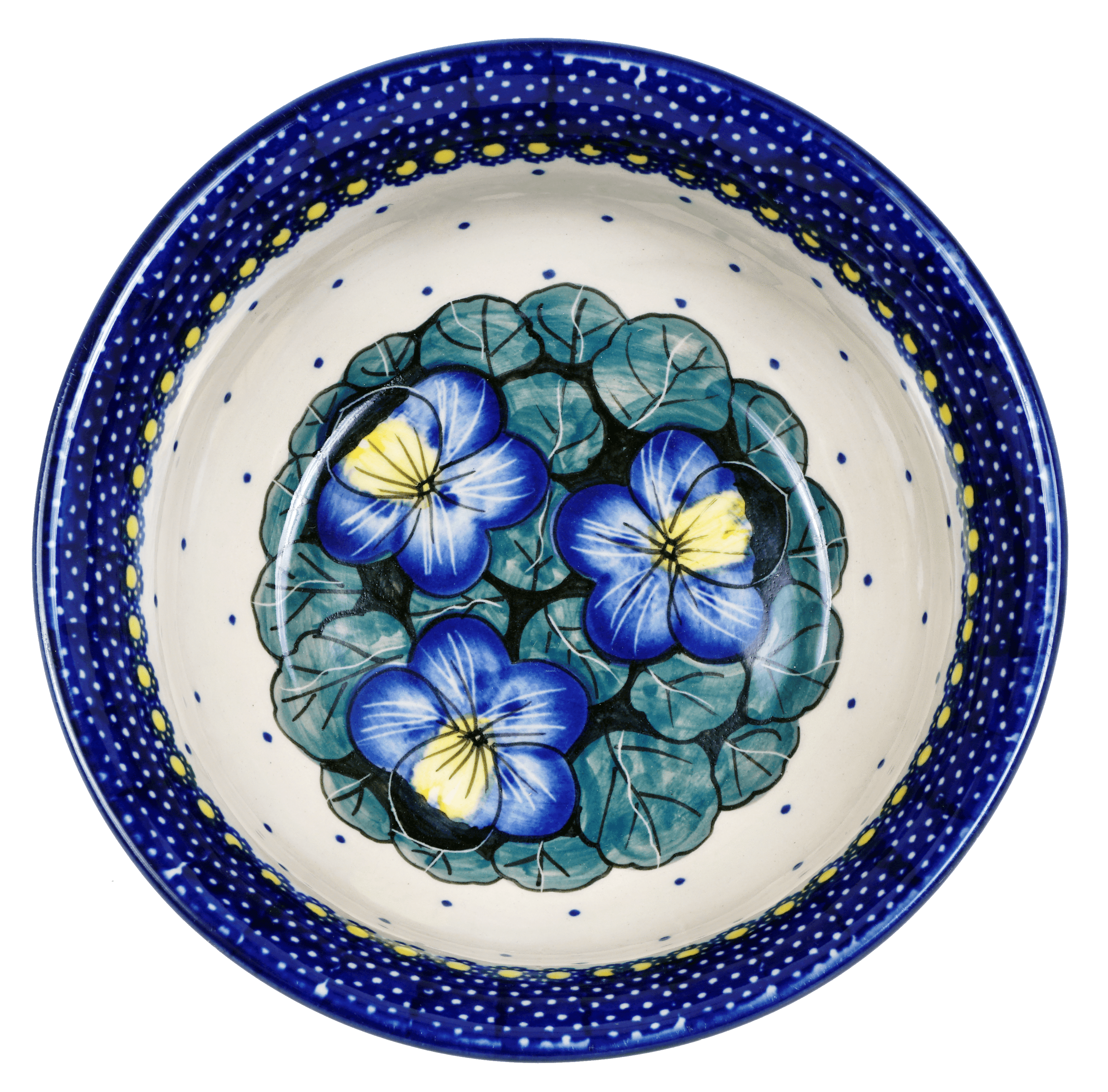 Introducing the Polish Pottery 6.5" Bowl by Manufaktura in the exquisite "Pansies" pattern (JZB). These versatile bowls are not just for soups and salads; they can also be used as charming small mixing bowls! The "Pansies" pattern is a true masterpiece, featuring a captivating blend of blue, white, and green with hints of yellow. The center is adorned with large, intricately detailed flowers in vibrant hues, nestled amidst teal green leaves. As if that wasn't enough, tiny blue dots are playfully scattered around the center, adding an extra touch of whimsy.
