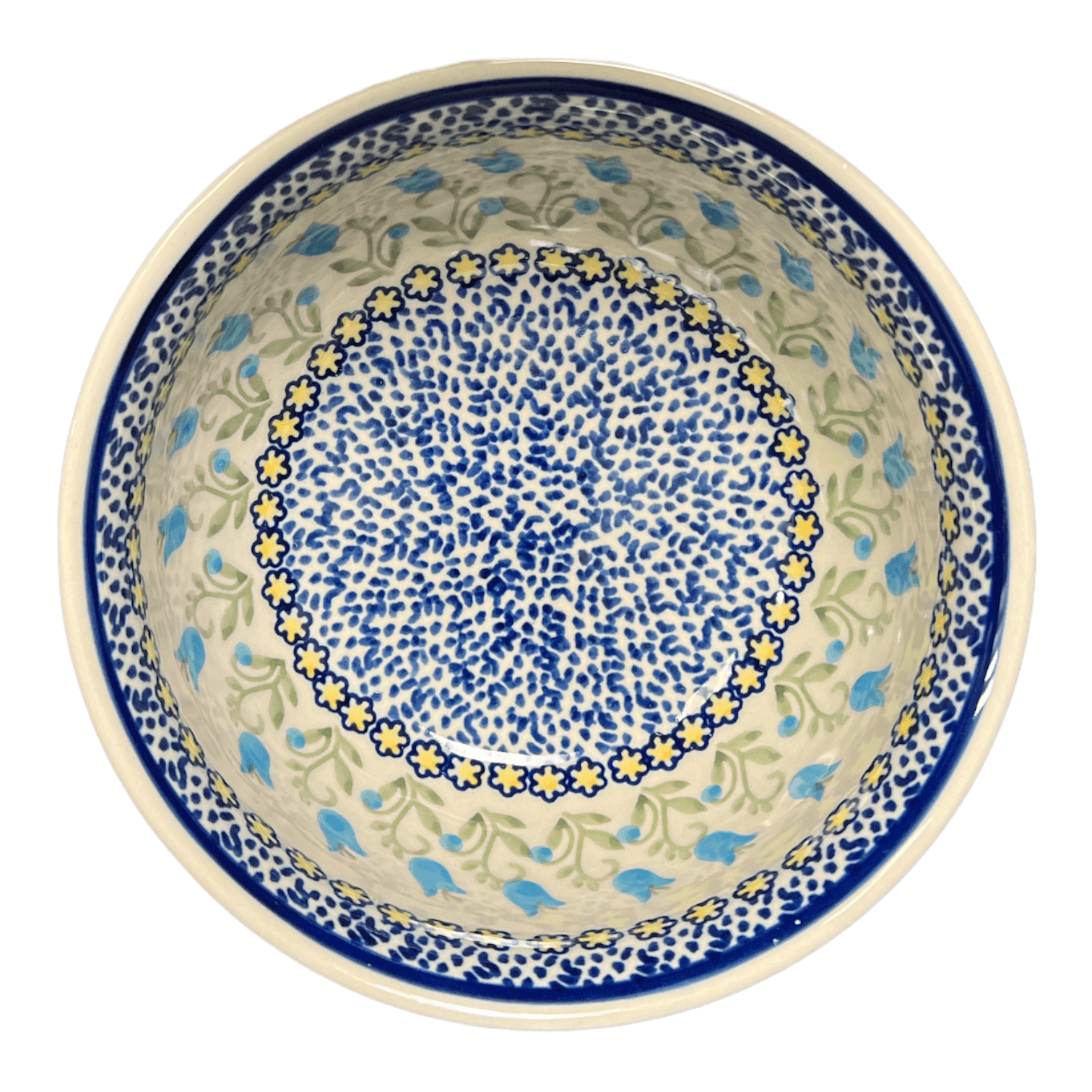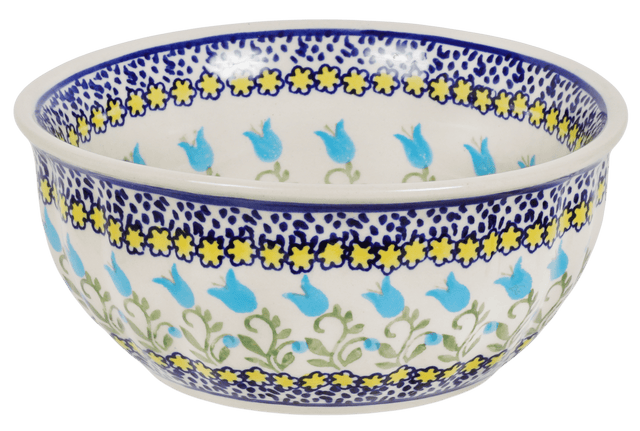 Imagine a dash of elegance and a splash of color that can transform your everyday meals into a delightful experience! Introducing the exquisite Polish Pottery Bowl from Manufaktura, adorned with the enchanting "Riverdance" pattern. This 6.5-inch marvel is not just a bowl; it's a versatile piece of art, perfect for everything from hearty soups and refreshing salads to delectable pastas and even as a handy mixing bowl. The "Riverdance" design weaves a tapestry of light blue hues, accented by vibrant whites and yellows, along with dark blue touches, all set against a crisp white background. Tiny blue leaves and light blue bellflowers dance around green vines, creating a visual feast that's sure to captivate and charm at every meal.