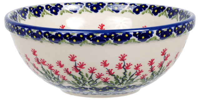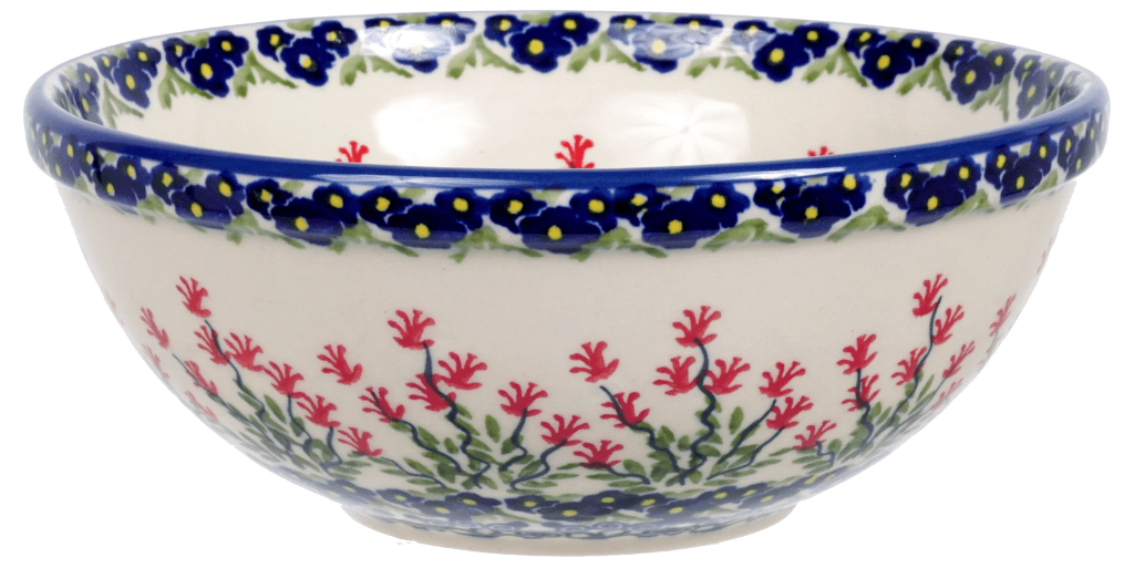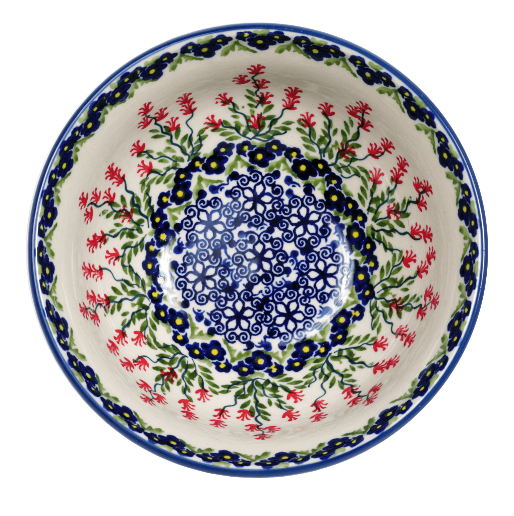 Introducing the enchanting Polish Pottery Bowl from Manufaktura, a true masterpiece crafted in the heart of Boleslawiec, Poland. This delightful 6.75" round bowl is adorned with the "Burning Thistle" pattern, a unique design that showcases a vibrant dance of red, white, blue, and green. Imagine the burst of color and energy this piece brings to your table, turning every meal into a festive occasion. Whether it's a warm soup on a chilly evening, a fresh salad on a sunny day, or a comforting bowl of ice cream, this versatile bowl is perfect for serving your favorite culinary delights!
