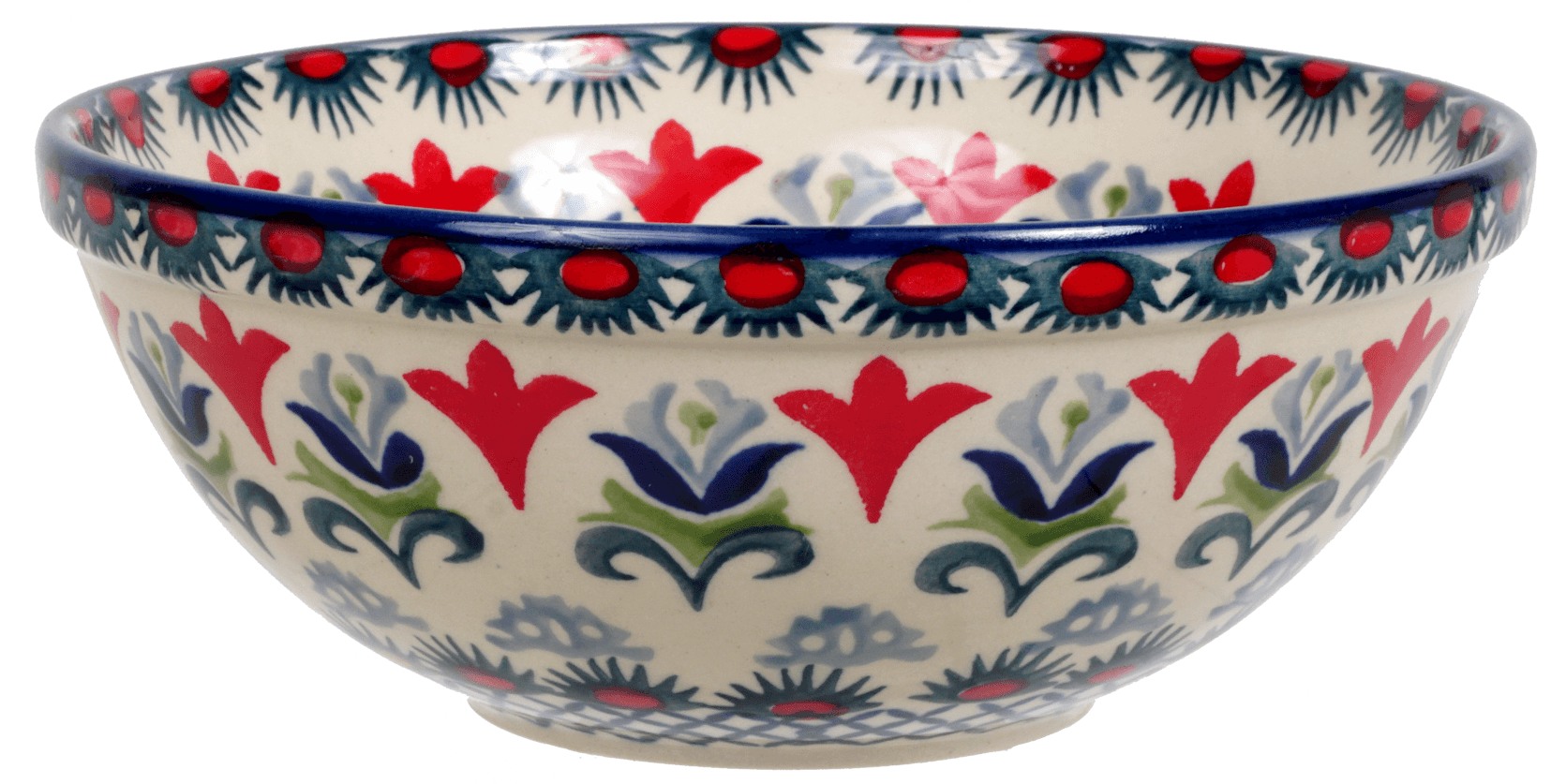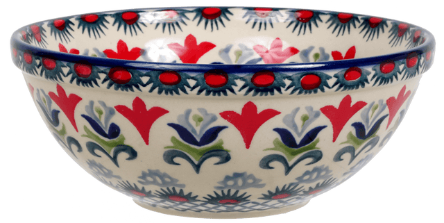 Introducing the exquisite Polish Pottery Bowl from Manufaktura, crafted in the vibrant "Scandinavian Scarlet" pattern, a masterpiece that combines function with flair. This 6.75" round bowl is your new go-to for everything from a comforting morning cereal to a sumptuous evening salad. Each bowl is meticulously hand-painted in Boleslawiec, Poland, by skilled artisans whose attention to detail is evident in every brush stroke. The "Scandinavian Scarlet" design features a stunning white background adorned with a captivating blue geometric weave at the center, surrounded by a dance of bright red bellflowers and lush teal blue blossoms. It's not just a bowl; it's a piece of art that promises to bring a splash of color and a dash of Polish heritage to your dining table.