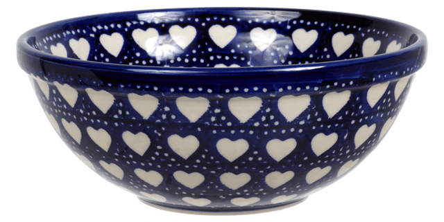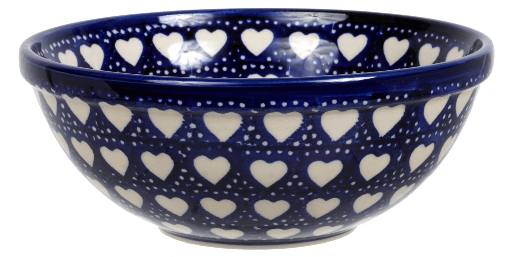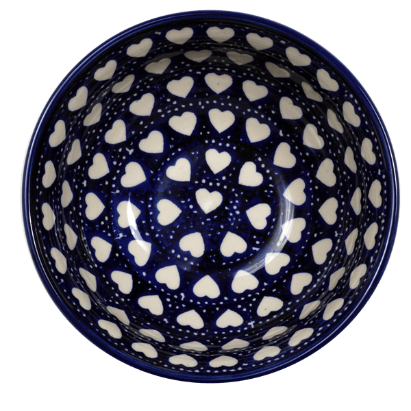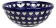 Imagine starting your day with a delightful bowl of cereal or ending it with a comforting serving of soup, all from the exquisite Manufaktura Polish Pottery Bowl. This charming 6.75" bowl, handcrafted in the heart of Boleslawiec, Poland, is not just any ordinary bowl. Adorned with the enchanting "Torrent of Hearts" pattern, it features a serene blue background with whimsical white hearts dancing from the center outward. The traditional artistry of this pattern brings a touch of timeless elegance to your dining table, making every meal a little more special.