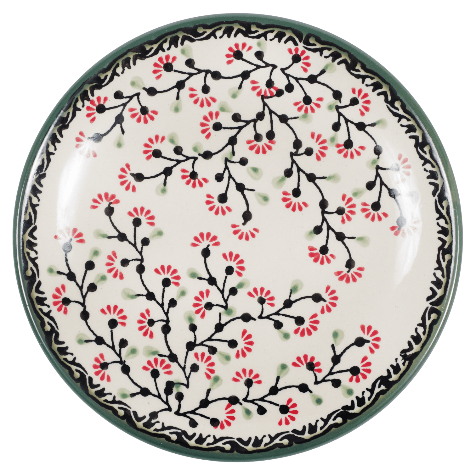 Imagine a dessert plate that not only serves your sweet treats but also captivates your guests with its exquisite artistry. Introducing the Polish Pottery 7.25" Dessert Plate from Manufaktura, crafted in the enchanting "Cherry Blossoms - Solid Rim" pattern. This charming plate features a dance of red cherry blossoms and black vines sprawling across a pristine white background, framed by a vibrant green rim. Each plate is a canvas, displaying a unique floral spectacle that promises to elevate your table setting and enchant your dinner guests. Crafted in Boleslawiec, Poland, this piece is not just a plate, but a gateway to a storied tradition of pottery art.